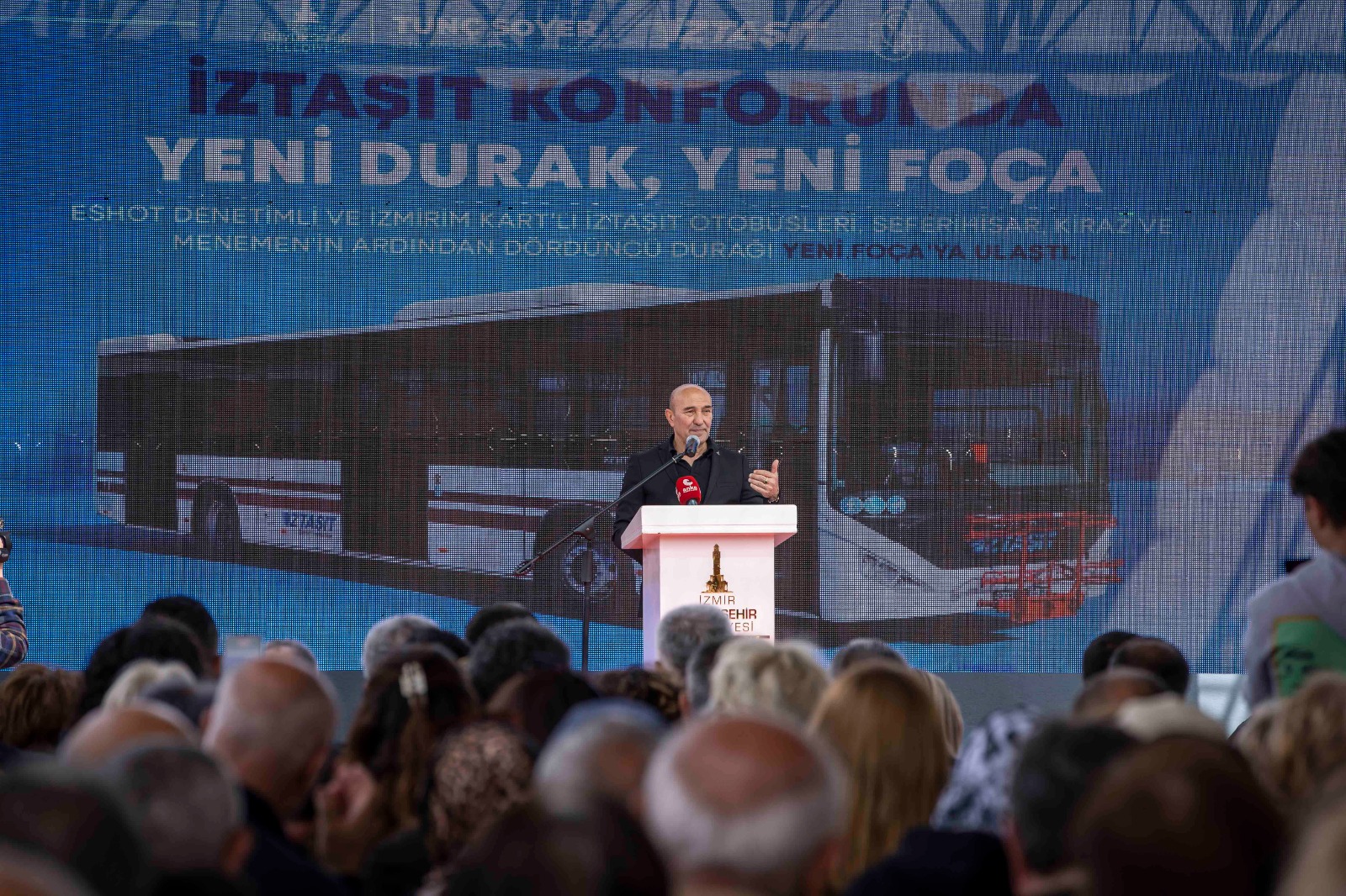 Göreve geldiği 5 yılda 500 yeni otobüs hedefi koyduğunu hatırlatan Başkan Soyer, “İZTAŞIT ve İZULAŞ araçlarıyla toplu ulaşım ağına dâhil edilen yeni araç sayımız, 616’ya ulaştı. Bugün Yeni Foça İZTAŞIT bünyesinde 20 yeni aracın da hizmete başlamasıyla birlikte bu sayı 636 olacak. Öte yandan Nisan 2019’da hayata geçirdiğimiz Halk Taşıt uygulamasıyla 174 milyon binişte İzmirlinin bütçesine 200 milyon lira destek sağladık. İzmir’de ihtiyaç duyulan bölgelere 60 yeni otobüs hattı açtık. ESHOT Genel Müdürlüğümüz, halen kent genelinde toplam 390 hatta 1300’e yakın otobüsle hizmet veriyor. Pandemiye, depremlere, sellere, ekonomik krize ve ülkemizin yaşadığı tüm felaketlere rağmen İzmirlilere verdiğimiz sözleri bir bir, adım adım yerine getiriyoruz ve buna devam edeceğiz” şeklinde konuştu.
