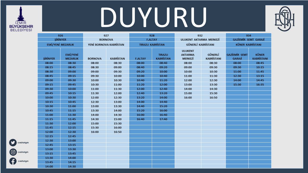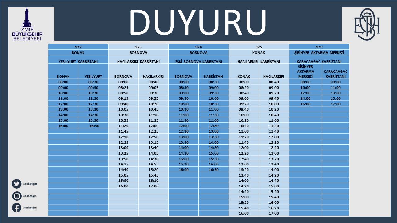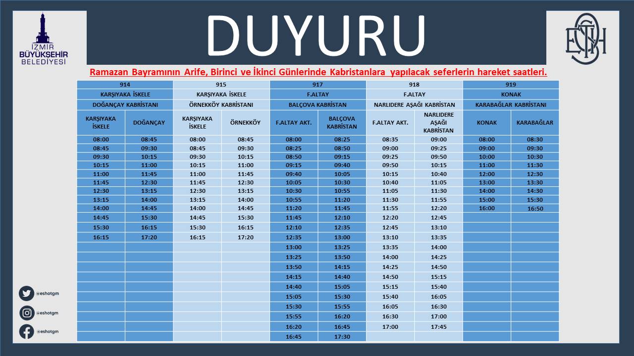 ESHOT Genel Müdürlüğü, arife günü ve bayramın ilk iki günü kabristanlara özel toplam 15 hatta ayrıca hizmet verecek. Baykuş seferleri de bayram boyunca devam edecek. Tüm hatlarda hareket saatleri ve durak bilgileri www.eshot.gov.tr adresinden görülebilir.