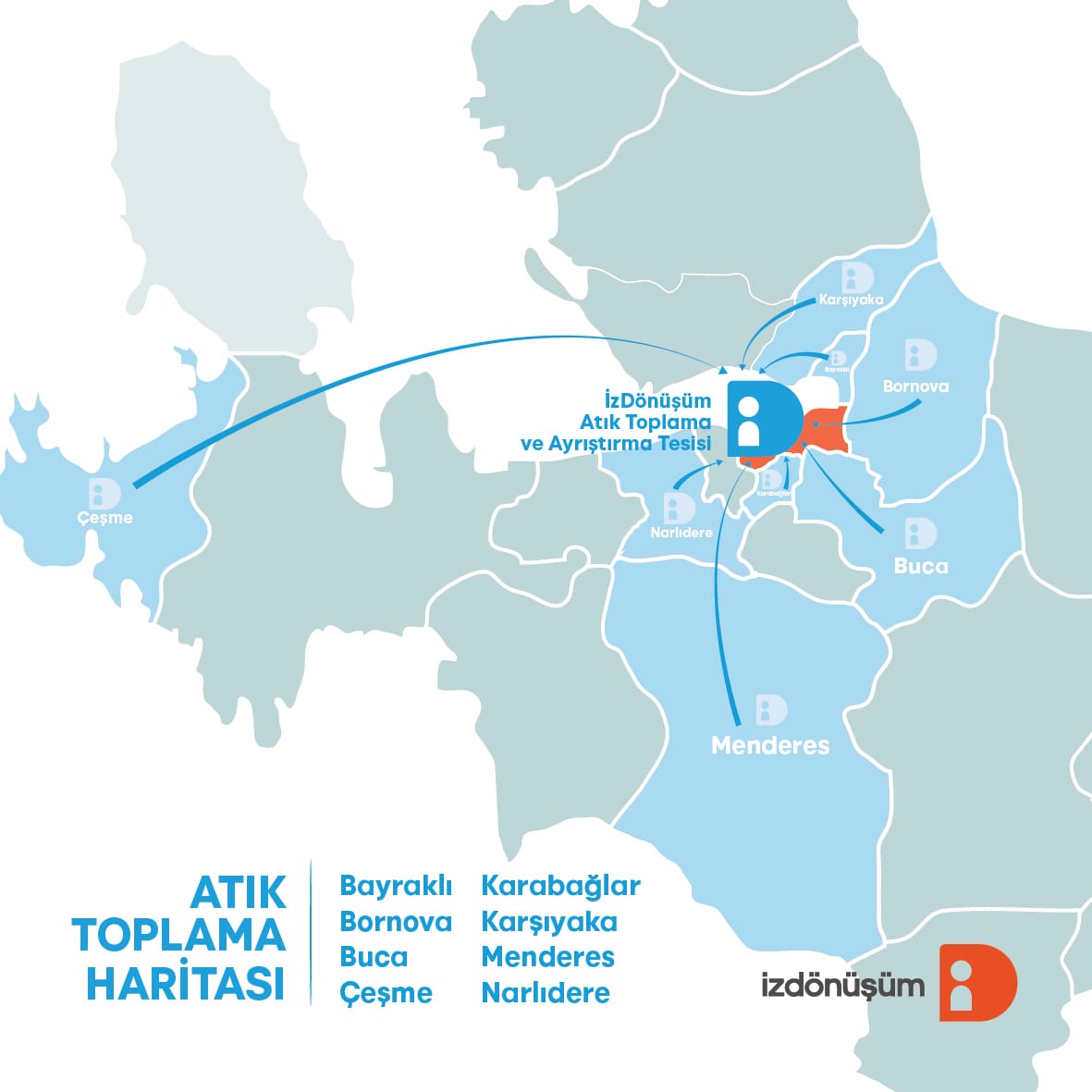 Karşıyaka, Karabağlar, Buca ve Narlıdere'nin ardından Bornova, Bayraklı ve Menderes de İzDönüşüm ağına katıldı. Çeşme'de ise yalnızca tekstil atıkları İzDönüşüm tarafından toplanıyor.