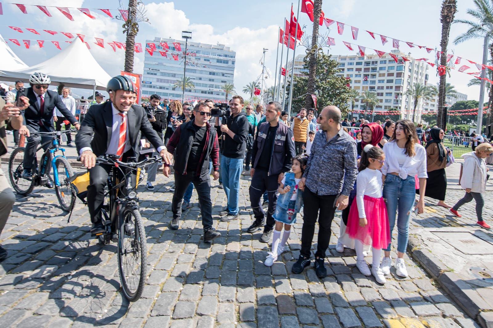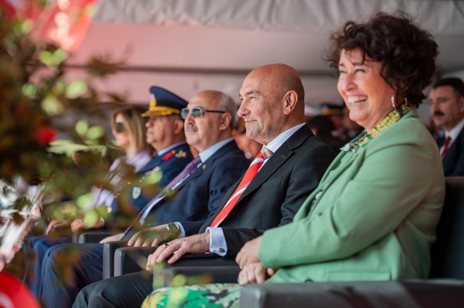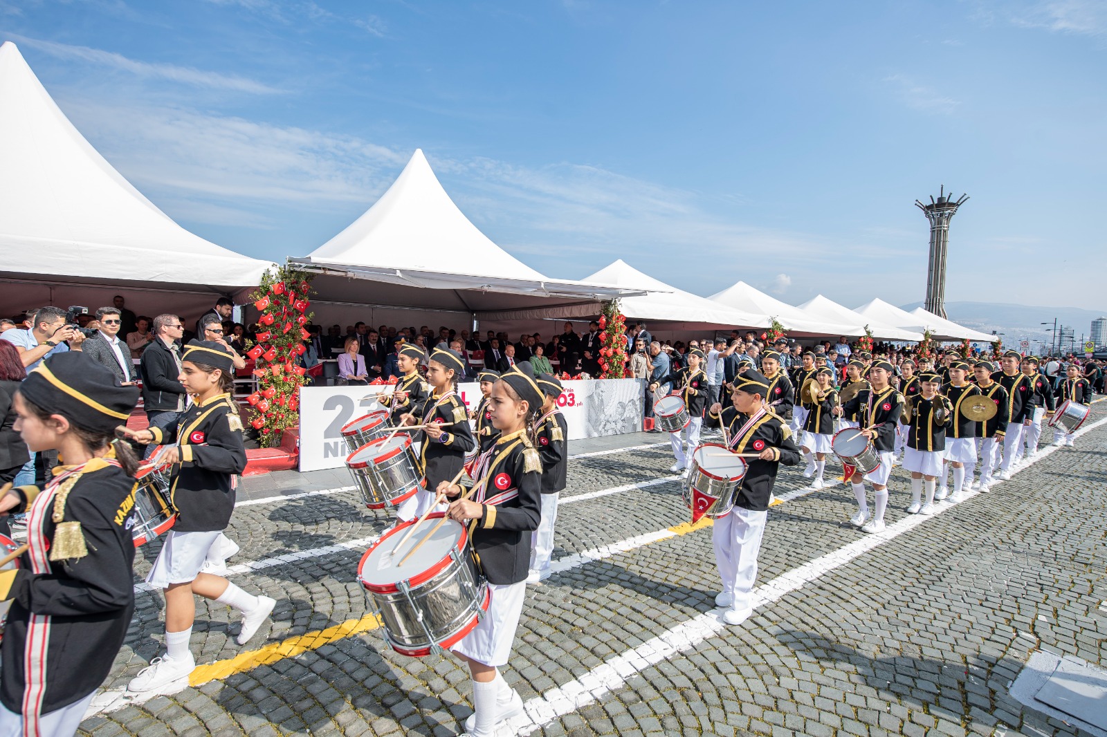 Törende yurttaşlarla bayramlaşan Başkan Tunç Soyer, çocuklarla hatıra fotoğrafı çektirdi. Cumhuriyet Meydanı'ndaki tören ilk ve orta öğretim kurumları öğrencilerinin gösterileri ile renklendi. Türk Halk Müziği korosundan bando takımına ve danslara kadar miniklerin sergiledikleri gösteriler izleyenleri büyüledi.