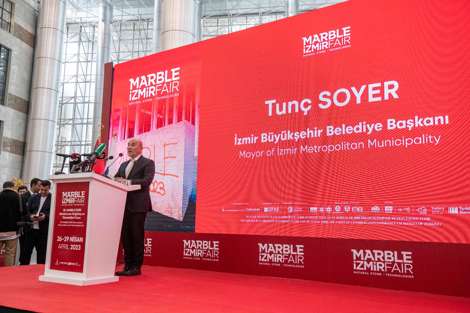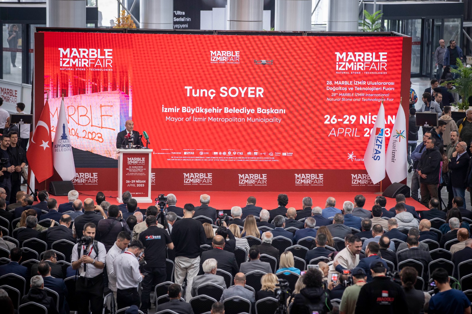 Açılış töreninde Marble İzmir'in, dünyanın en büyük doğal taş fuarı ve doğal taş sektörünün dünyaya açılan kapısı olduğunu söyleyen İzmir Büyükşehir Belediye Başkanı Tunç Soyer, “Marble İzmir, şehrimizin Türkiye’ye ve dünya fuarcılığına bir armağanı. İçerisinden geçtiğimiz bu ekonomik darboğazda dış ticaret hacmimizi artırmak ve bu toprakların bereketini büyütecek katma değeri yaratmak zorundayız. Bu noktada, doğal taş sektörü önemli bir ihtiyaca cevap veriyor. Ülkemiz, dünya doğal taş rezervinde çok önemli bir konuma sahip. Bu yeterli mi? Tabii ki değil. Bu hammaddeyi işlememiz, sektördeki emekçilerimizin özenli işçiliği ve hüneri sayesinde katma değeri yüksek ürünlere dönüştürmemiz şart. Bu nedenle Marble İzmir fuarında, doğal taş sektöründeki katma değerli ürünlerin çoğalması için elimizden ne geliyorsa yapıyoruz” dedi.