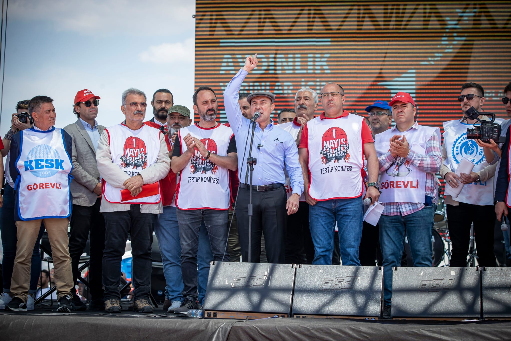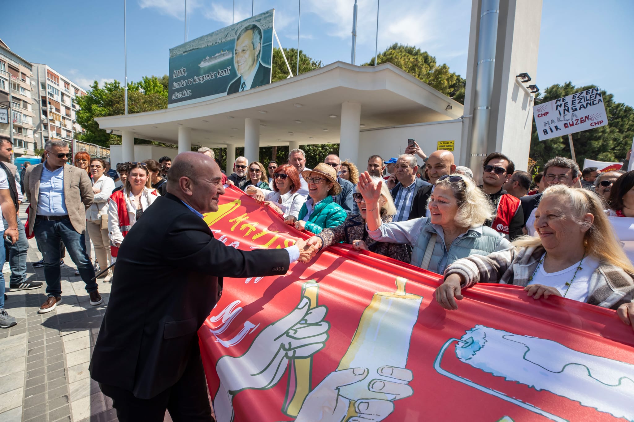 Alanda konuşan Başkan Tunç Soyer, “On yıllardır emeğin hakkının gasp edildiği, alın terinin yok sayıldığı, haklarımızın elinden alındığı bir düzen içinde yaşadık. İlk defa bu düzeni değiştirmeye çok yakınız. Çok yakında hakkımızı gasp eden o çeteler, o zümreler var ya, onların elinden hepsini geri alacağız, halkımıza geri vereceğiz. Çok az kaldı. Bugüne kadar birçoğumuzu gömmeye çalıştılar; Deniz’ler, Ali İsmail’ler, Uğur Mumcu’lar… Ama biz tohumuz, gömüldükçe daha çok geliriz. Çoğalarak geliriz. Bundan sonra da çoğalmaya devam edeceğiz. Halktan, emekten yana iktidarı hep beraber kuracağız. Gün gelir zorbalar kalmaz gider. O güne çok az kaldı. O zorbalar tıpış tıpış gidecekler. Hakkımızı söke söke alacağız, hem de demokrasiyle oyumuzla. Bir şey değişecek her şey değişecek” dedi.