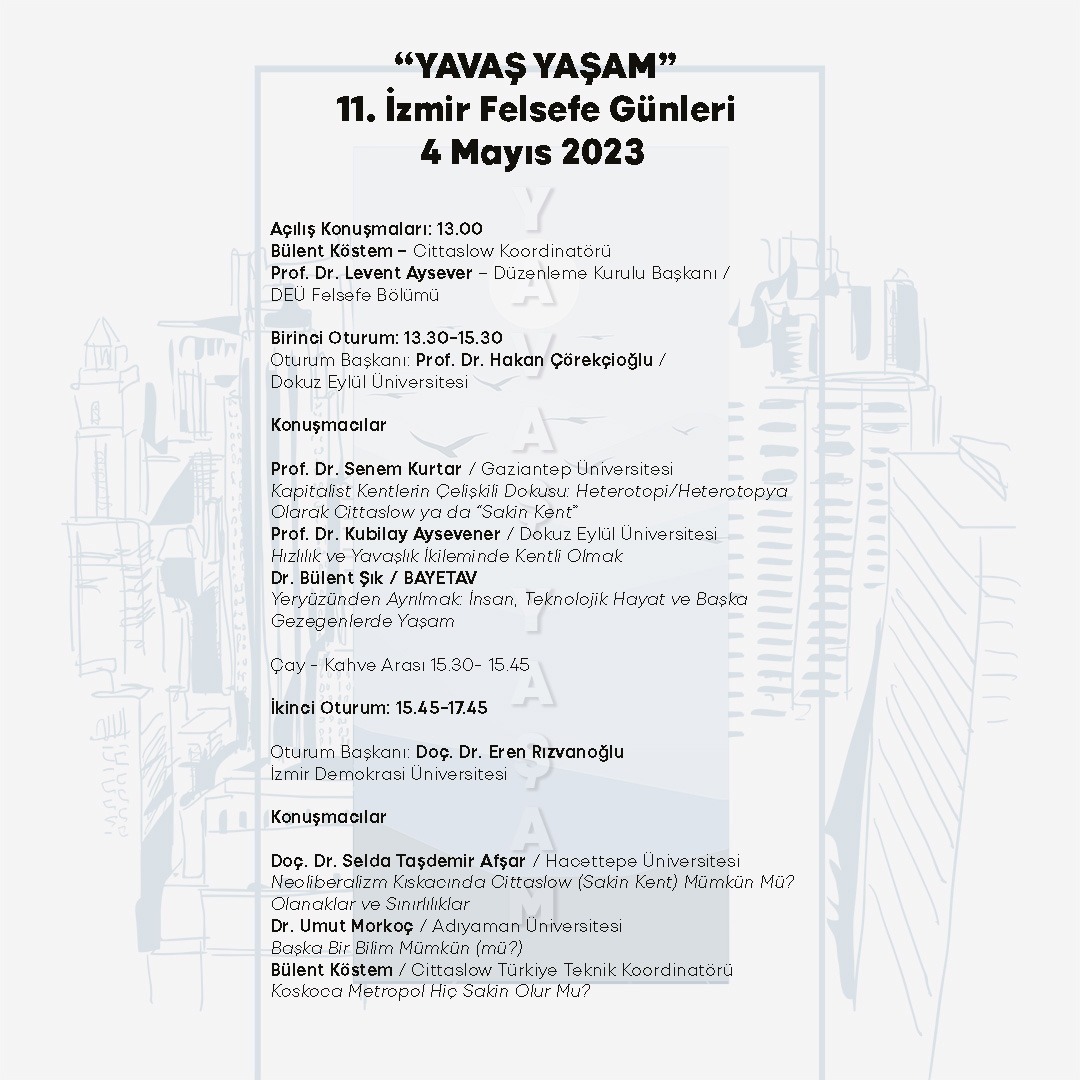 İzmir Büyükşehir Belediyesi ve Dokuz Eylül Üniversitesi Felsefe Bölümü işbirliğiyle, 4 Mayıs’ta Ahmed Adnan Saygun Sanat Merkezi’nde “Yavaş Yaşam” temasıyla 11. İzmir Felsefe Günleri düzenleniyor.