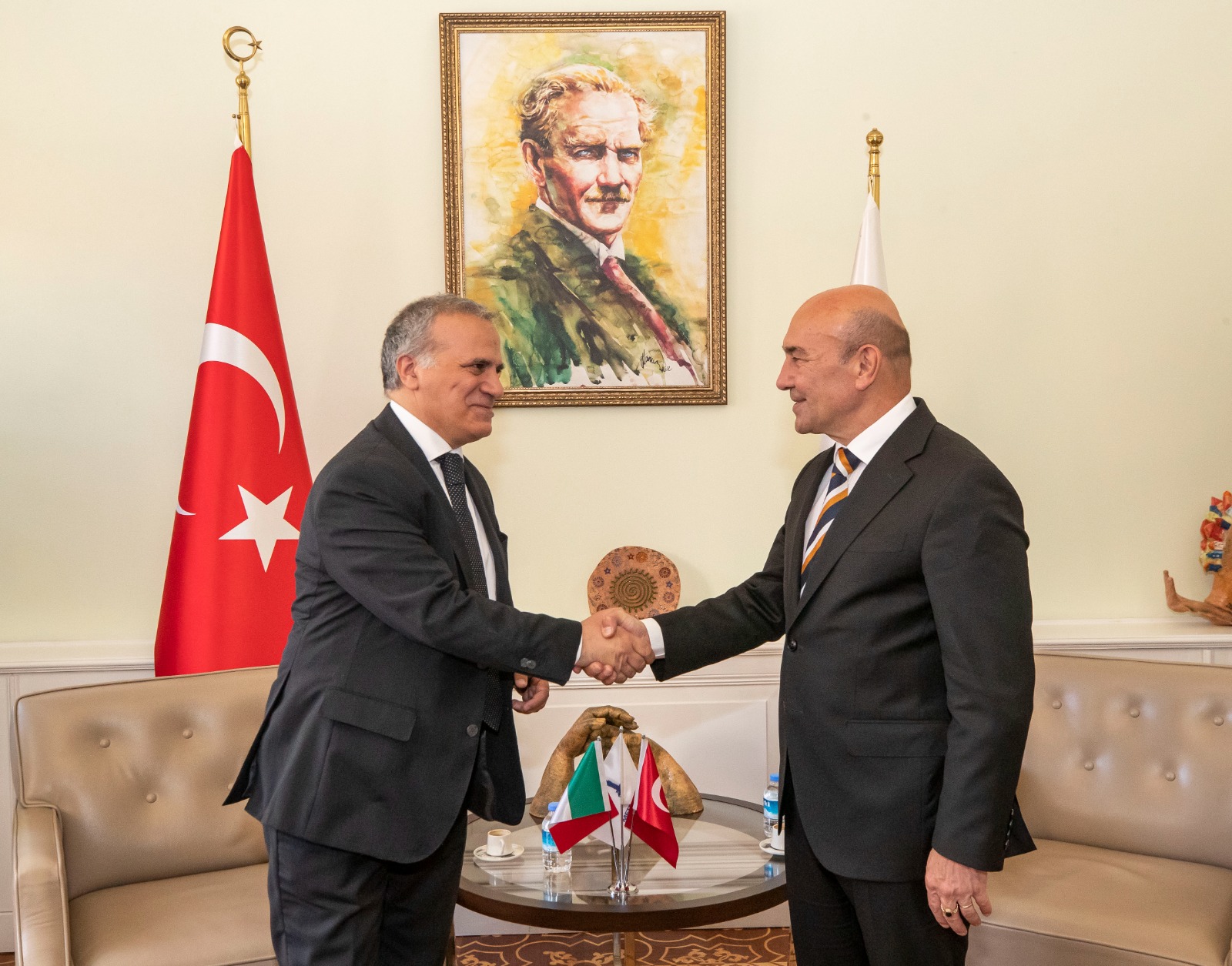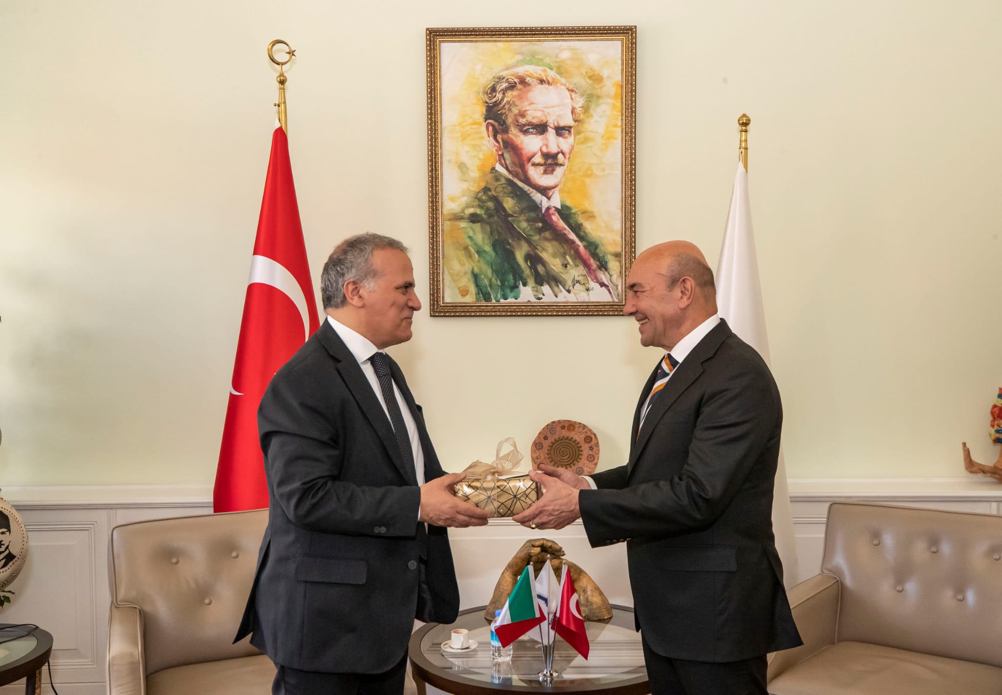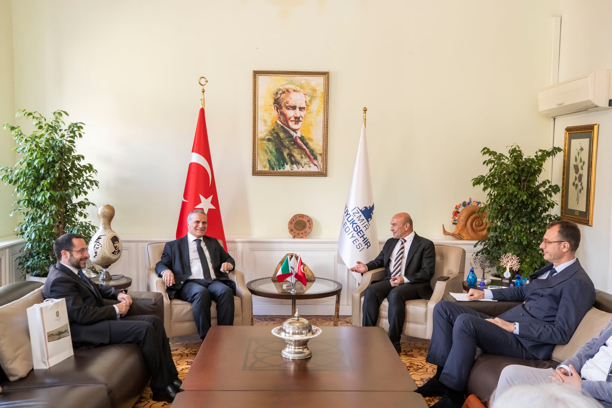 Ahmed Adnan Saygun Sanat Merkezi’nde açılan “İtalya’ya Yolculuk: Deniz ve Dağ” sergisi ve İtalya’nın İzmir Konsolosluk Binası’nın açılışı için İzmir’e gelen İtalya’nın Türkiye Büyükelçisi Giorgio Marrapodi, İzmir Büyükşehir Belediye Başkanı Tunç Soyer’i makamında ziyaret etti. Ziyarette İtalya İzmir Konsolosu Valerio Giorgio, İzmir Büyükşehir Belediye Başkan Danışmanı Onur Eryüce ve Ruhisu Can Al, İZFAŞ Uluslararası İlişkiler Koordinatörü Tuğçe Cumalıoğlu da yer aldı.