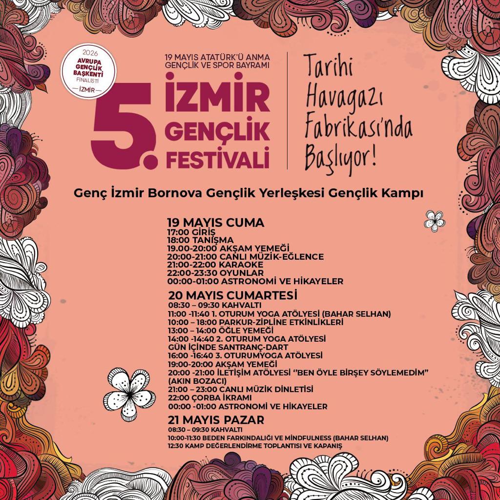 Türkiye’nin dört bir yanından kente gelen gençler, 19 Mayıs coşkusunu bu sene de İzmir’de doyasıya yaşayacak. İzmir Büyükşehir Belediyesi'nin 19 Mayıs Atatürk’ü Anma, Gençlik ve Spor Bayramı etkinlikleri kapsamında düzenleyeceği, Türkiye’nin en iyi festivali ödülünü alan İzmir Gençlik Festivali, beşinci kez gençlere bayram coşkusu yaşatacak. 18-19 Mayıs tarihlerinde Tarihi Havagazı Fabrikası Gençlik Yerleşkesi’nde düzenlenecek festival, 2026 Avrupa Gençlik Başkenti finalisti İzmir’in adını tüm dünyaya duyuracak.