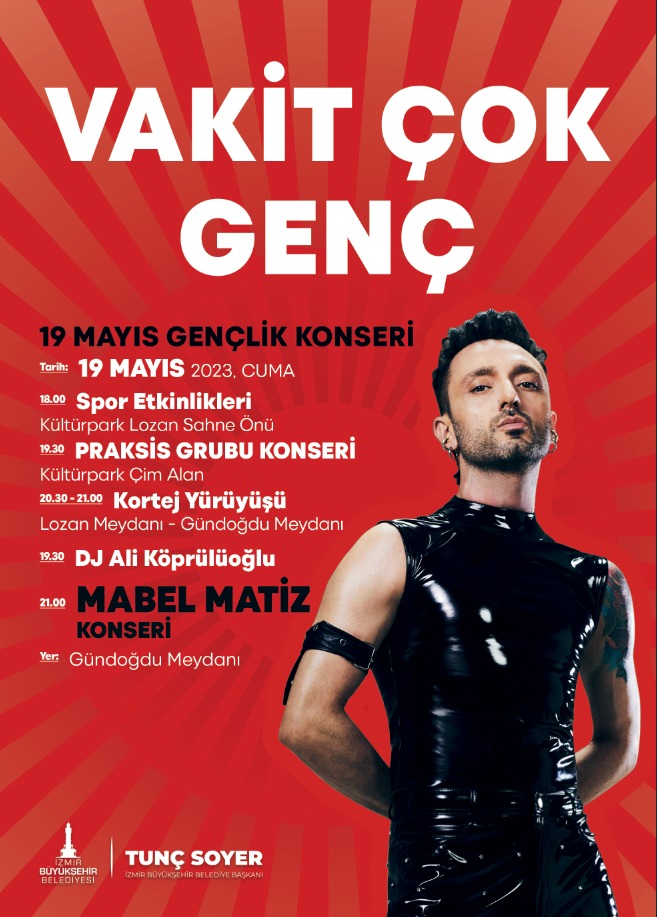 İzmir Büyükşehir Belediyesi 19 Mayıs’ta gençler için bir dizi etkinlik düzenliyor. 18-19 Mayıs tarihlerinde İzmir Gençlik Festivali’ne 5. kez ev sahipliği yapacak Büyükşehir Belediyesi, birbirinden renkli etkinliklerle kentte tam bir bayram havası yaşatacak. 19 Mayıs’ta Lozan Meydanı’ndan Gündoğdu’ya doğru yapılacak gençlik yürüyüşüne Başkan Tunç Soyer de katılacak. Gündoğdu Meydanı’nda saat 21.00’de ise Mabel Matiz konseri var.