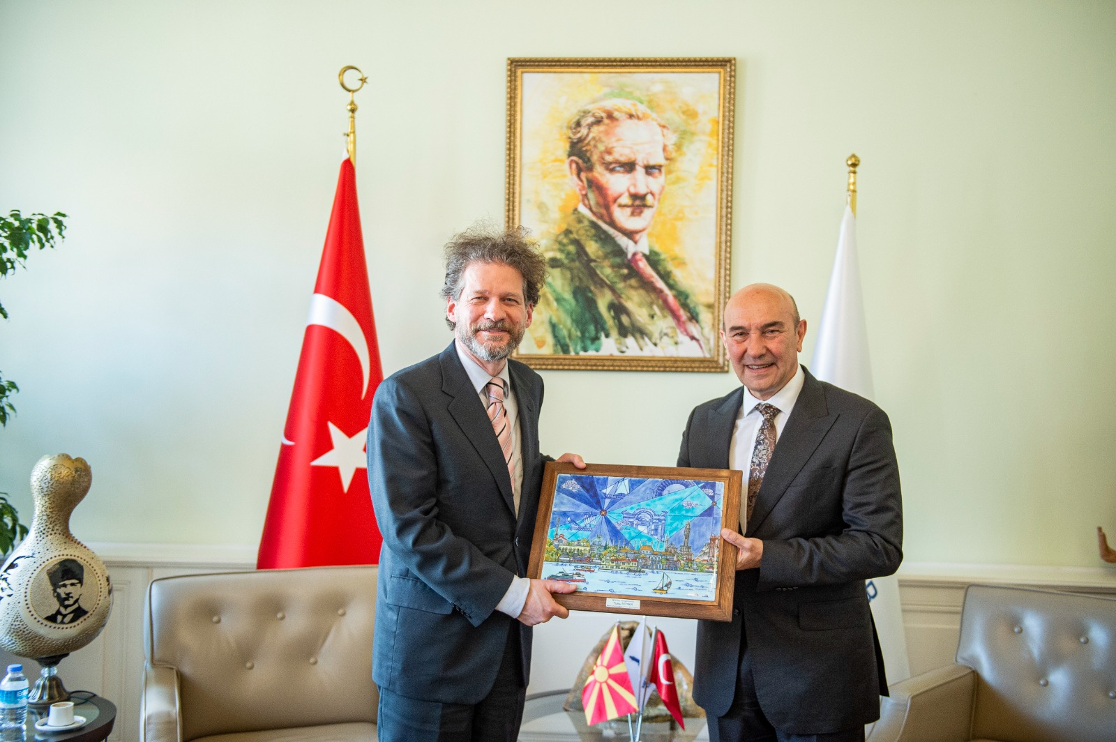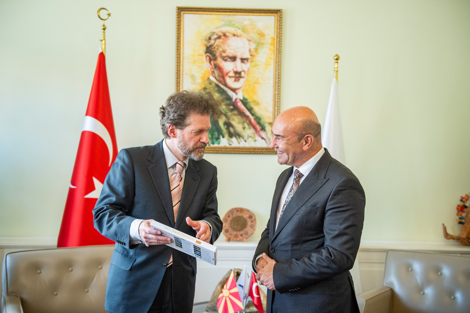 İzmir Büyükşehir Belediye Başkanı Tunç Soyer, Kuzey Makedonya’nın Ankara Büyükelçisi Jovan Manasijevski’i makamında ağırladı. Yeni işbirliklerine hazır olduklarını belirten Başkan Soyer, “Halklar yakınlaşınca ticaret kendiliğinden gelişecektir” dedi.
