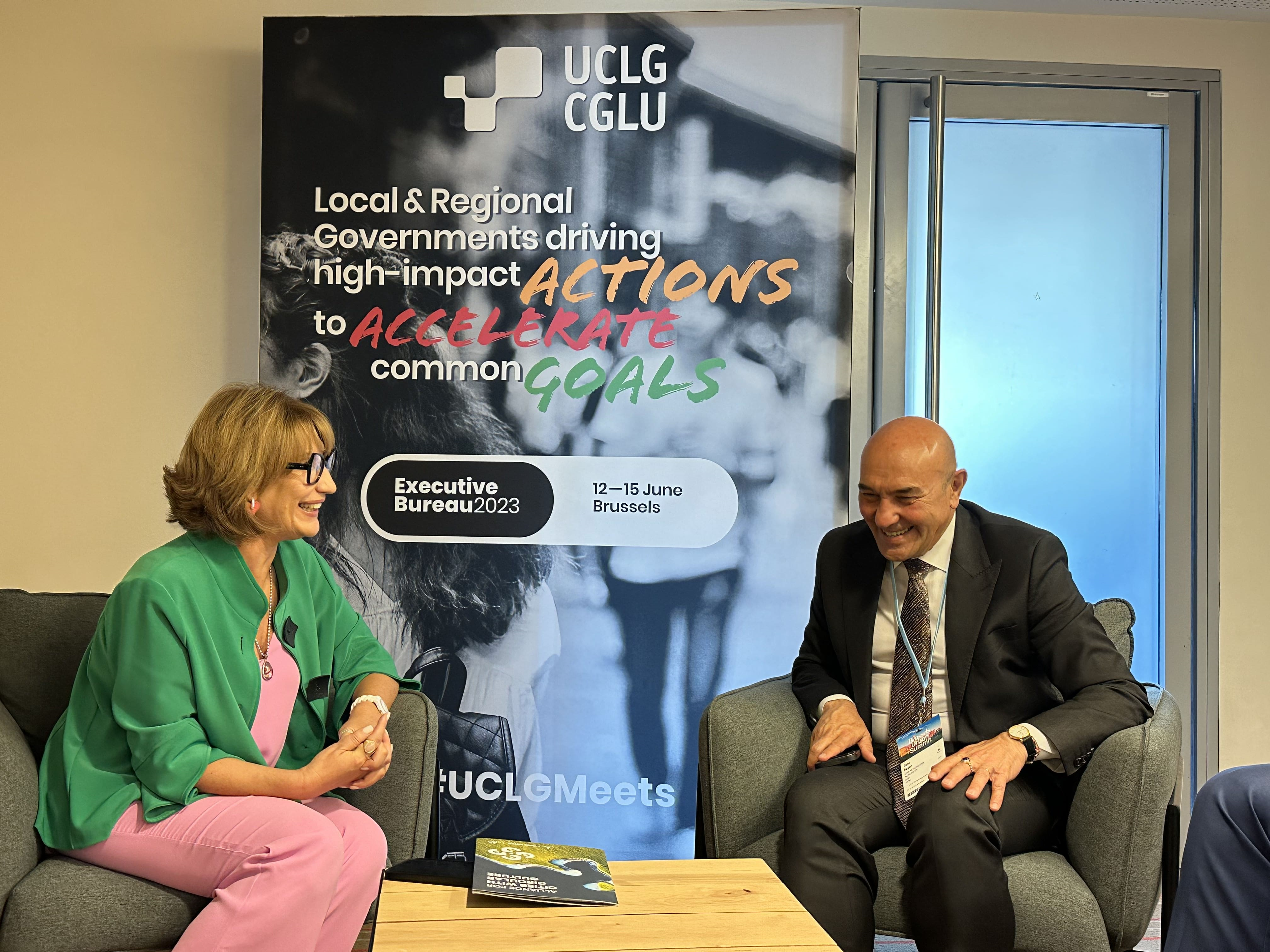 Aynı zamanda Dünya Belediyeler Birliği (UCLG) Yönetim Kurulu Üyesi ve Dünya Konseyi Üyesi olan Başkan Soyer, Brüksel Kent Zirvesi kapsamında UCLG Yönetim Kurulu toplantısına da katıldı. Toplantının öncesinde Başkan Soyer, UCLG Genel Sekreteri Emilia Saiz ile görüşerek düzenlenebilecek ortak etkinliklerle ilgili görüş alışverişinde bulundu. İzmir 2021’de “Döngüsel Kültür” kavramının ortaya koyulduğu UCLG Kültür Zirvesi’ne ev sahipliği yapmıştı.
