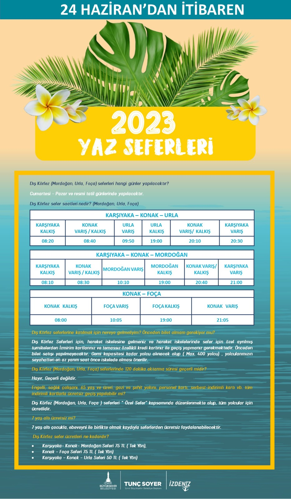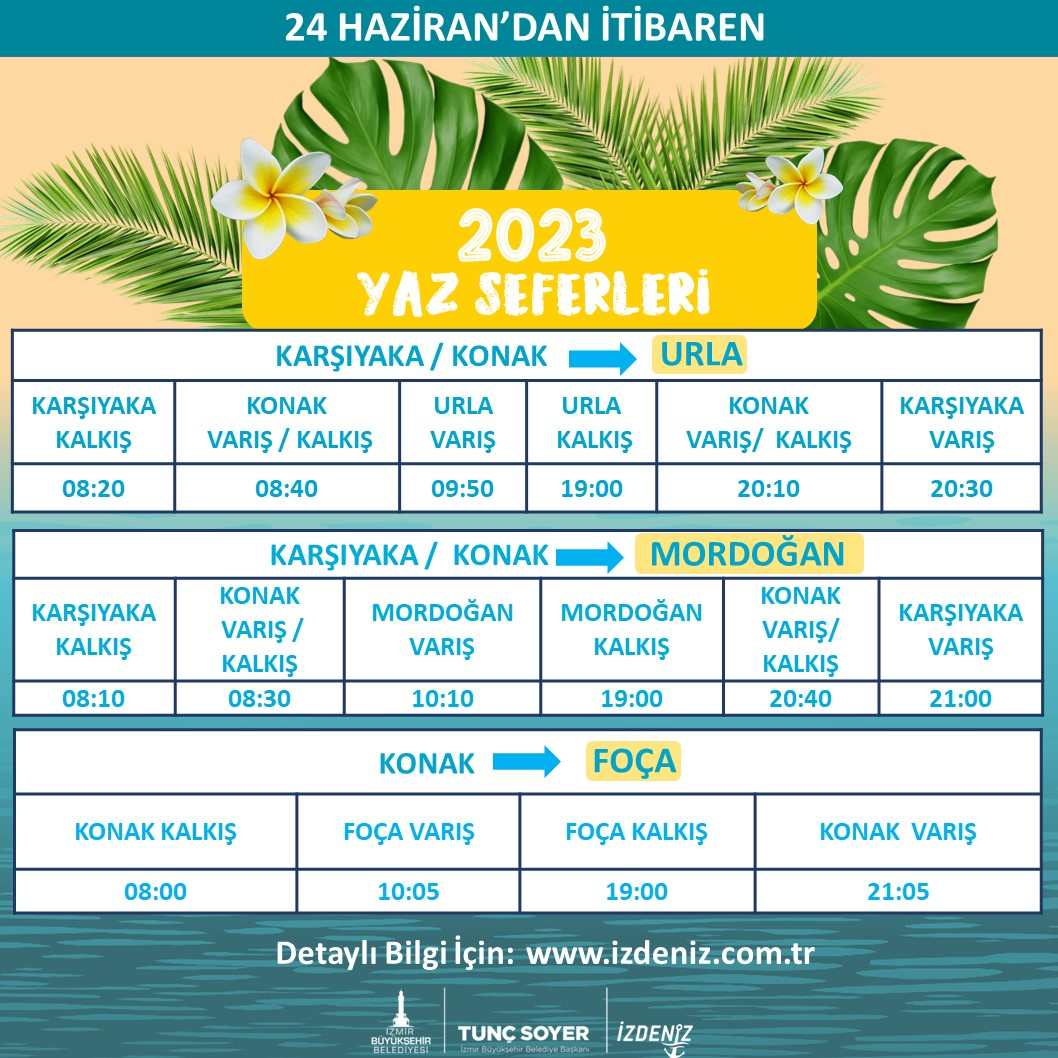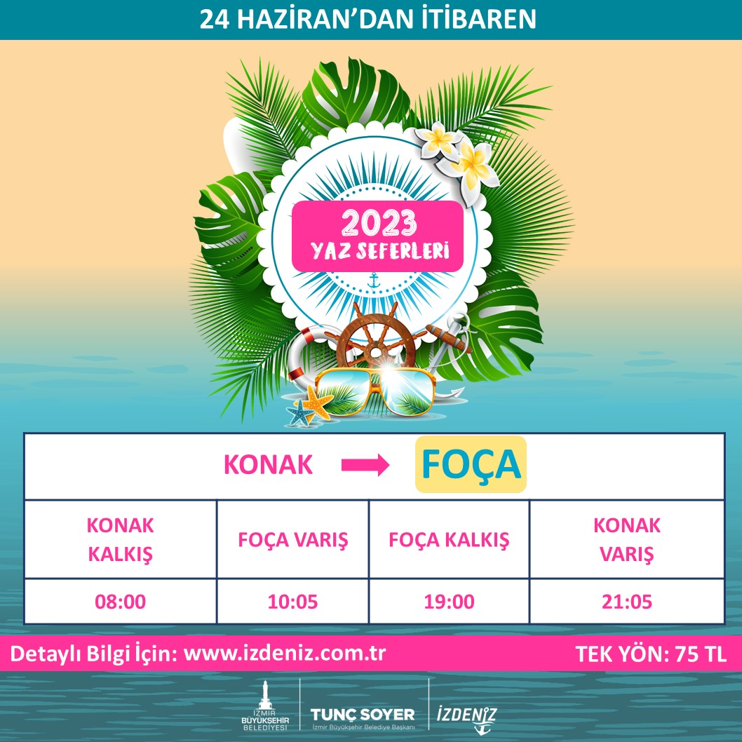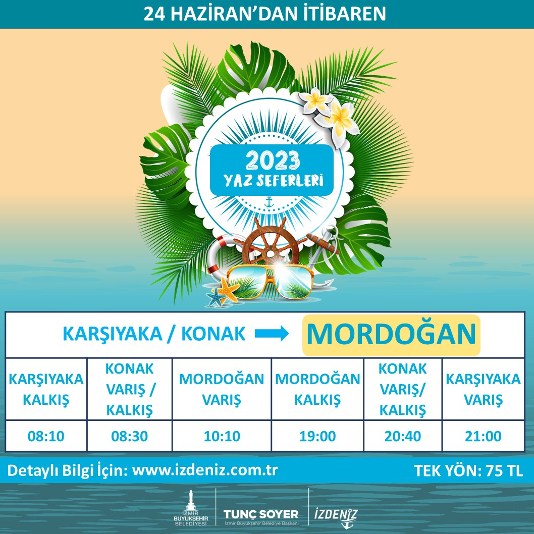 İzmir Büyükşehir Belediyesi İZDENİZ Genel Müdürlüğü, yaz seferlerine başlıyor. İzmirlilerin yazlık ilçelere deniz yoluyla ulaşımını sağlayacak seferler, 24 Haziran Cumartesi gününden itibaren Foça, Urla ve Mordoğan’da başlayacak. 3 Eylül Pazar gününe kadar devam edecek seferler hafta sonları ve resmi tatillerde yapılacak.