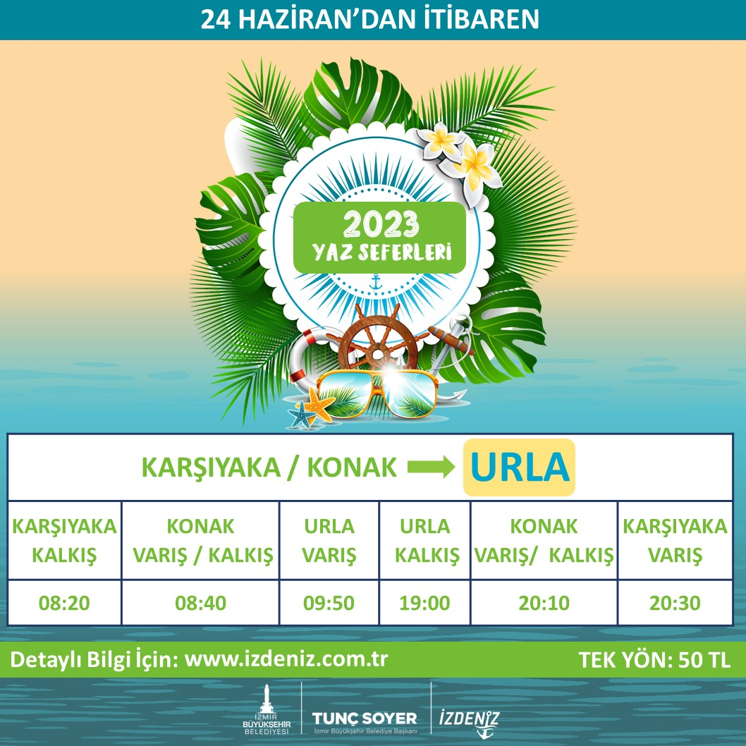 Karşıyaka-Konak-Urla gemisi, 08.20’de Karşıyaka’dan, 08.40’da Konak’tan kalkacak; 09.50’de Urla’ya varacak. Dönüşte Urla’dan 19.00’da kalkacak gemi, 20.10’da Konak’ta ve 20.30’da Karşıyaka’da olacak.