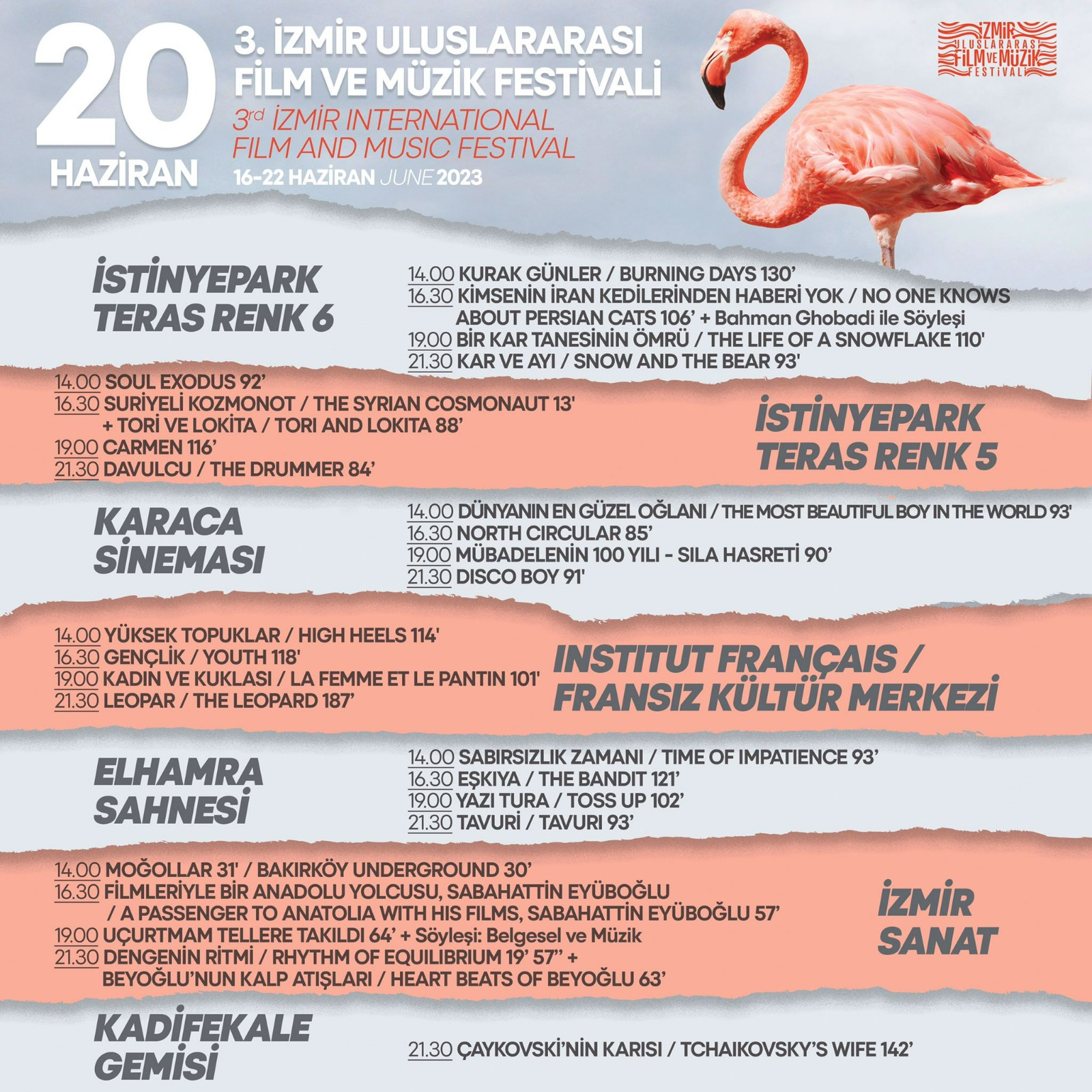 22 Haziran’a kadar devam edecek 3. İzmir Uluslararası Film ve Müzik Festivali’nde 7 farklı lokasyonda düzenlenen ücretsiz film gösterimleri İstinyePark Teras Renk Sinemaları, Elhamra Sahnesi, Karaca Sineması, İzmir Fransız Kültür Merkezi, İzmir Sanat ve açık hava film gösterimlerinin yapılacağı Göztepe vapur iskelesindeki Kadifekale Gemisi’nde devam ediyor. Ayrıntılı bilgiye festivalin sosyal medya hesaplarından (Instagram ve facebook’ta izmirfilmmusicfest / twitter’da @izmirfilmmusic), kultursanat.izmir.bel.tr, izmirart ve https://www.ifmfest.com adreslerinden ulaşılabilir.