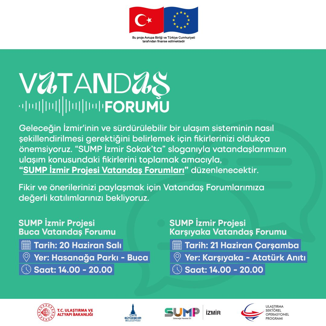 Tüm yurttaşların katılım sağlayabileceği forumların ilki 20 Haziran Salı günü Buca Hasanağa Bahçesi’nde düzenlenecek. Karşıyaka Vatandaş Forumu ise 21 Haziran Çarşamba günü 14.00-20.00 saatleri arasında Karşıyaka Atatürk Anıtı’nın bulunduğu meydanda yapılacak.