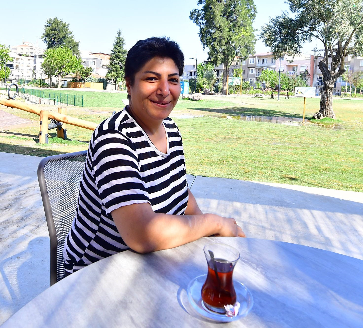 Gülşah Muslu: “Daha önce fidanlıktı burası. Şimdi ferahlayabileceğimiz, köpeklerimizi gezdirebileceğimiz, oturup bir çay içebileceğimiz bir alanımız oldu. Ben hemen hemen her sabah hava almak, çay içmek, hatta kahvaltı yapmak için geliyorum. Kafeteryadaki yiyecek içecekler de çok uygun fiyatlı olduğu için çoğu zaman kahvaltımızı burada yapıyoruz.”