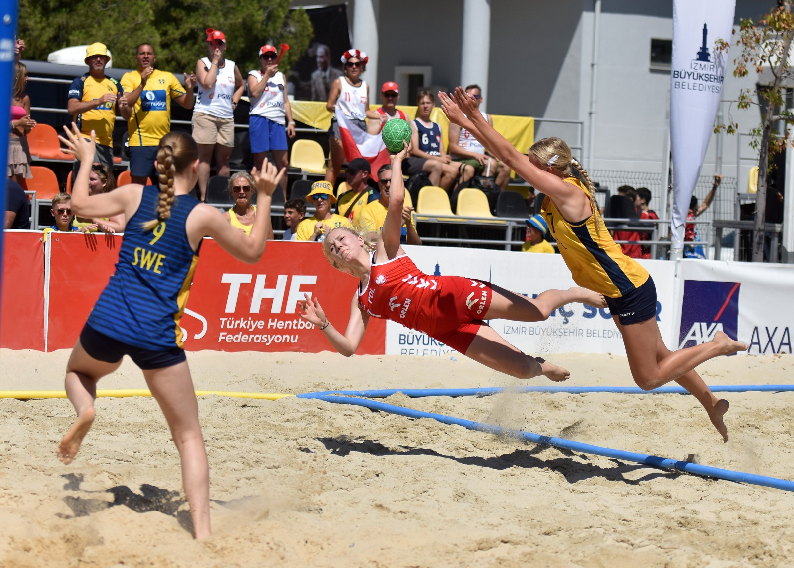 İzmir Büyükşehir Belediyesi'nin plaj sporlarının merkezi olarak hizmete sunduğu İnciraltı Spor Tesisleri'nde düzenlenen EHF Avrupa U17 Plaj Hentbolu Şampiyonası'nda heyecan tüm hızıyla devam ediyor. Avrupa Hentbol Federasyonu, Türkiye Hentbol Federasyonu ve İzmir Büyükşehir Belediyesi işbirliği ile düzenlenen şampiyonanın ikinci gününde millilerimiz, erkeklerde Ukrayna'ya 2-1 yenildi. Öğleden sonraki seride erkekler Çekya ile kız takımımız ise İsviçre ile karşılaşacak.. Cumartesi günü erkeklerde ve kadınlarda ana tabloya çıkan takımlar belli olacak. Pazar günü ise final karşılaşmaları oynanacak. Maçlar EHF TV ve Spor DSmart ve Dsmart GO'da canlı yayınlanacak.
