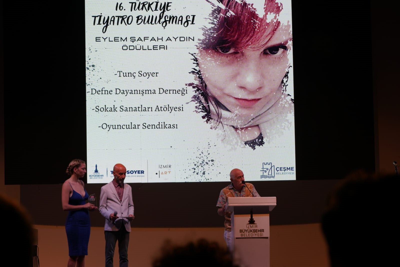 İzmir Büyükşehir Belediye Başkanı Tunç Soyer, 16. Türkiye Tiyatro Buluşması’nda sanatçı Orhan Aydın’ın depremde hayatını kaybeden kızı Eylem Şafak Aydın’a atfedilen Dayanışma Ödülü’ne layık görüldü.