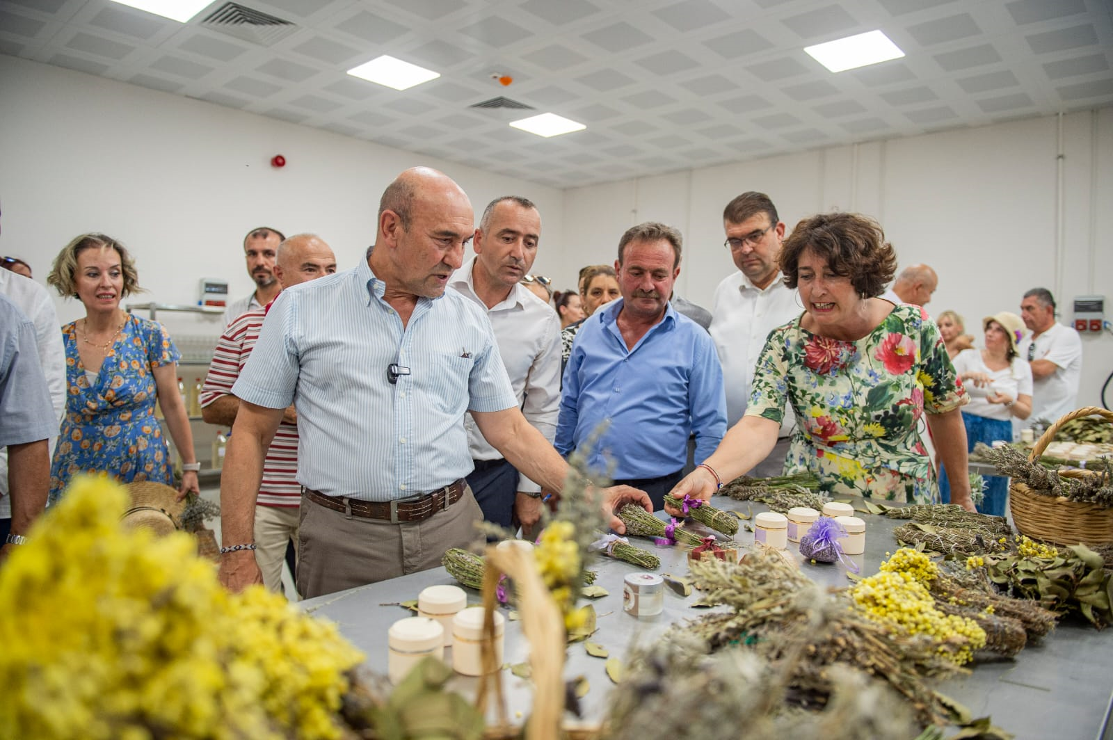 Lavantalarla karşılanan Başkan Tunç Soyer, tesisteki Tıbbi Aromatik Bitki Açıkhava Müzesi, üretici stantlarını gezdi; işleme ünitelerini inceledi. Başkan Soyer, geçtiğimiz haftalarda Seferihisar’ın Turgut Köyü’nde hasat ettiği lavantaları Kozmetik Köy Tesisi’nde işleyerek lavanta yağı, kremi ve kolonyası elde etti. Gezinin ardından Başkan Soyer, geleneksel uğur testisini kırarak tesisi hizmete açtı.
