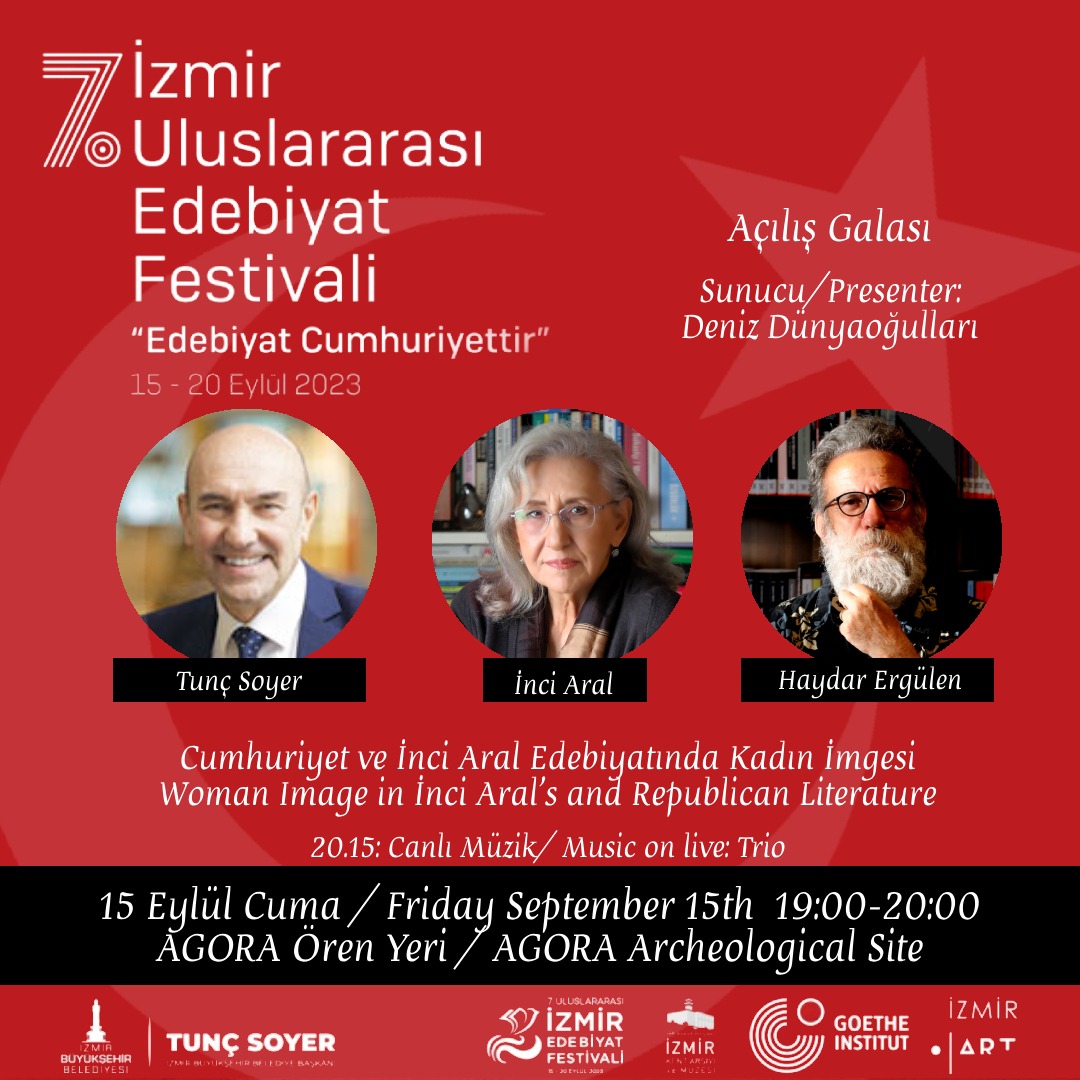 Bu yıl 7.’si düzenlenecek Uluslararası İzmir Edebiyat Festivali 15 – 20 Eylül tarihleri arasında edebiyat dünyasının önemli isimlerini İzmir'de buluşturacak. Festival, Cumhuriyet’in 100. kuruluş yıl dönümü nedeniyle “Edebiyat Cumhuriyettir” temasıyla 15 Eylül’de saat 19.00’da Agora Arkeolojik Kazı Alanı'ndaki açılış töreni ile başlayacak. Direktörlüğünü Haydar Ergülen’in yaptığı festivalin onur konuğu sanatçısı İnci Aral olacak. Ülkenin ve dünyanın dört bir köşesinden pek çok ünlü yazar ve edebiyatçıya ev sahipliği yapacak festivalde kentin farklı bölgelerinde panel, söyleşi, şiir dinletileri yapılacak ve tiyatro oyunları sahnelenecek.