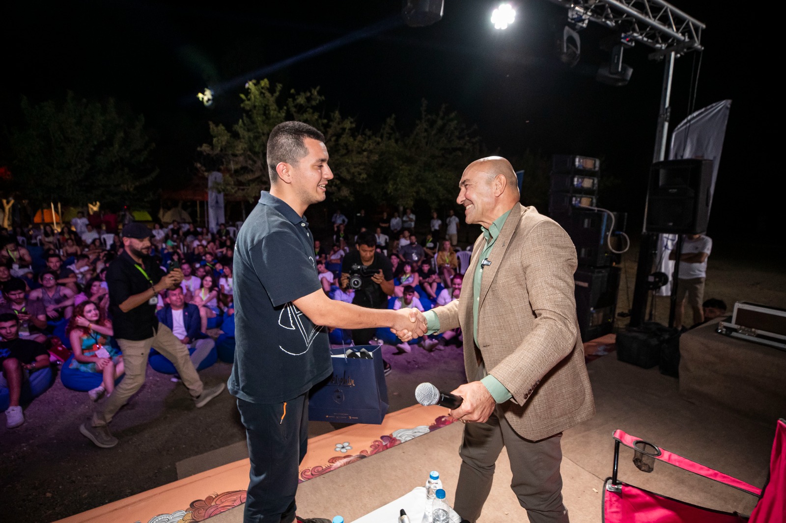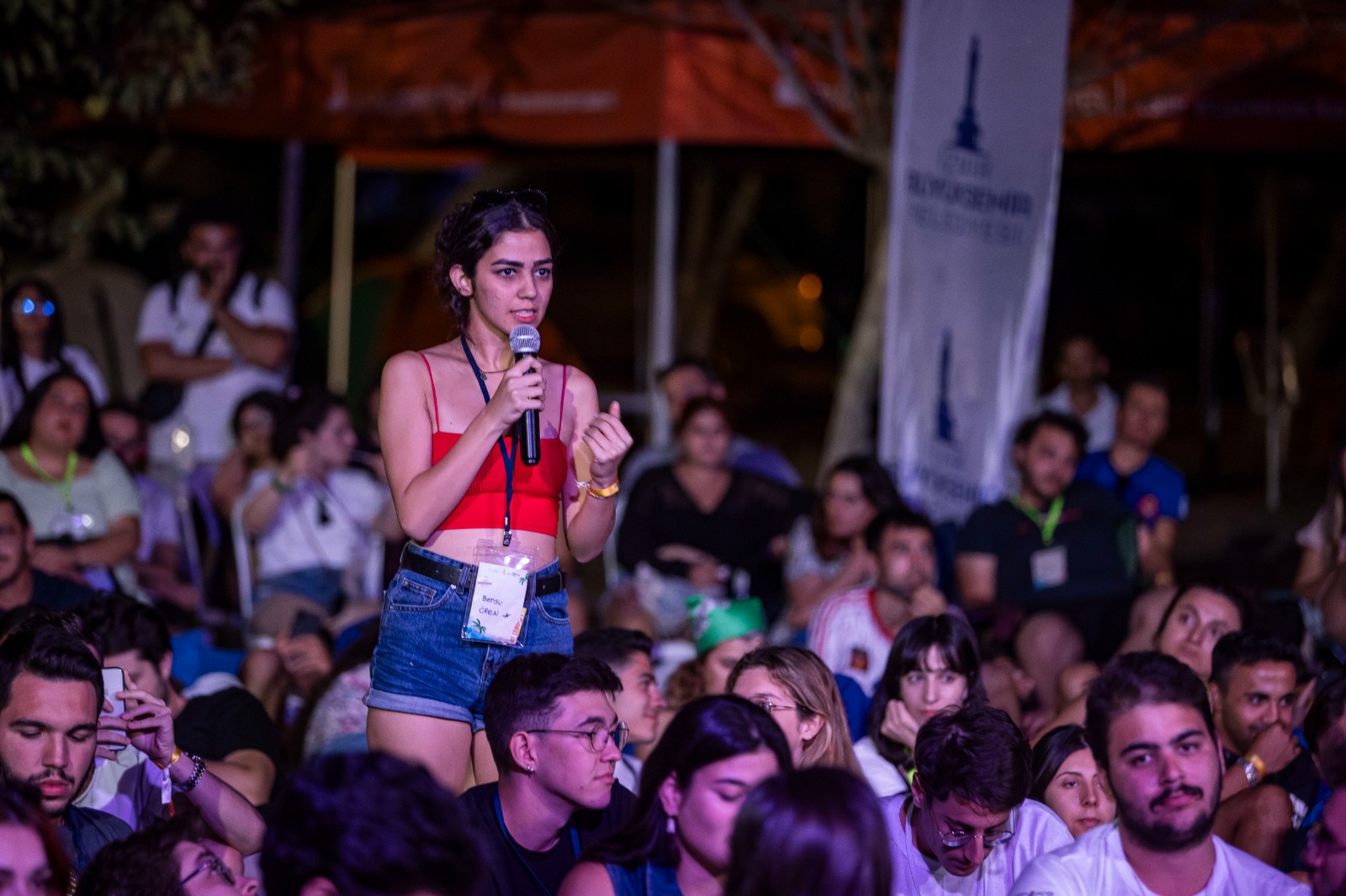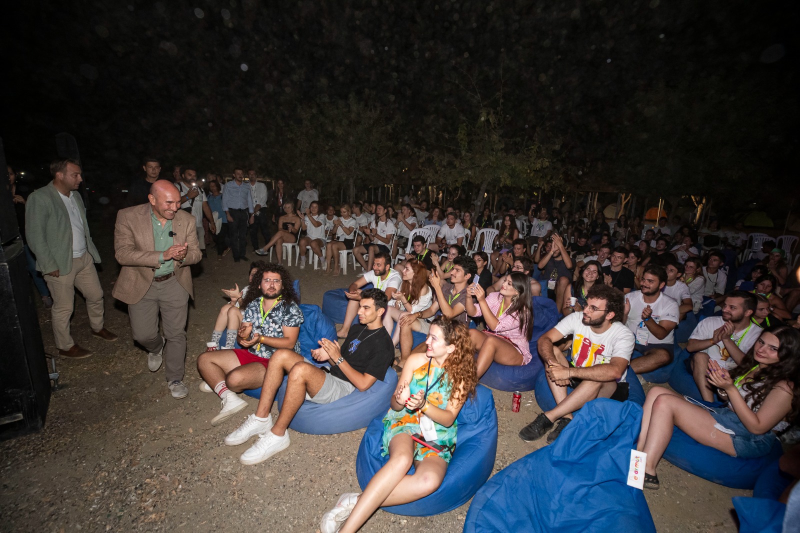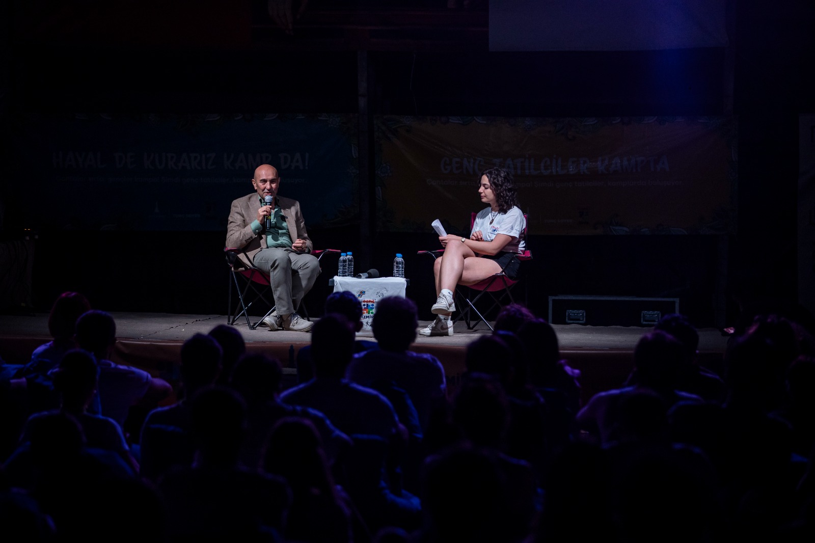 Alanda yoğun ilgiyle karşılanan Başkan Soyer, gençlerle hatıra fotoğrafı çektirdi. Kampın söyleşi bölümünde sahneye gelen Başkan Soyer, okul yıllarından, özel hayatına, hobilerinden günlük hayatına kadar pek çok soruyu yanıtladı.