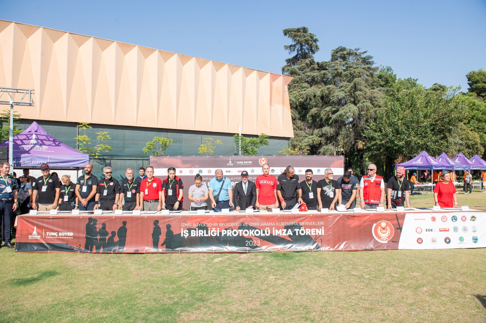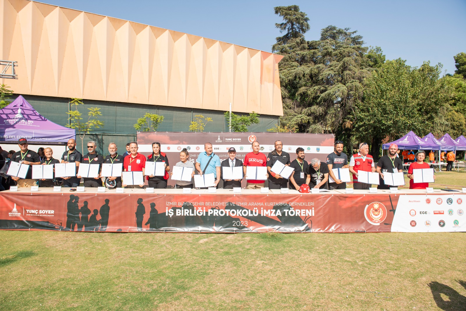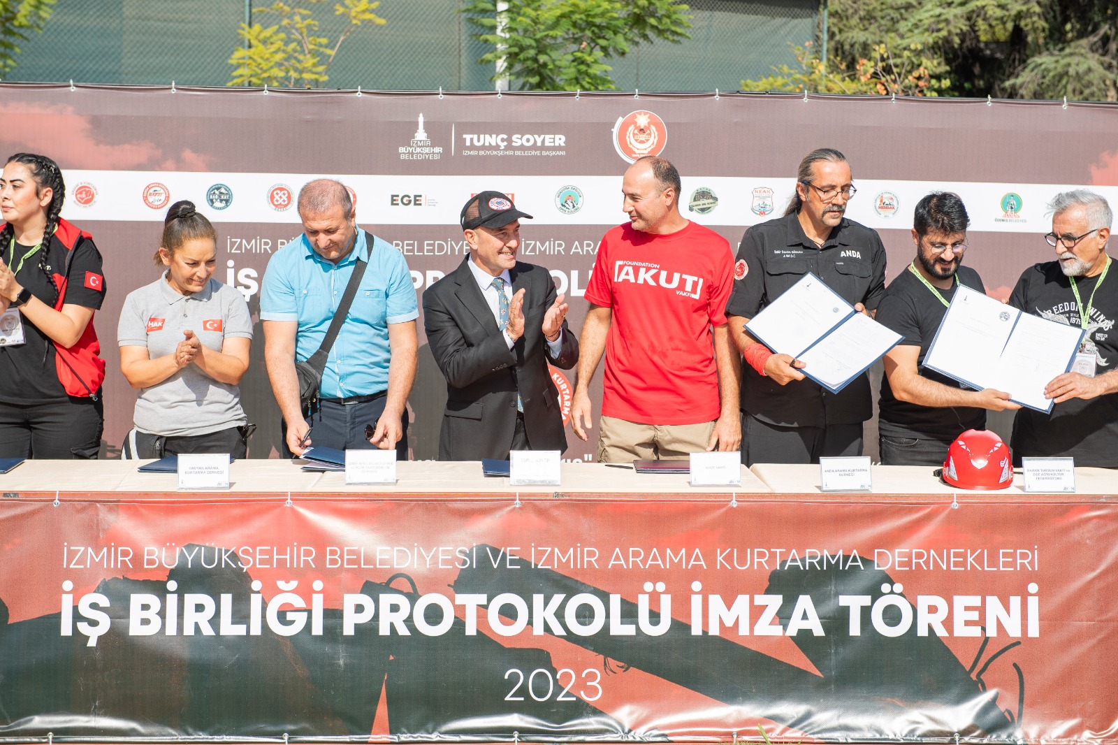 İzmir Büyükşehir Belediyesi ile afetlerde gönüllü çalışacak Arama Kurtarma Dernekleri arasında iş birliği protokolü imzalandı. Törende konuşan Başkan Soyer, afetlerde eğitimli, donanımlı, kararlı sivil yapıların önemine değinerek, “Bugün attığımız imzalar belki de gün gelecek bir hayat kurtaracak” dedi.