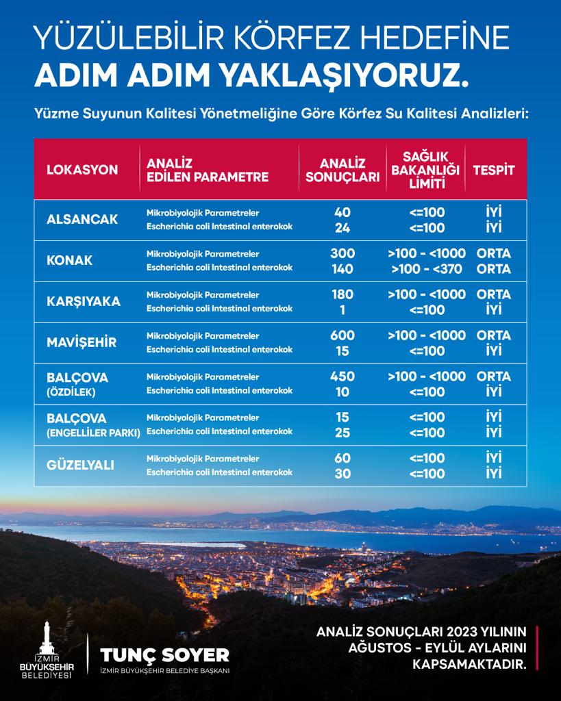 Rapora göre; özellikle Mavişehir, Karşıyaka Yelken Kulübü, Konak Alsancak, Göztepe, Poligon, Üçkuyular İskelesi, İnciraltı Kent Ormanı Engelliler Parkı ve Sahilevleri bölgelerindeki ölçüm sonuçlarının genel olarak iyi ve orta kalite sınıfında olduğu gözlendi. Yağışlı havalarda taşkınlardan kaynaklı olarak körfezin su kalitesi dönemsel olarak değişkenlik göstermekle birlikte yoğun yağışların yaşanmadığı yaz aylarında su kalitesi daha iyi kalite sınıfında izlendiği görüldü.