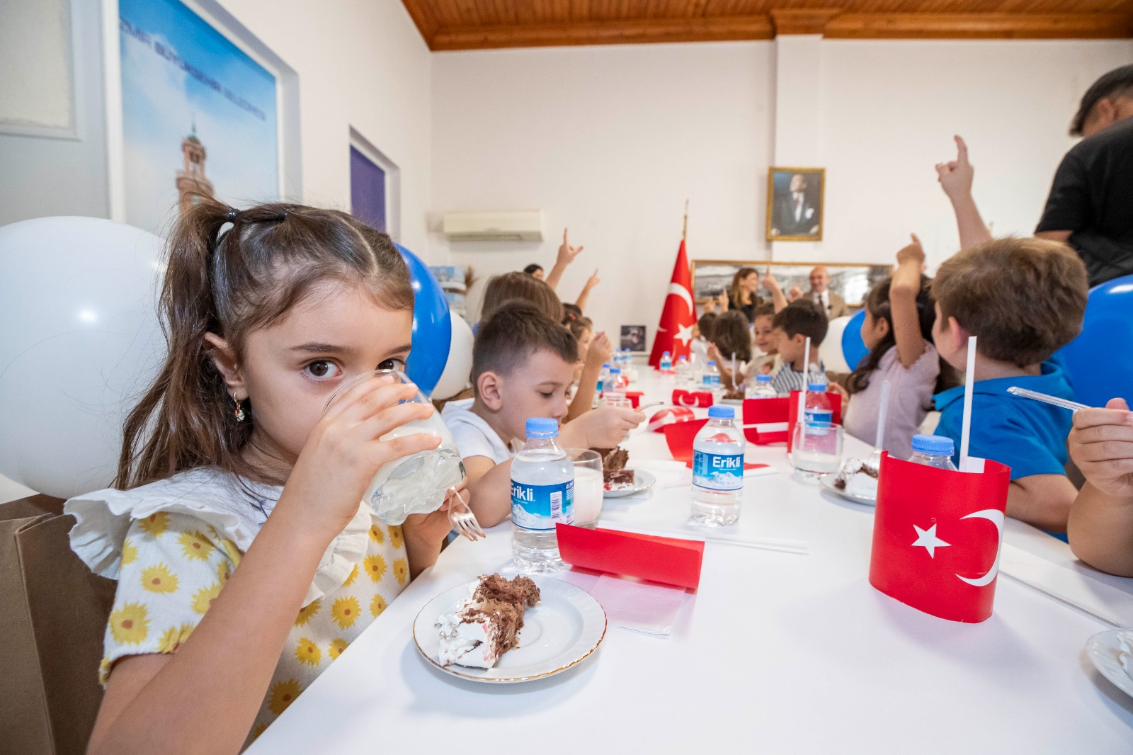 Başkan Soyer, toplantı salonunu Türk bayrakları ve balonlarla dolduran miniklerle sütün ve süt içmenin önemi hakkında sohbet etti. Anaokulu Müdürü Hülya Altun ise Başkan Soyer’e Süt Kuzusu projesiyle çocukların gelişimine katkı sağladığı için okul ve veliler adına teşekkür etti. Sohbetin ardından Başkan Soyer öğrencilerle üstünde “Süt İçelim” yazan pasta kesti.