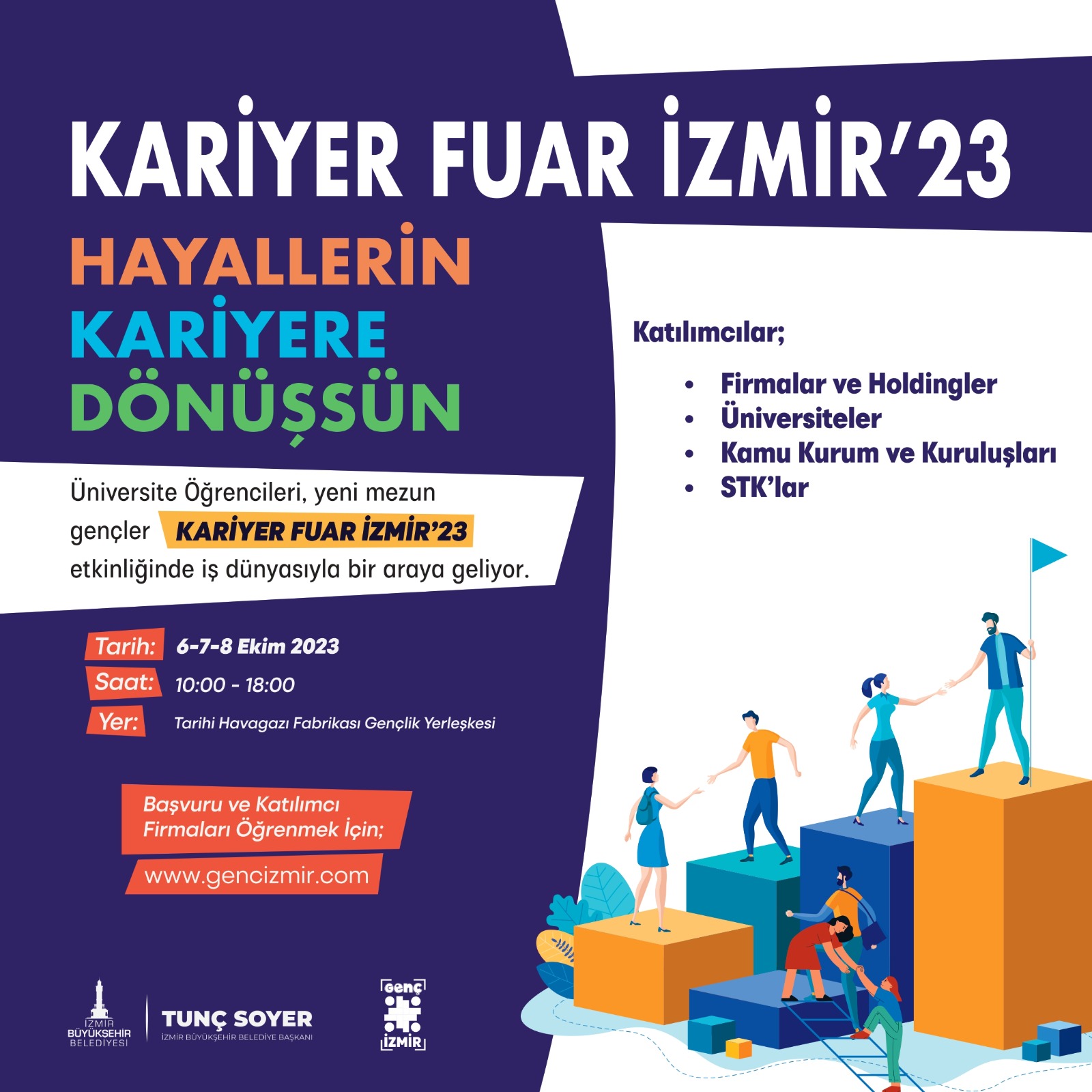 İzmir Büyükşehir Belediyesi Sosyal Projeler Dairesi Başkanlığı Gençlik Çalışmaları ve Sosyal Projeler Şube Müdürlüğü koordinasyonunda 6-8 Ekim 2023 tarihlerinde Alsancak Tarihi Havagazı Fabrikası Gençlik Yerleşkesi’nde “Kariyer Fuar İzmir’23” etkinliği yapılacak. “Hayallerin Kariyere Dönüşsün” sloganıyla nitelikli işgücü ile iş dünyasını buluşturacak Kariyer Fuarı, İzmir’de yaşayan 18-35 yaş arası üniversite öğrencisi ve mezunu genç grubuna sesleniyor. Fuar 10.00 – 18.00 saatleri arasında ücretsiz ziyaret edilebilecek. Başvuru ve katılımcı firmaları görmek için gencizmir.com adresi ziyaret edilebilir.
