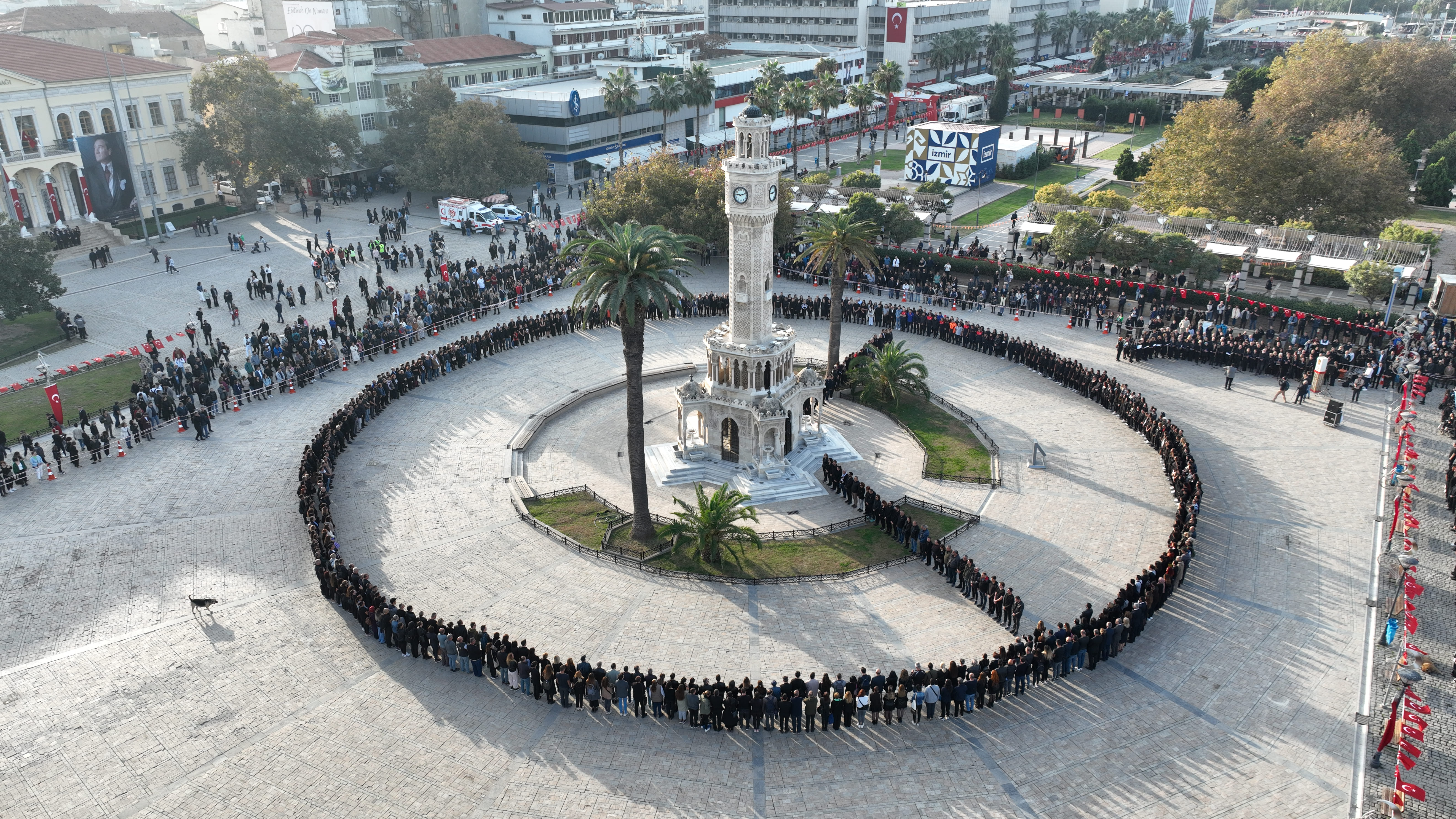 İzmir Büyükşehir Belediyesi, ulu önder Mustafa Kemal Atatürk’ün ölümünün 85’inci yıldönümünde saatler 9.05’i gösterirken belediye çalışanlarının yer aldığı etkileyici bir görsel etkinliğe imza attı. Konak Atatürk Meydanı’nda 1881 kişi “7’den 77’ye İzindeyiz” yazısı ve 9’u 5 geçe duran saat figürü oluşturuldu.