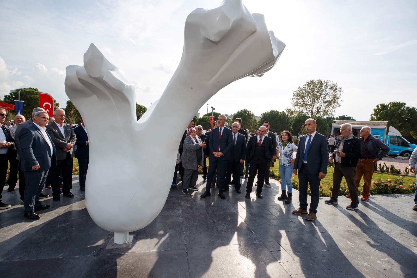 Alevi Bektaşi Federasyonu Genel Başkanı Mustafa Aslan ise, “Ülkenin gerçekten Hacı Bektaş barışına, kardeşliğine ihtiyaç duyduğu bir dönemden geçiyoruz. Hepimizin özlemi barış ve kardeşlik. Ülkede insanların etnik kimliğinden inançlarından dolayı ötekileştirildiği, yok sayıldığı bir dönemde, ülke yönetenlerin bu barış ve sevgiye düşmanlığından Hacı ve Bektaş’ın aslan ve ceylana bile tahammül olmayan bir dönemde, bir yerel yöneticinin bu barışı, sevgiyi, kardeşliği dünyanın dört bir yanına yayan Hünkar’ın düşüncesini burada eser haline getirdiği için Tunç Soyer’e teşekkür ediyorum. Bizim böyle yöneticilere ihtiyacımız var. Umarım İzmir Türkiye’yi yönetenlere ışık olur” dedi.