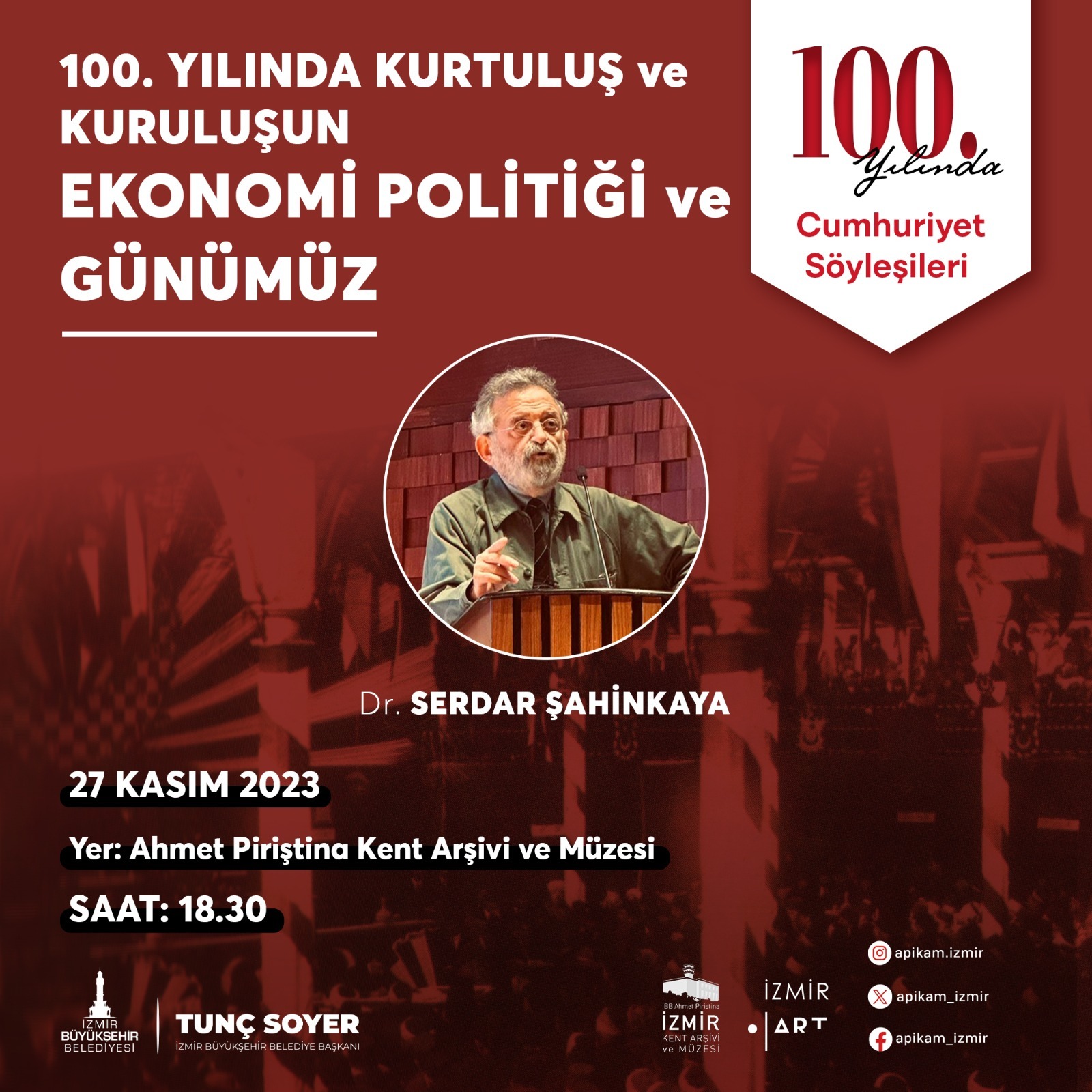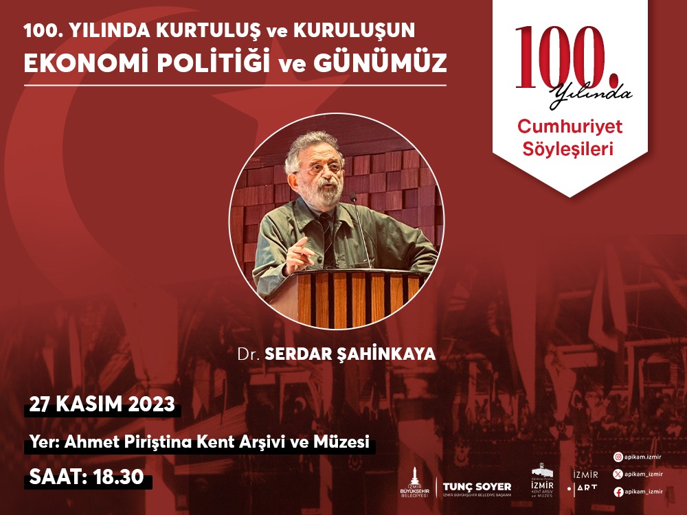 İzmir Büyükşehir Belediyesi’nin, Cumhuriyet’in 100. yılı kutlamaları kapsamında düzenlediği “Cumhuriyet Söyleşileri”nin ikinci konuğu 27 Kasım Pazartesi günü Dr. Serdar Şahinkaya olacak. “100. Yılında Kurtuluş ve Kuruluşun Ekonomi Politiği ve Günümüz” konulu söyleşi APİKAM’da saat 18.30’da başlayacak.