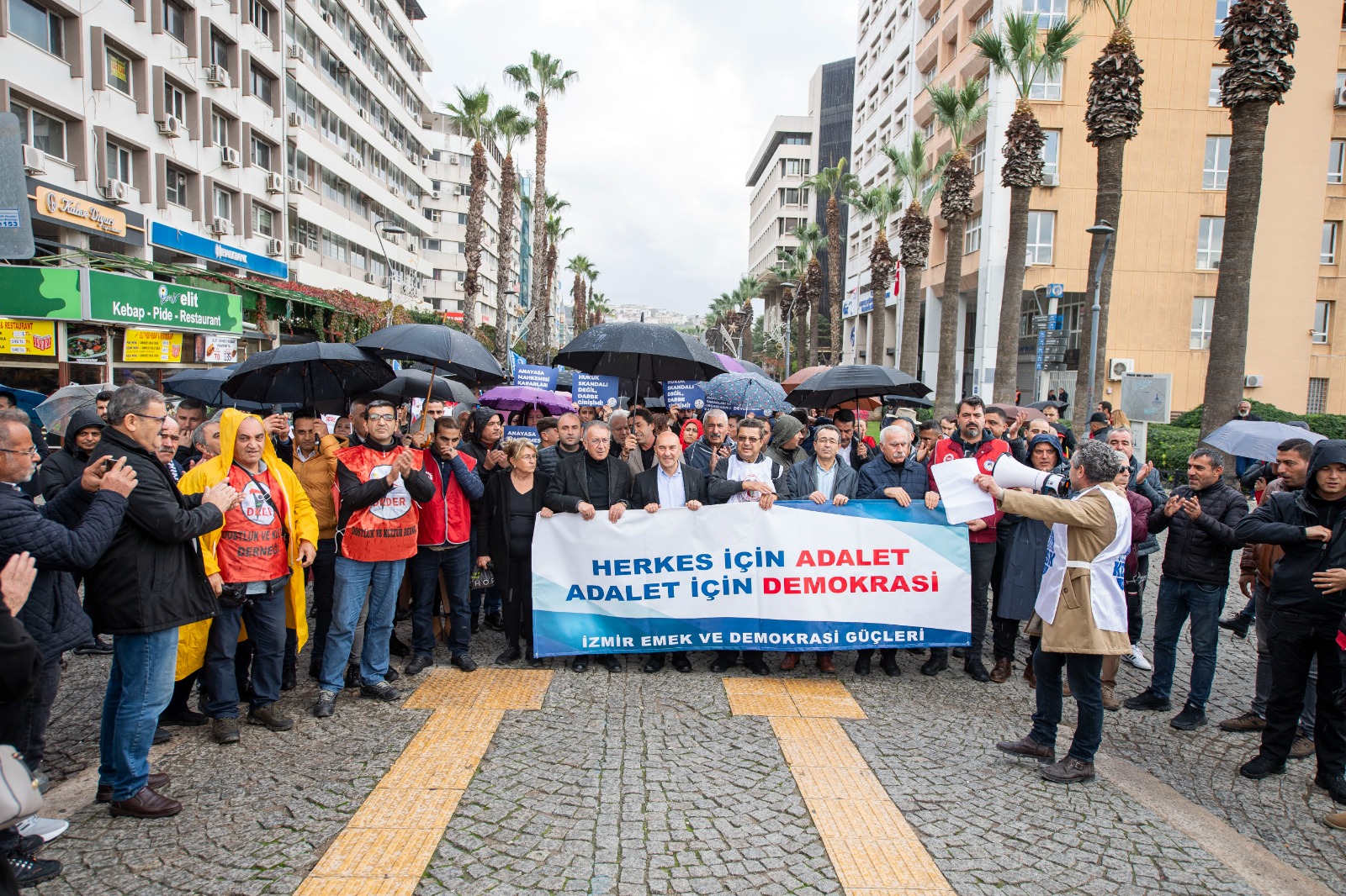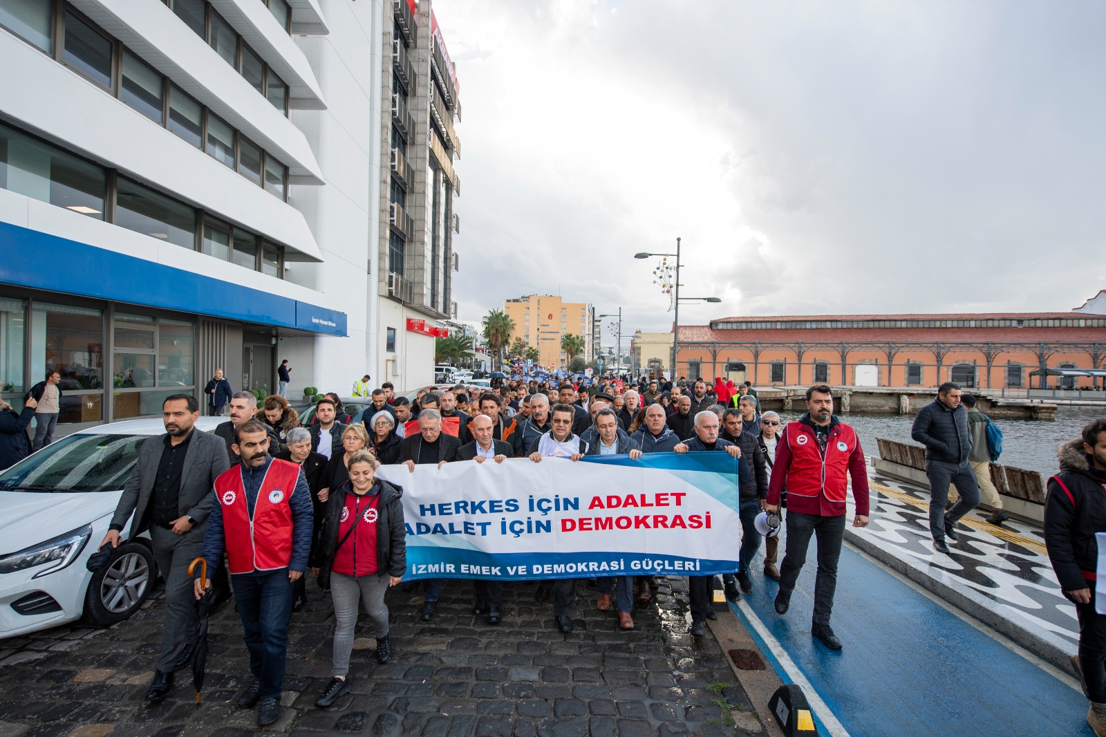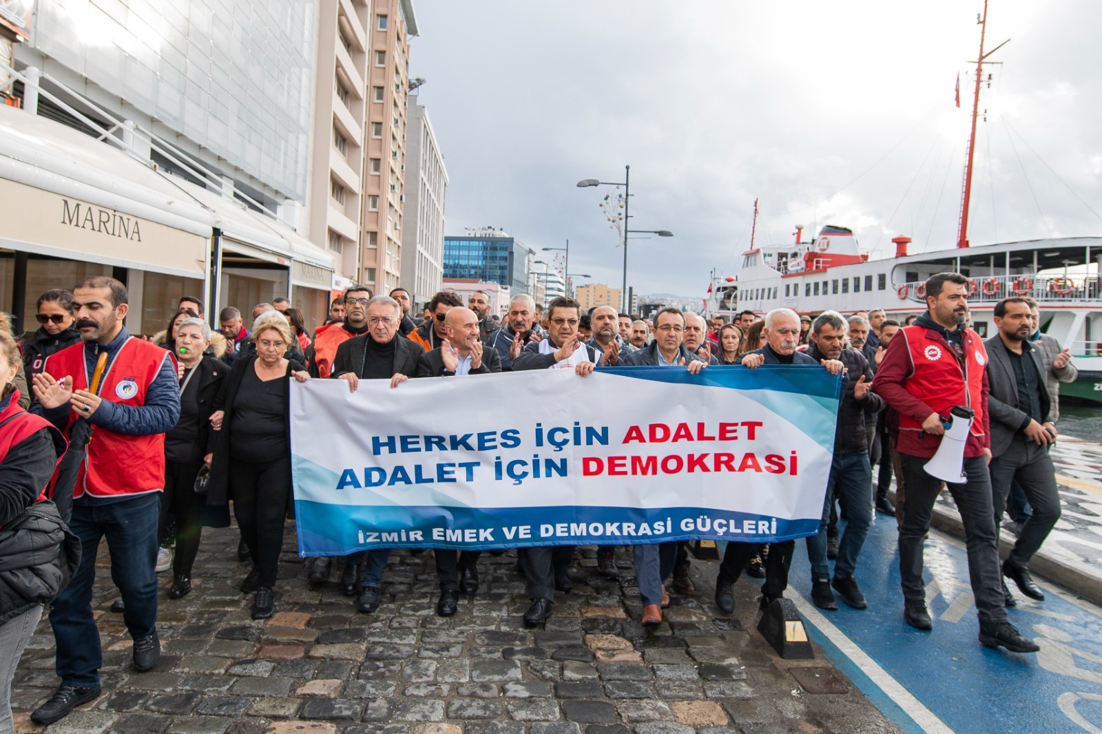 Devrimci İşçi Sendikaları Konfederasyonu (DİSK), Kamu Emekçileri Sendikaları Konfederasyonu (KESK), Türk Mühendis ve Mimar Odaları Birliği (TMMOB), Türk Tabipleri Birliği (TTB), İzmir Barosu ve siyasi partilerin yer aldığı yürüyüşte ortak basın açıklamasını İzmir Barosu Başkanı Sefa Yılmaz yaptı. Türkiye’nin, yargının yürütme tarafından tahakküm altına alındığı, evrensel hukuk ilkelerinin göz ardı edildiği, insan hak ve özgürlüklerinin yok sayıldığı bir ülke haline geldiğini söyleyen Yılmaz, “İzmir’in, Türkiye’nin hak savunucuları olarak, muktedirlerin haklara ve özgürlüklere yönelik saldırıları karşısında, yılmadan, boyun eğmeden barışı, demokrasiyi, hukuk devletini savunduk. Bundan hiç vazgeçmedik. Ne yazık ki ülkemiz, insan hak ve özgürlüklerini geliştirmeyi, toplumsal yaşamı bunun üzerinden biçimlendirmeyi hedefleyen değil, koydukları sınırlarla, getirdikleri yasaklarla, acımasız sertlikte ve antidemokratik güvenlik politikalarıyla andığımız siyasal iktidarlar tarafından yönetildi, yönetiliyor. Artık hukuk devletinden, tarafsız ve bağımsız bir yargıdan bahsetmek mümkün değil” dedi.