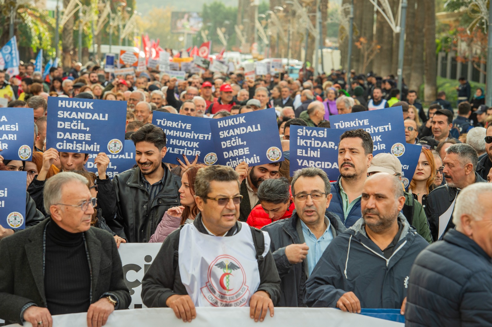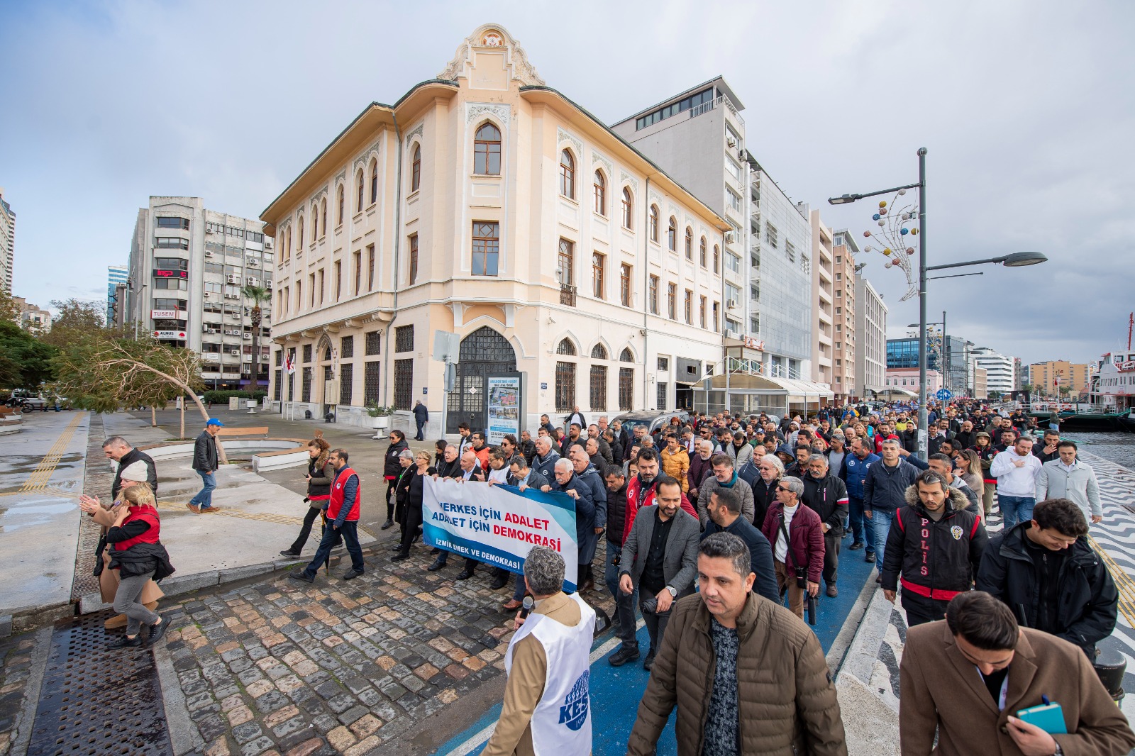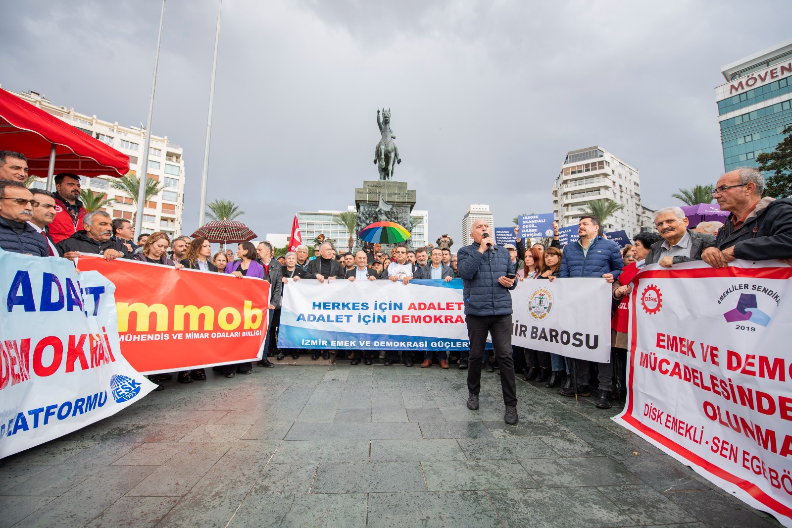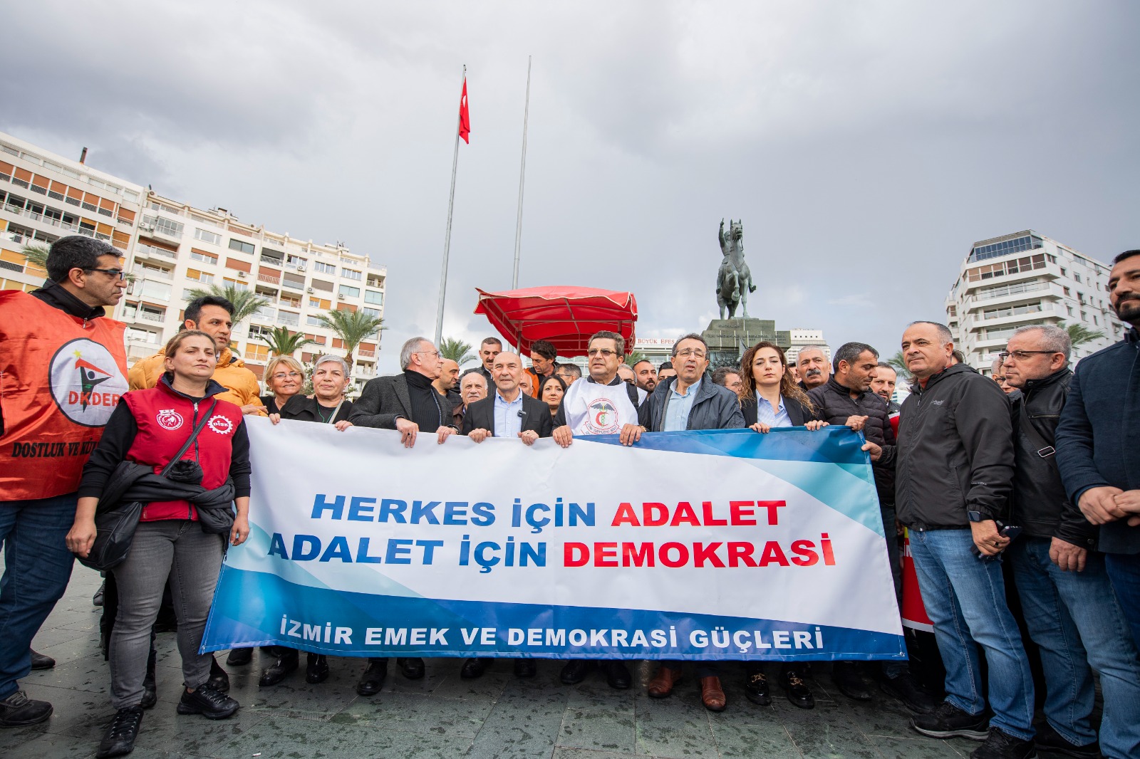 Devrimci İşçi Sendikaları Konfederasyonu (DİSK), Kamu Emekçileri Sendikaları Konfederasyonu (KESK), Türk Mühendis ve Mimar Odaları Birliği (TMMOB), Türk Tabipleri Birliği (TTB), İzmir Barosu ve siyasi partilerin yer aldığı yürüyüşte ortak basın açıklamasını İzmir Barosu Başkanı Sefa Yılmaz yaptı. Türkiye’nin, yargının yürütme tarafından tahakküm altına alındığı, evrensel hukuk ilkelerinin göz ardı edildiği, insan hak ve özgürlüklerinin yok sayıldığı bir ülke haline geldiğini söyleyen Yılmaz, “İzmir’in, Türkiye’nin hak savunucuları olarak, muktedirlerin haklara ve özgürlüklere yönelik saldırıları karşısında, yılmadan, boyun eğmeden barışı, demokrasiyi, hukuk devletini savunduk. Bundan hiç vazgeçmedik. Ne yazık ki ülkemiz, insan hak ve özgürlüklerini geliştirmeyi, toplumsal yaşamı bunun üzerinden biçimlendirmeyi hedefleyen değil, koydukları sınırlarla, getirdikleri yasaklarla, acımasız sertlikte ve antidemokratik güvenlik politikalarıyla andığımız siyasal iktidarlar tarafından yönetildi, yönetiliyor. Artık hukuk devletinden, tarafsız ve bağımsız bir yargıdan bahsetmek mümkün değil” dedi.