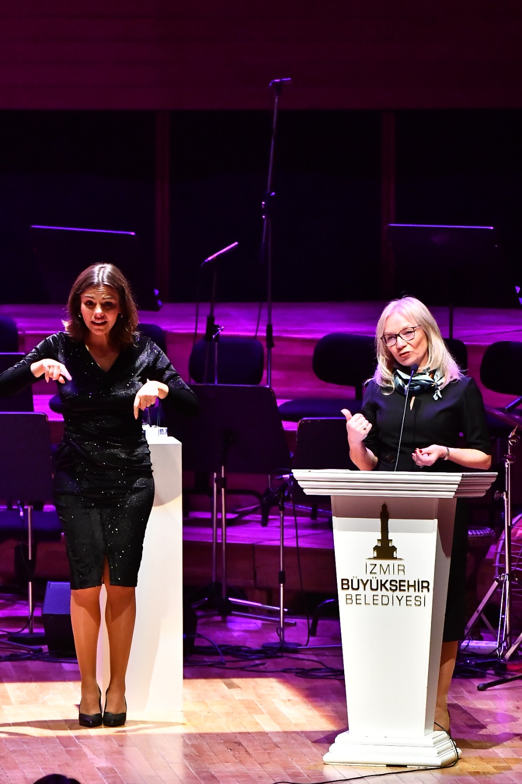 İzmir Büyükşehir Belediyesi Genel Sekreter Yardımcısı Şükran Nurlu, “İzmir Büyükşehir Belediyesi olarak kadına yönelik şiddetle mücadele etmek, genç kızlarımızın okumasını, istihdam sağlanmasını teşvik etmek istiyoruz. Bu ödül töreniyle de kadınları desteklemek istedik. Bu yıl ikincisini düzenlediğimiz törenle sağlıkta, adalette, çalışma hayatında eşitliği sağlamak istiyoruz. İzmir Büyükşehir Belediyesi’nde bulunan üst düzey yönetici kadrosunun yüzde ellisi kadın. Erkek işi, kadın işi yok İzmir Büyükşehir Belediyesi’nde. Hangi dairede kadın çalışanımız az diye araştırdığımızda Makine İkmal Dairesi Başkanlığı’mız çıktı. Biz de bu alana öncelik verebilmek, burada da kadınlarımızı istihdam edebilmek için Eğitim Şubemiz ile birlikte bir kurs verdik. 60 kadın eğitime dâhil oldu. Bu kadınlarımızı istihdama da katacağız. İzmir Büyükşehir Belediyesi’nin Kadın Sutopu Takımı Türkiye’ye ilk defa kupa getirerek Avrupa Şampiyonu oldu” dedi.