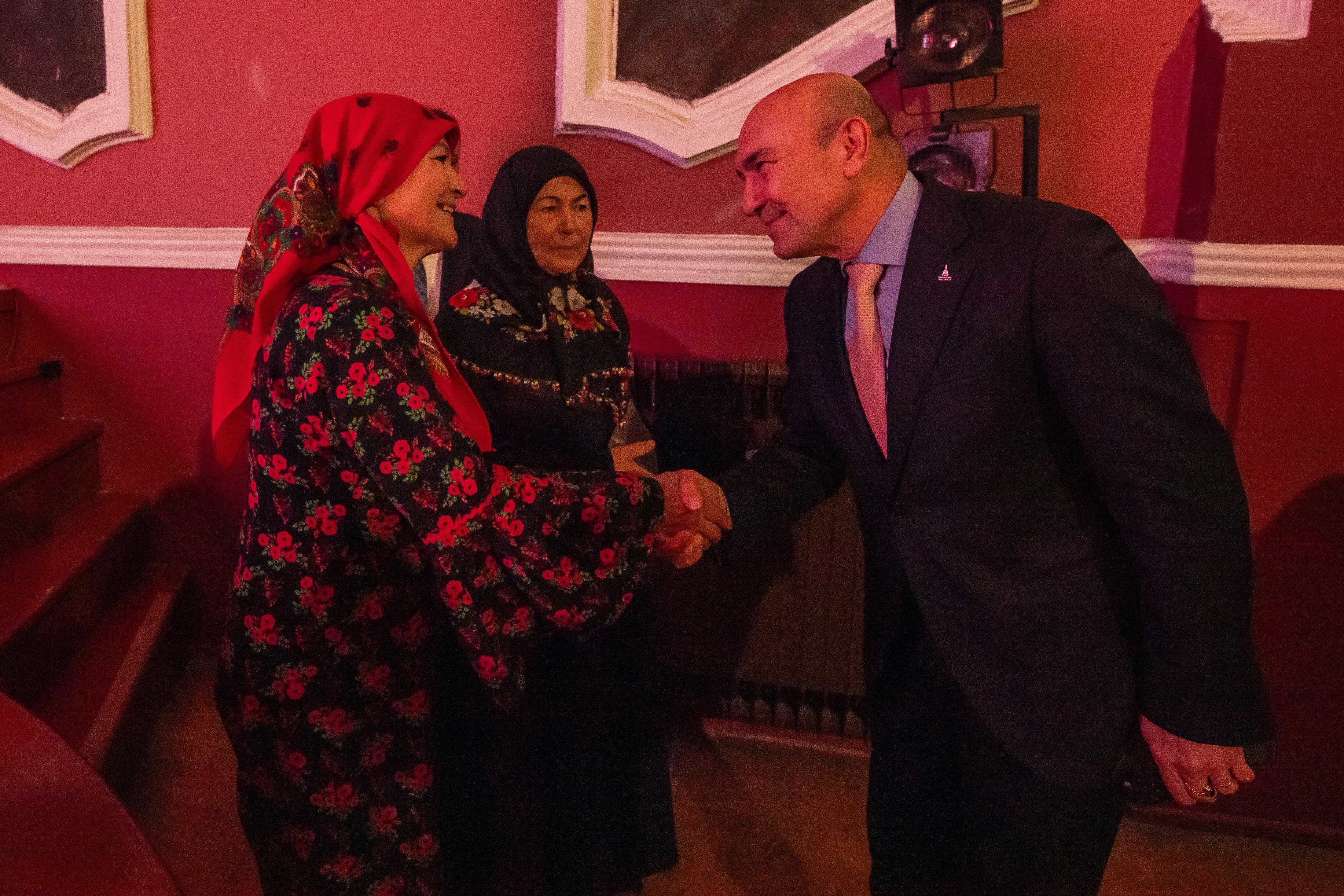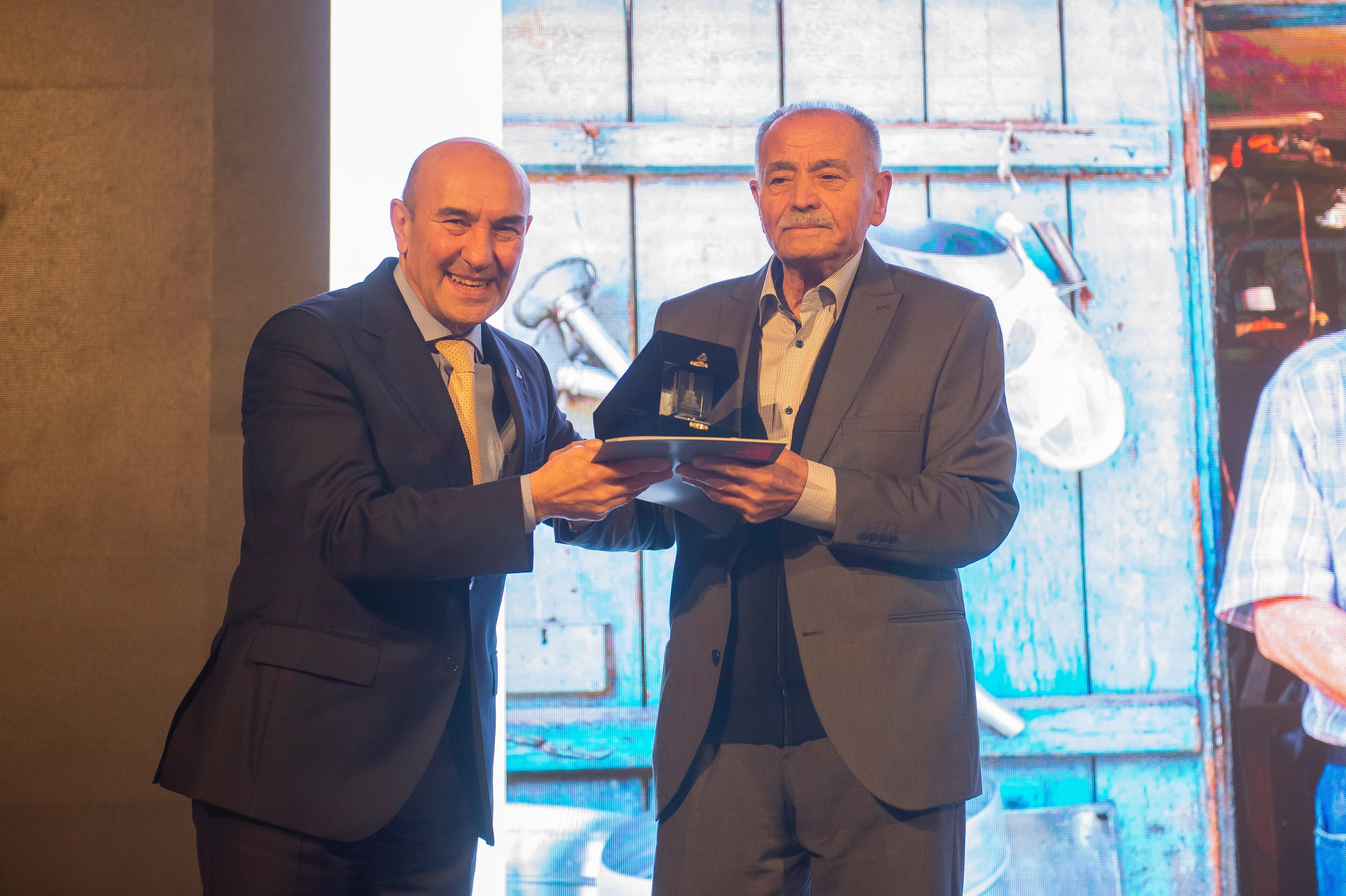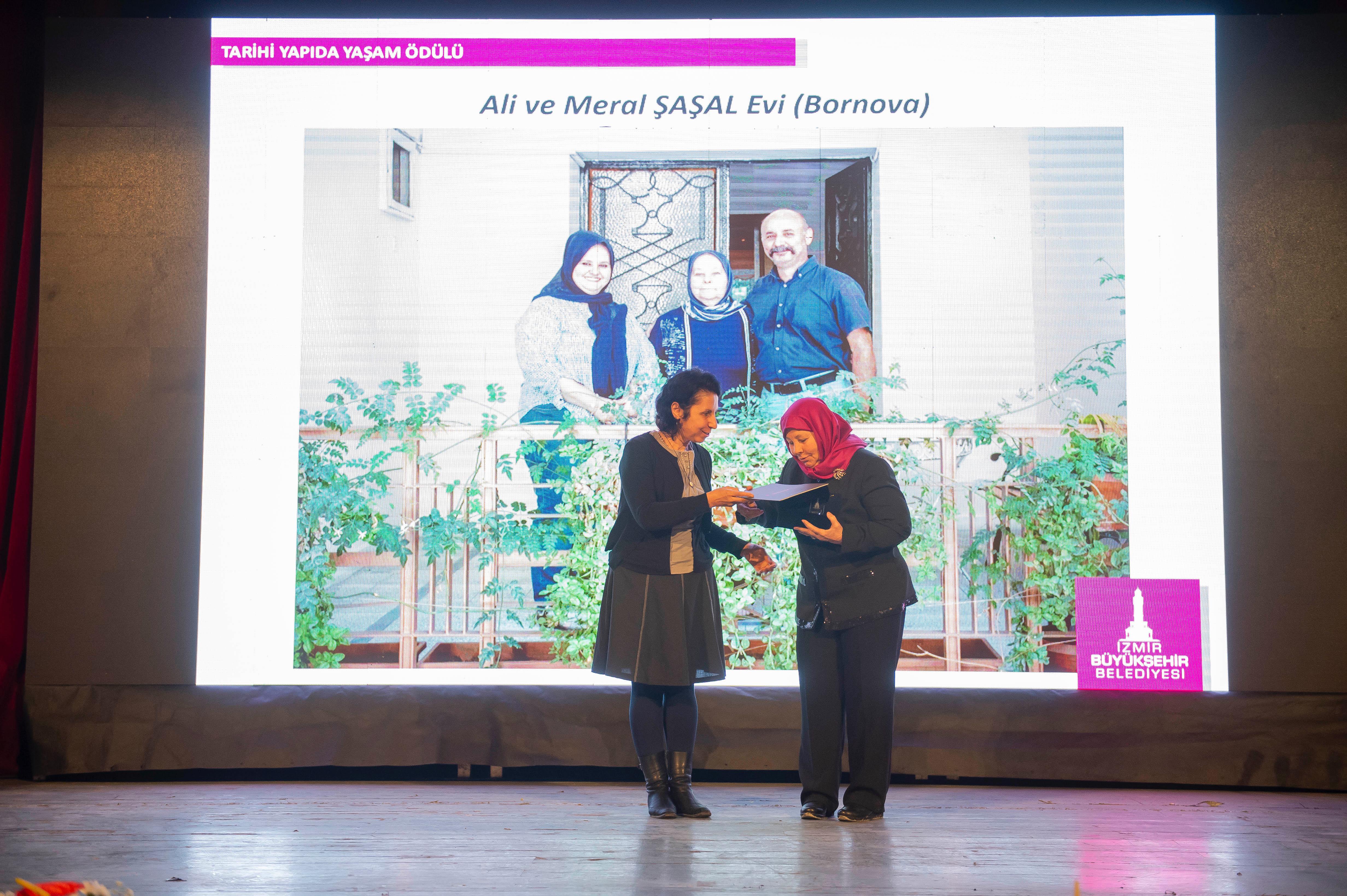 Başkan Soyer, Tarihi Yapıda Yaşam Ödülünü alan Nilgün Dicle Derin (Alsancak) ve Tarihi Mekânda Geleneksel Zanaatların Yaşatılması Ödülünü kazanan tenekeci Süleyman Fidan’a (Menemen) ödüllerini takdim etti.