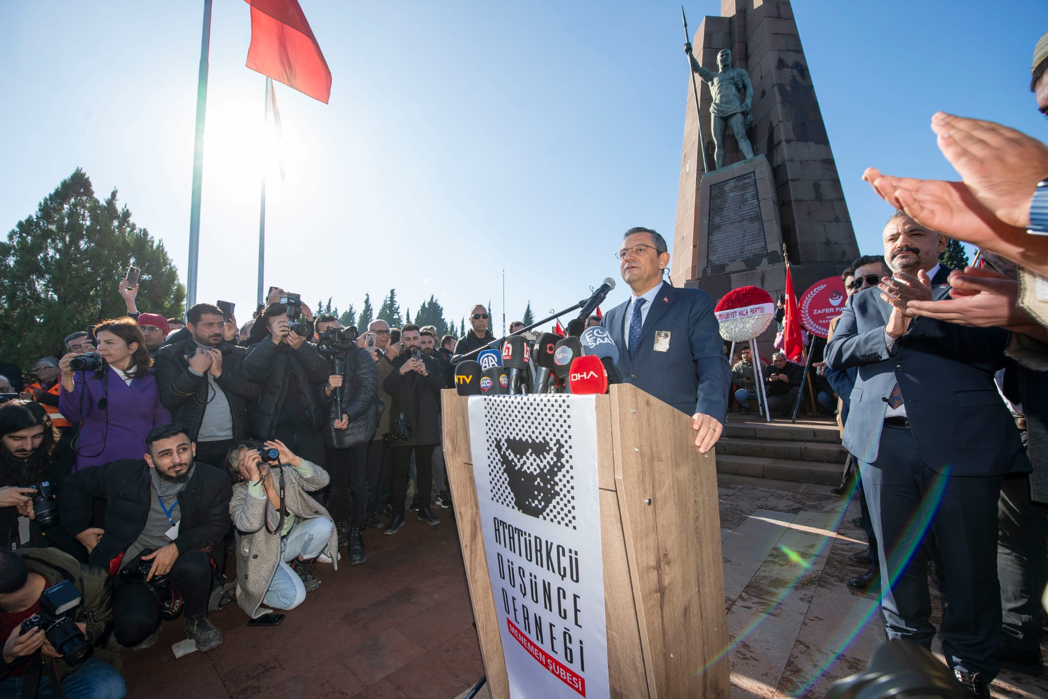 Menemen Olayı’nın tarihteki yerine değinerek ve önceki gün Türkiye gündemine düşen şehit haberlerine parantez açarak konuşmasına başlayan CHP Genel Başkanı Özgür Özel “Böyle anlamlı günlerde, özellikle devrimlere sahip çıkmanın sembolü olmuş yıldönümlerinde ya da büyük acıların anma törenlerinde var olmaya devam edeceğim. Menemen’de Atatürk’e isyan bayrağı açtılar. Asteğmen Kubilay görmezden gelmedi. Geri adım atmadı. Eğer o hainlere karşı başını eğseydi bu ülkenin bağımsızlığı için üzerine düşeni yapamayacaktı. Bazen devrimciler boyun eğmek yerine Kubilay gibi baş verirler. Geçmişte Menemen’de çok coşkulu törenler olurdu, şimdi giriş sayısı sınırlandı dediler. Ben CHP’lilerin bugün ne yapacağından emindim. Ne törende 10 kişiyiz ne de bu tepede birilerinin umduğu gibi yalnızız. Gözün alabildiği her yerde ve bu meydana sığmayan yerlerde Atatürkçüler varsa umut var. Umut cumhuriyettedir. Umut bizdedir. Çağrılın çağrılmayın gücümüzü göstermemiz gereken her yerde hep birlikte mücadele etmeye var mıyız? Hep birlikte başaracağız. Biz çokuz ve birlikte kazanacağız” dedi.