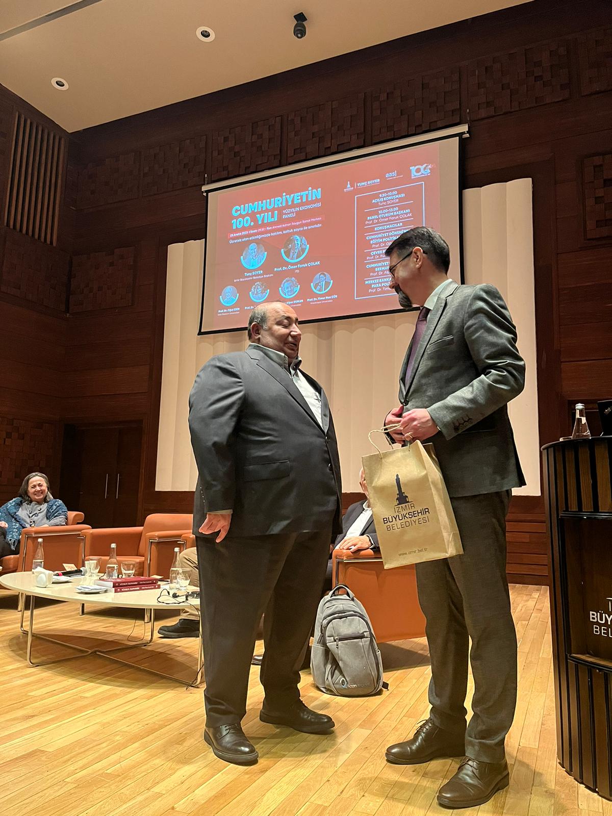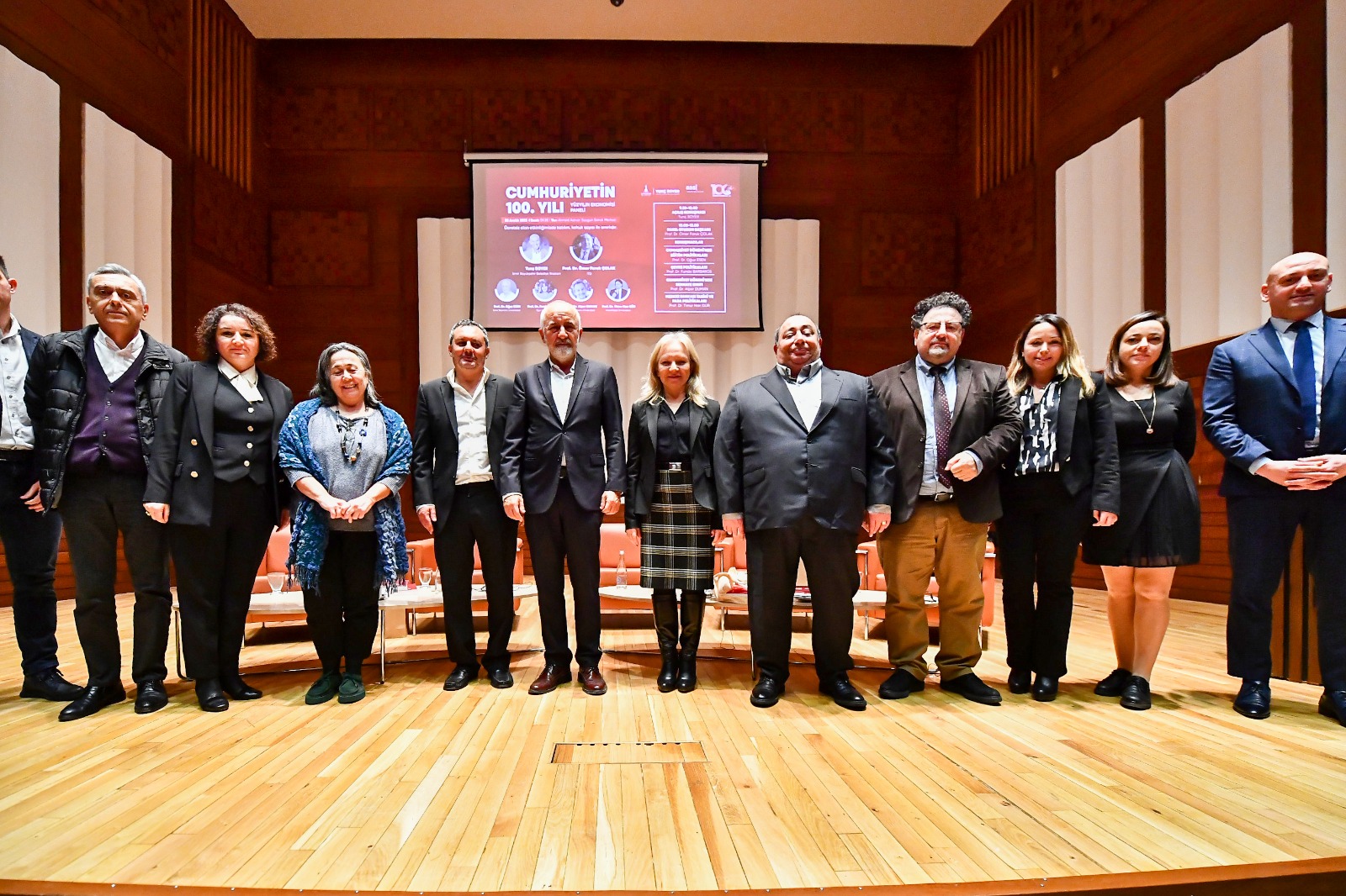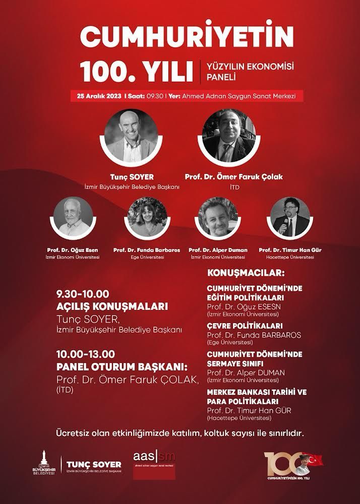 İzmir Büyükşehir Belediyesi’nin 2023 yılının tamamına yaydığı Türkiye Cumhuriyeti’nin 100’üncü yılı kutlamaları kapsamında “Yüzyılın Ekonomisi” paneli düzenlendi. Türkiye’nin ikinci yüzyılının ekonomisinin bilim insanları tarafından ele alındığı panel, Ahmed Adnan Saygun Sanat Merkezi’nde (AASSM) yapıldı. Panele, İzmir Büyükşehir Belediyesi Genel Sekreteri Barış Karcı, Genel Sekreter Yardımcısı Şükran Nurlu, İzmir Büyükşehir Belediyesi bürokratları, akademisyenler, öğrenciler ve çok sayıda yurttaş katıldı.