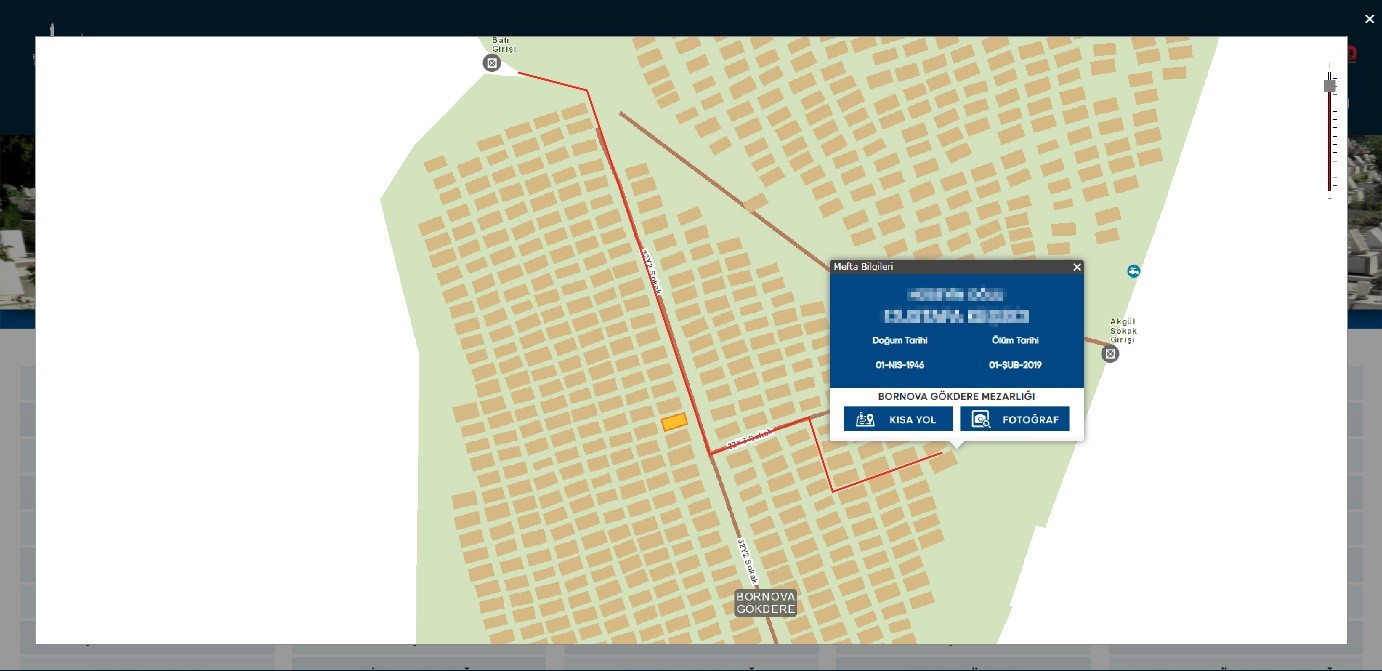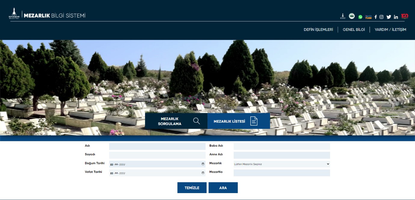 Mezarlık Bilgi Sistemi konuma dayalı bilgilerin veri tabanında toplanarak, mezarlıklara ait sayısal haritaların oluşturulmasına, defin bilgilerinin sorgulanma ve analiz edilmesine olanak sağlayan bir sistem. Web ve mobil desteği bulunan sistemin, arayüz tasarımı yenilendi. Vatandaşların yakınlarına ait mezar bilgilerine, fotoğraflarına ve konumuna daha hızlı bir şekilde ulaşabiliyor ve güncellenen kısa yol analizi ile mezarlığın bulunduğu konuma en kısa yol bilgisi alınabiliyor. Kullanıcı dostu ara yüzü ile dikkat çeken Mezarlık Bilgi Sistemi ile yakınlarını kaybeden vatandaşlar, defin işlemleri menüsünden yapılması gerekenlerle ilgili bilgi alabiliyor.