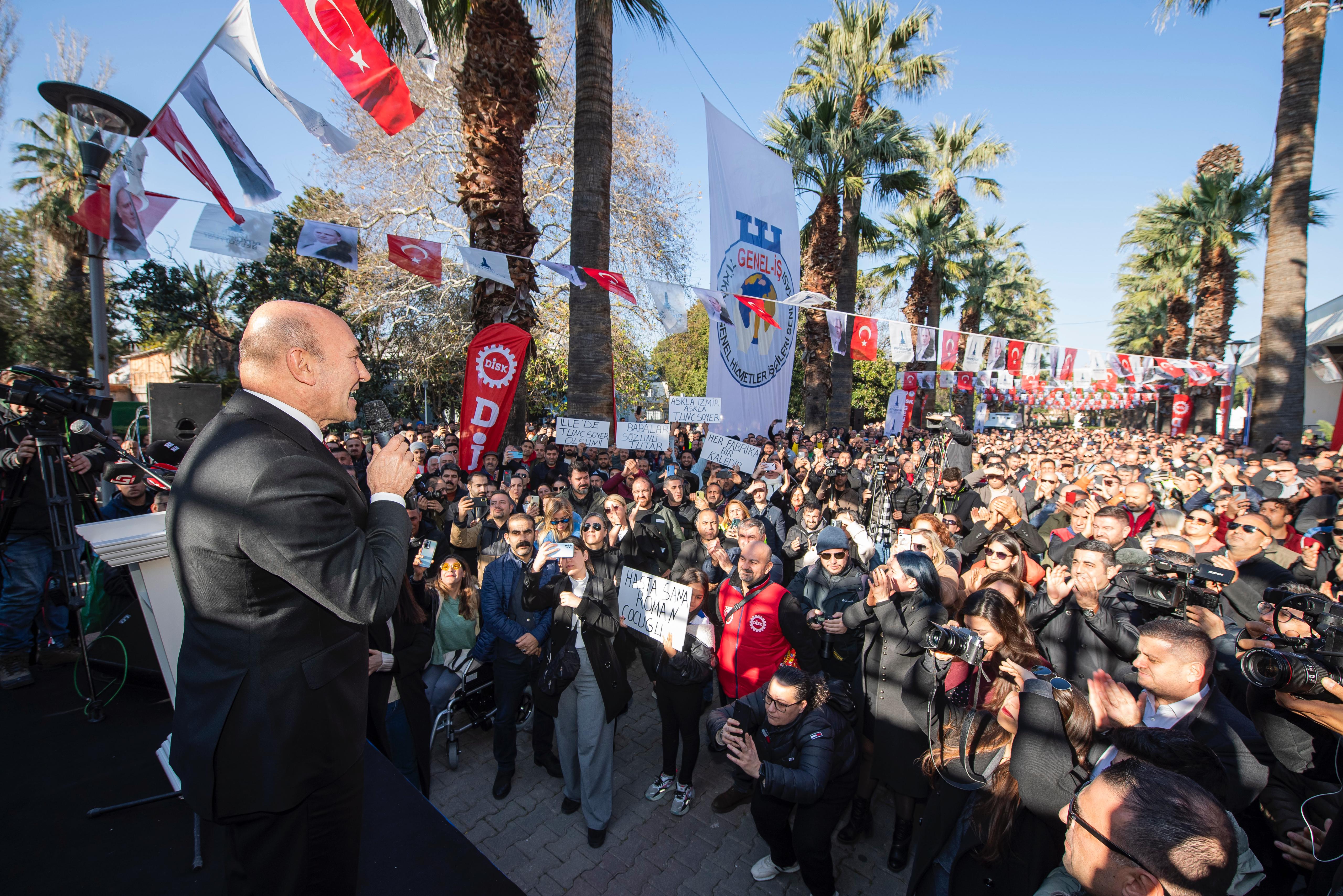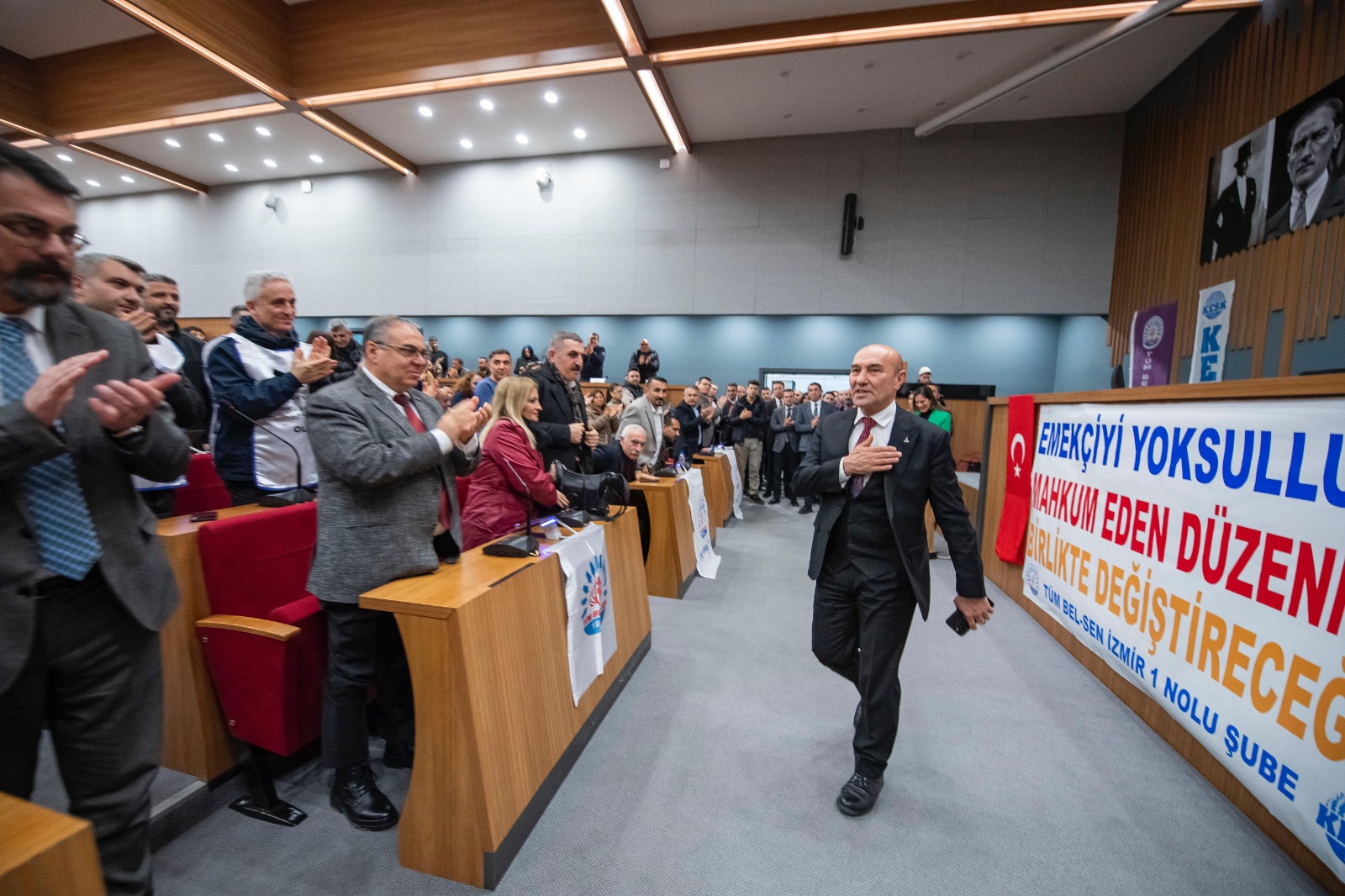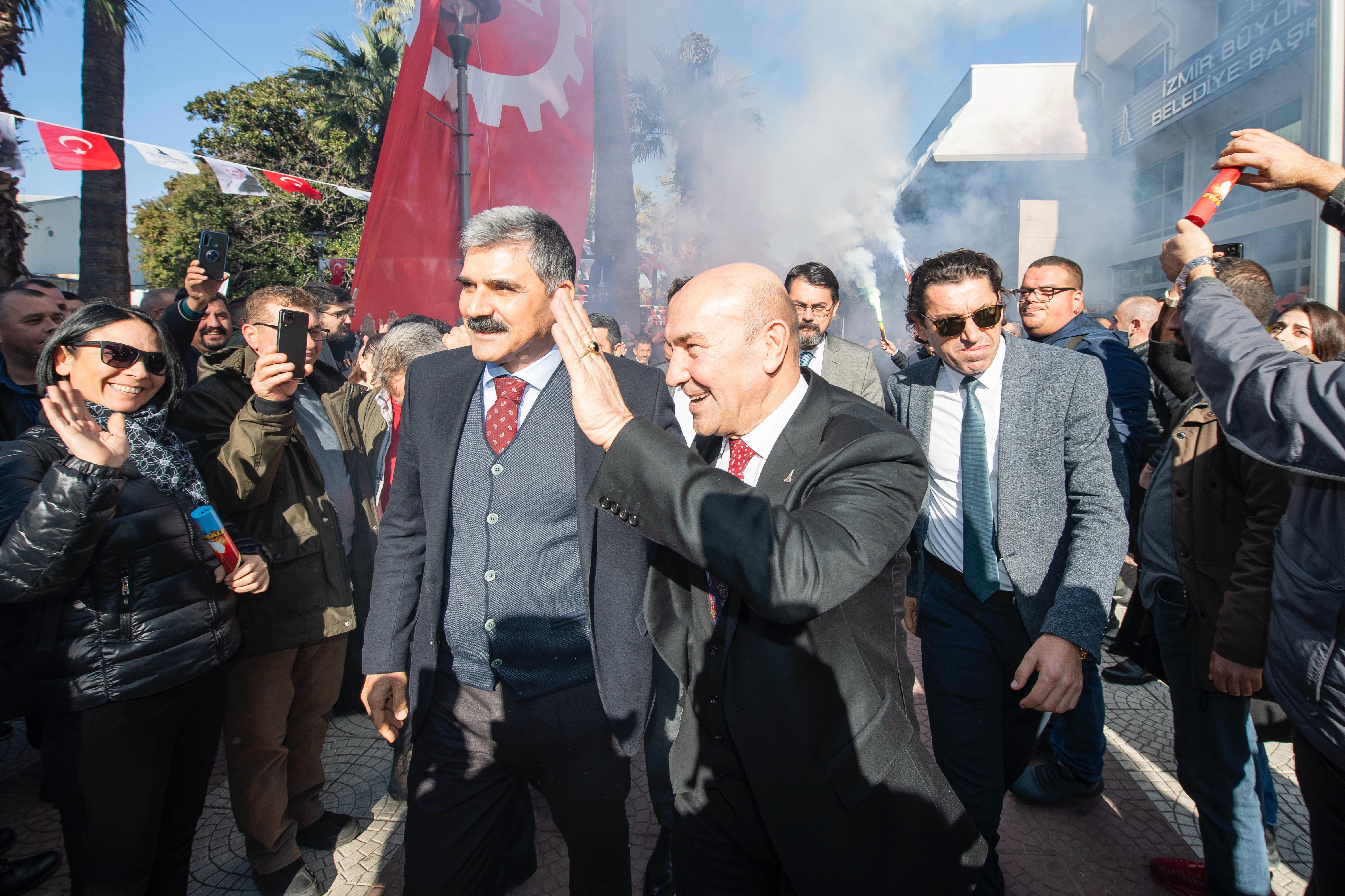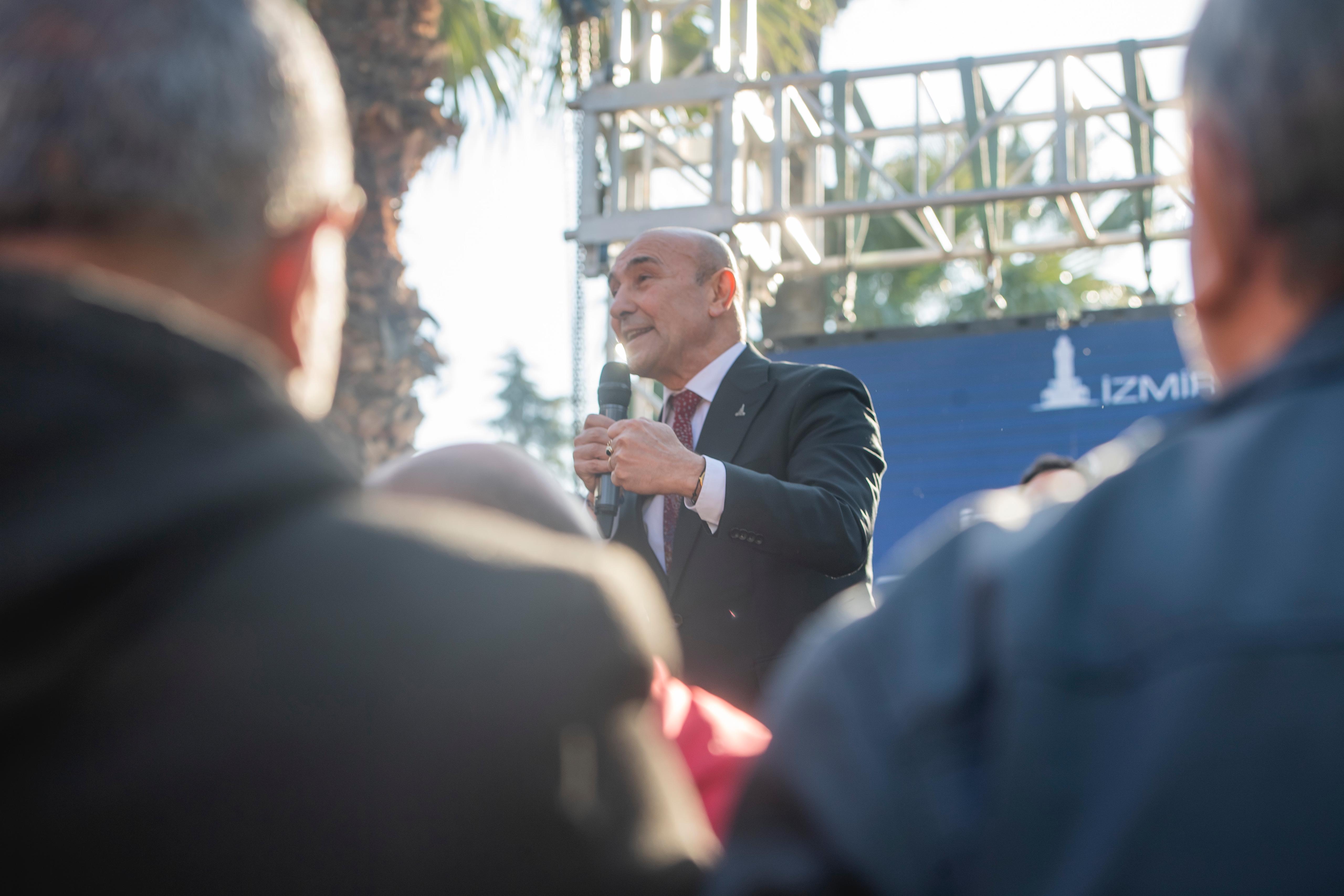 İzmir Büyükşehir Belediye Başkanı Tunç Soyer, Türkiye’ye örnek bir adım attıklarını belirterek, “Hiç kuşkunuz olmasın daha iyisini yapacağız. İki nedenle daha iyisini yapacağız. Birincisi emeğin hakkını vermek için ikincisi İzmirliler bunu hak ettiği için. Siz eğer yaptığınız işi gerçekten iç huzuru ile yaparsanız, sevgiyle yaparsanız o zaman bu şehirde yaşayan insanlar daha mutlu olacaklar. Bu bizim asli görevimizdir. Asla şaşmayacağız. Asıl olan demokrasi, adalet, hukukun üstünlüğü, emek mücadelesidir. Bu mücadelenin çok kıymetli olduğunu biliyoruz. Eğer bir ülkede demokrasi tırpanlanmışsa, azaltılmışsa, erdemleri, değerleri yok sayılmışsa bilin ki en yüksek enflasyon oranlarıyla, derin yoksulluklarla yüzleşmeye devam edeceğiz. Bu hikayeyi değiştirmenin yolu demokrasi mücadelesinden geçer. Demokrasinin olduğu yerde o ülkenin ürettiği refahı adil bir biçimde paylaştırırsınız. Demokrasi yoksa sadece bir zümrenin refahı büyür, büyük çoğunluk büyük yoksulluklar yaşar. Asıl olan demokrasi mücadelesidir. Nasıl İzmir Türkiye’nin lokomotifiyse, İzmir Büyükşehir Belediyesi demokrasi mücadelesinin de lokomotifi olmaya devam edecek. Çok daha güzel günlerde çok daha iyisini yapacağımızı göreceksiniz” diye konuştu.