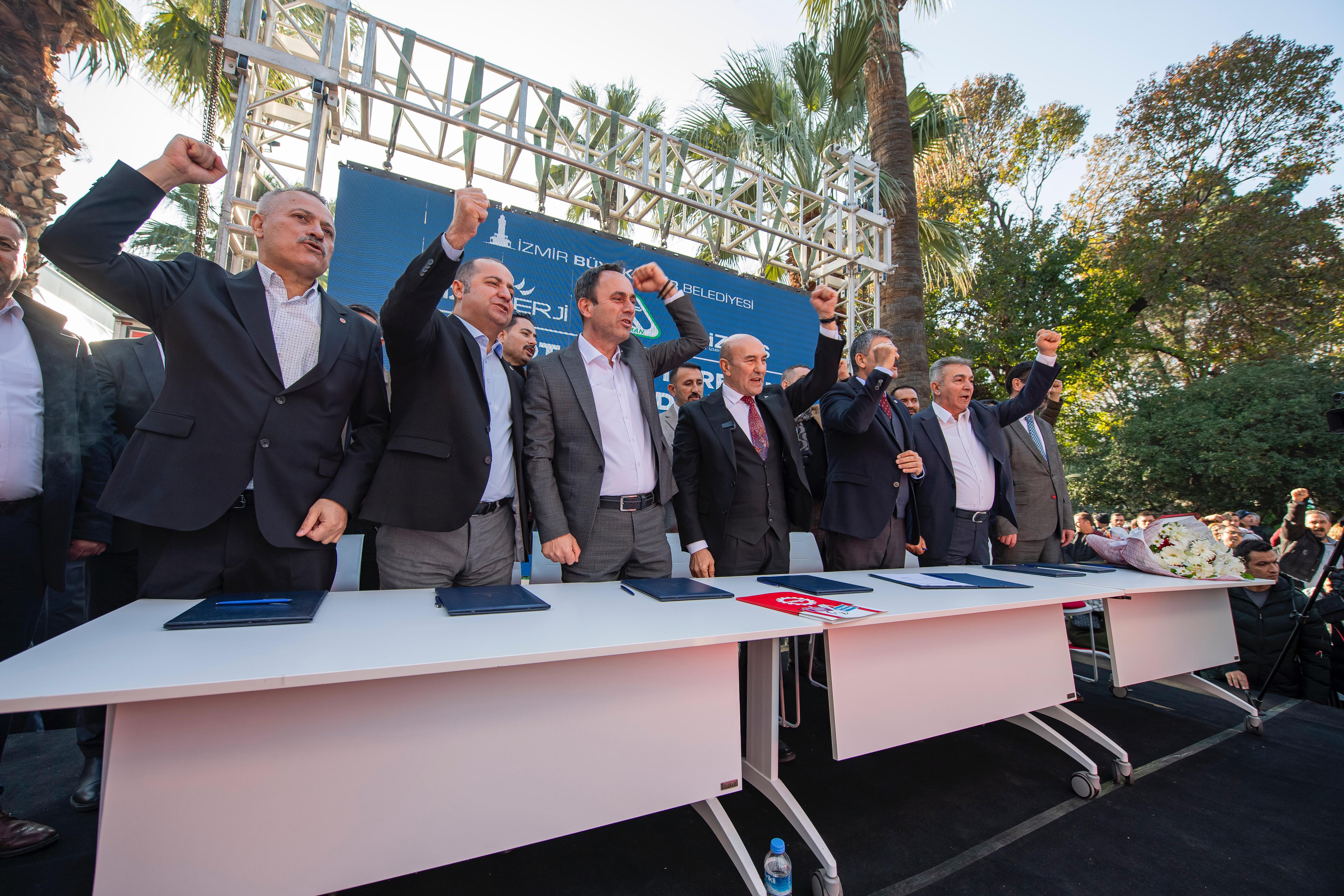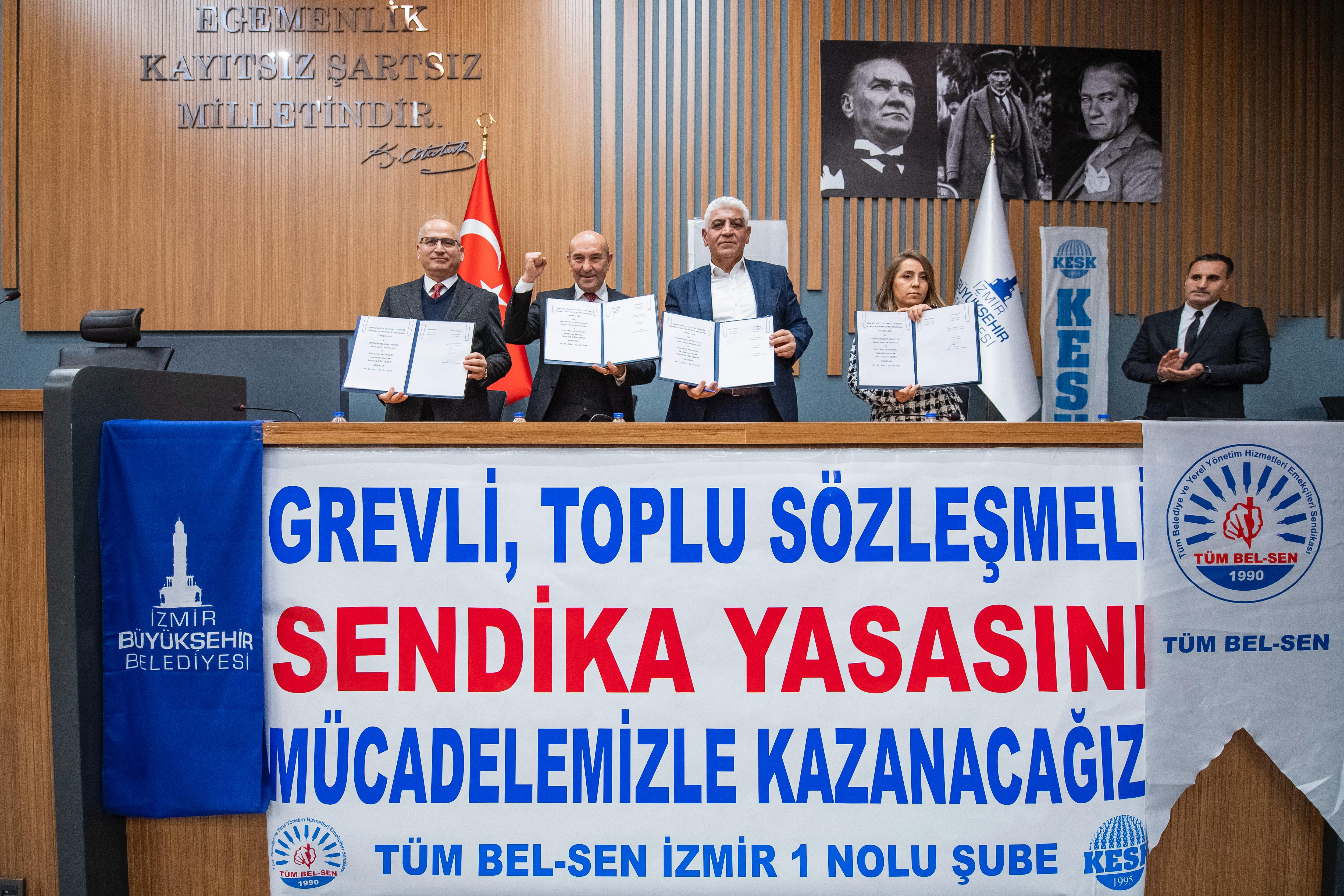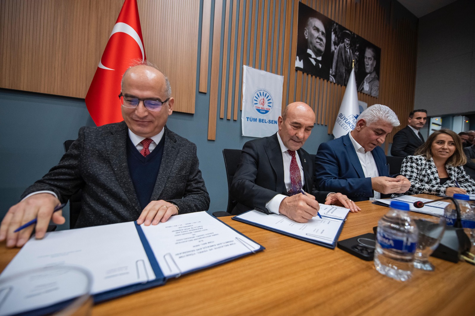 İzmir Büyükşehir Belediye Başkanı Tunç Soyer önce 6 bin 114 kamu çalışanını ilgilendiren toplu sözleşmeyi ardından İZELMAN, İZENERJİ, İZFAŞ bünyesinde çalışan 19 bin 855 işçiyi ilgilendiren ücretleri iyileştirmeye yönelik ek protokolü imzaladı.