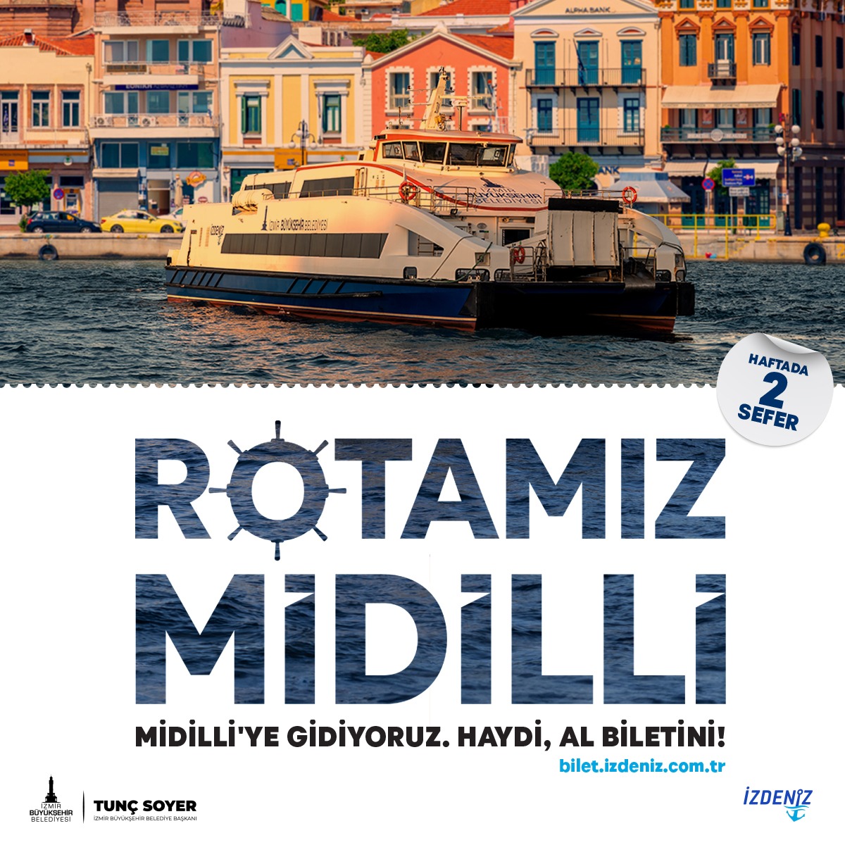 İzmir Büyükşehir Belediye Başkanı Tunç Soyer’in kent ve ülke turizmini deniz turizmiyle artırma hedefi doğrultusunda başlatılan İzmir-Midilli seferleri, 3 Mayıs’ta başlıyor. İzmir Büyükşehir Belediyesi’ne bağlı İZDENİZ (İzmir Deniz İşletmeciliği A.Ş.) tarafından yapılan seferler, 2022 yılından beri İzmir ile Ege Adaları arasında kurduğu deniz köprüsünü bu yıl sefer sıklığını artırarak daha da güçlendirecek. Bu yıl Avrupa Birliği Komisyonu tarafından onaylanmasının ardından Türk turistlere Yunan adalarında bir hafta vize uygulamasına istinaden vatandaşların talebini karşılamak için İzmir-Midilli Seferleri Çarşamba ve Cuma kalkışlı olmak üzere haftada iki sefer olarak düzenlenecek. Kapı vizesinin 7 gün için geçerli olacak olması ve yolcunun Midilli Adası’nda daha çok zaman geçirebilmesini sağlamak amacıyla seferler 2 gün süreli şekilde planlandı. Talepler doğrultusunda günübirlik veya bir gün süreli ek seferler de yapılabilecek.
