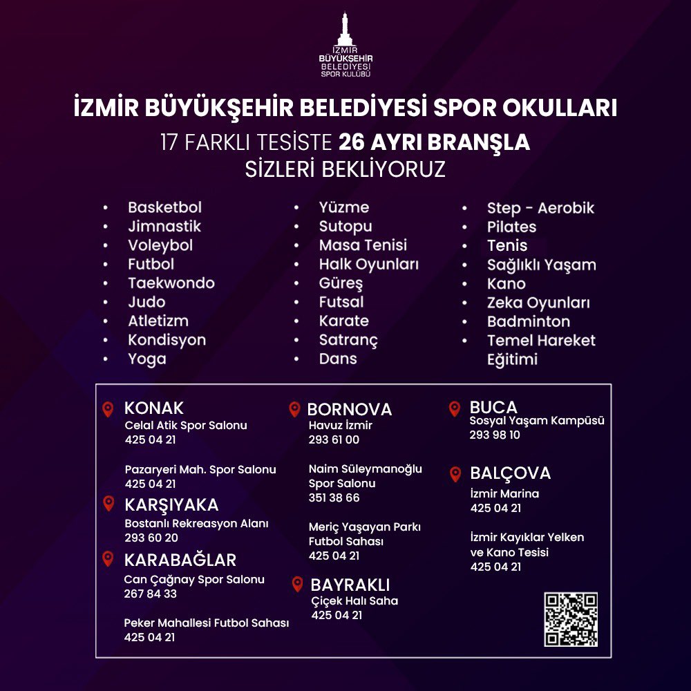 İzmirliler 24 Haziran’da başlayacak spor eğitimlerine Kültürpark’taki Celal Atik Spor Salonu, Konak Pazaryeri Mahallesi Spor Sahası, Bornova Naim Süleymanoğlu Spor Salonu, Bornova Aşık Veysel Rekreasyon Alanı, Bornova Meriç Yaşayan Parkı Futbol Sahası, Bornova Havuz İzmir, Buca Sosyal Yaşam Kampüsü, Karabağlar Can Çağnay Spor Salonu, Karabağlar Peker Mahallesi Futbol Sahası, Balçova İzmir Kayıkları Yelken ve Kano Tesisi, İzmir Marina, Bayraklı Çiçek Halı Saha, Bayraklı Ahmet Taner Kışlalı Parkı, Bostanlı Rekreasyon Alanı, Beydağ Spor Salonu, Bayındır Çırpı Çok Amaçlı Spor Salonu, Foça Bağarası Spor Salonu’nda katılabilecek.