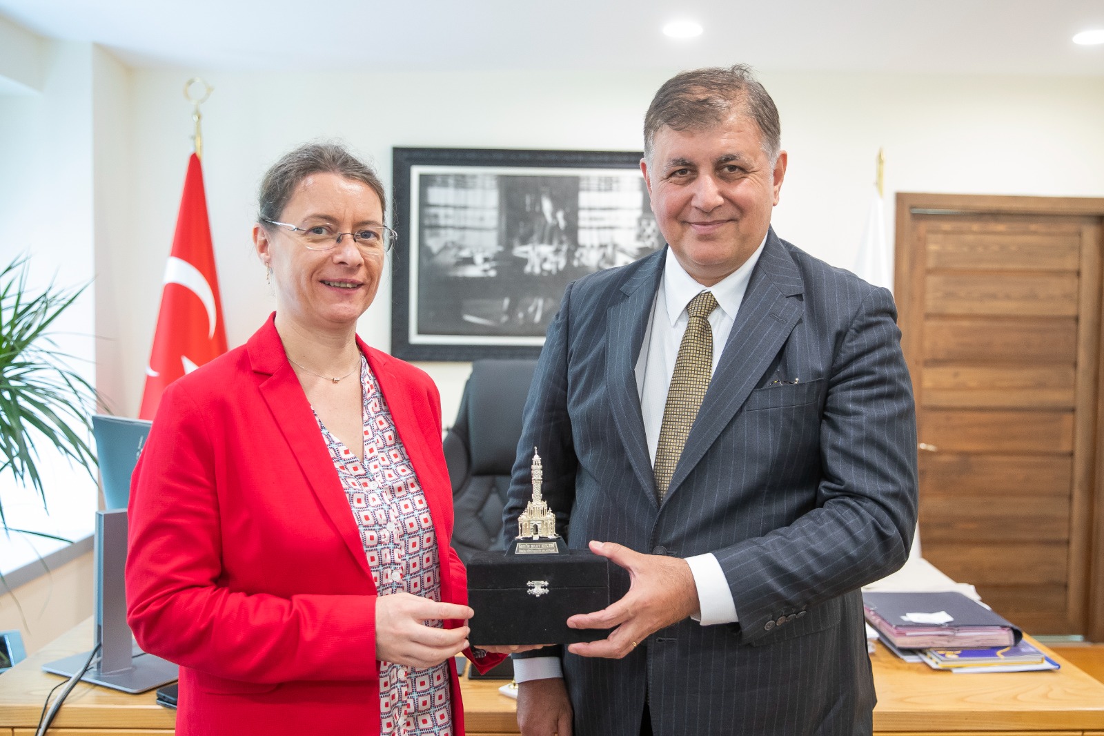 Fransa Büyükelçisi Isabelle Dumont, İzmir Büyükşehir Belediye Başkanı Dr. Cemil Tugay’ı ziyaret etti. Karşılıklı iş birliklerinin konuşulduğu toplantıda Fransa’nın İstanbul Başkonsolosu Olivier Gauvin, İzmir Fahri Konsolosu Bernard Arkas ile beraberindeki heyet, İzmir Büyükşehir Belediyesi Genel Sekreteri Barış Karcı, İzmir Büyükşehir Belediyesi Genel Sekreter Yardımcısı Şükran Nurlu, İZSU Genel Müdürü Gürkan Erdoğan ve bürokratlar da yer aldı.