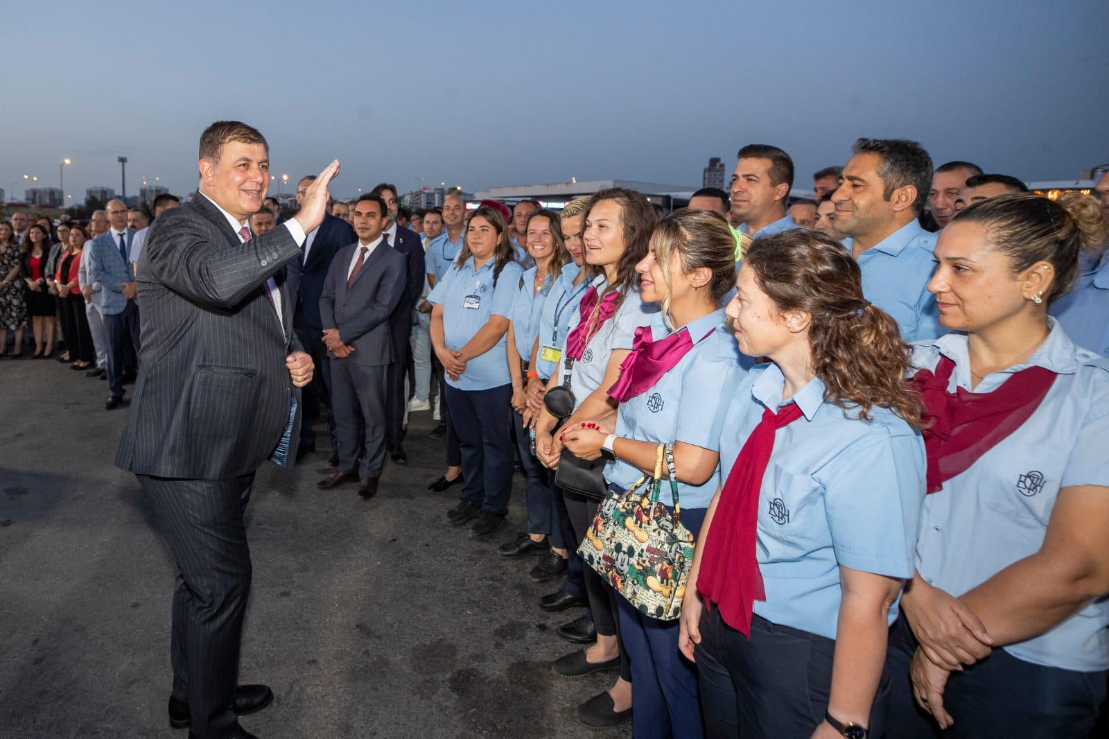 İzmir Büyükşehir Belediye Başkanı Dr. Cemil Tugay, “Sizleri gördüğümde her zaman mutlu oluyorum. Hep beraber hem bir görevi yerine getirmeye, aslında zor olan da bir şeyleri başarmaya çalışıyoruz. İçinde bulunduğumuz şartlar zaman zaman hepimizi çok yoruyor, zaman zaman zorluyor. Ne olursa olsun bu bizim işimiz, bu şehir bizim şehrimiz, bu ülke bizim ülkemiz. Sonuna kadar sahip çıkmaya, mücadele etmeye devam edeceğiz. Benim görev aldığım dönemde, benimle beraber sorumluluk alan arkadaşlarımla hep beraber hem şehrimize daha iyi hizmet etmek için, hem de sizlerin hakkını hukukunu savunmak ve daha iyi şartlarda çalışmanız için sonuna kadar mücadele etmekten vazgeçmeyeceğiz. Her geçen gün daha iyiye gittiğimizi gözlüyorum, buna sizin de inancınız tam olsun. Yüreğiniz ferah olsun, güzel bir bayram geçirin. Ailelerinizin sevdiklerinizin kıymetini bilin. Onlarla birlikte güzel vakit geçirmeye çalışın. Bizim de burada hep beraber kocaman bir aile olduğumuzu, güzel bir kaderi hep beraber paylaşacağımızı lütfen unutmayın. Sizleri seviyorum, bayramınız kutlu olsun” diye konuştu.