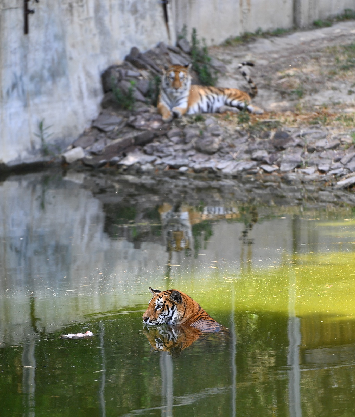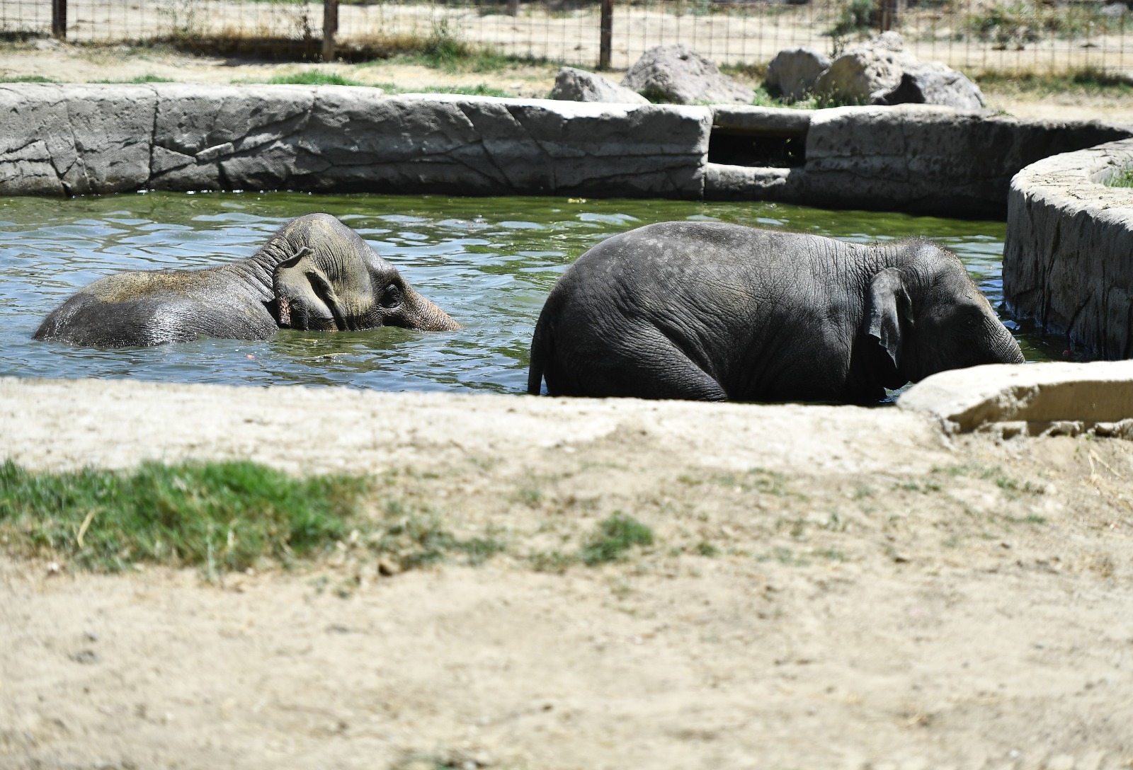 Park sakinlerinden kimileri gölgelik alanda vakit geçirirken bazıları ise havuzlarda serinliyor. Fil ailesi de sıcak havalarda havuzu tercih ediyor. Havuzdan hortumlarıyla aldıkları suyu vücutlarına serpen filler, böylece yüksek sıcaklıklardan kendilerini koruyor.