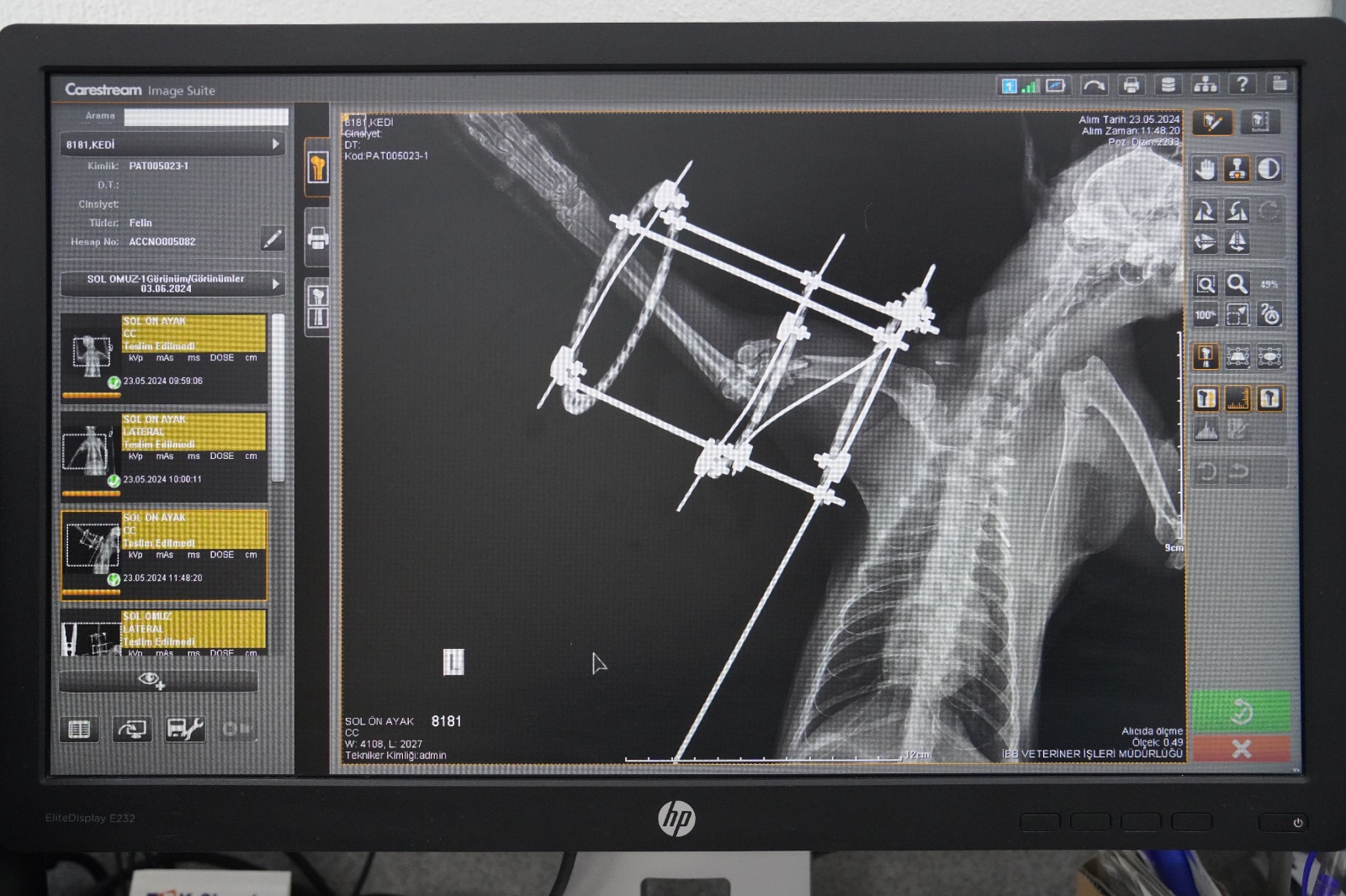 Ameliyat hakkında bilgi veren Veteriner Hekim Mehmet Uysal, ortopedi biriminde kedinin bacağının durumunu tespit ettiklerini belirterek, “Bacağının ciddi şekilde parçalandığını gördük. Burada sağlığına kavuşması için hemen gerekli cerrahi tedaviyi uyguladık. Bacağında parçalanan kemikleri özel bir aparatla sabitledik. Güvenli bir yöntem olduğu için bunu tercih ettik. Kedimiz 25 gündür bu şekilde tedavi altında. Bir süre sonra bu taktığımız aparatın kırıklar üzerindeki etkisine bakacağız. Bacak iyileşmiş olursa çıkaracağız. Şu anda sağlığı ile alakalı bir problemi yok. Keyfi yerinde. Bacağını nasıl kullanacağını öğreniyor diyebilirim” diye konuştu.