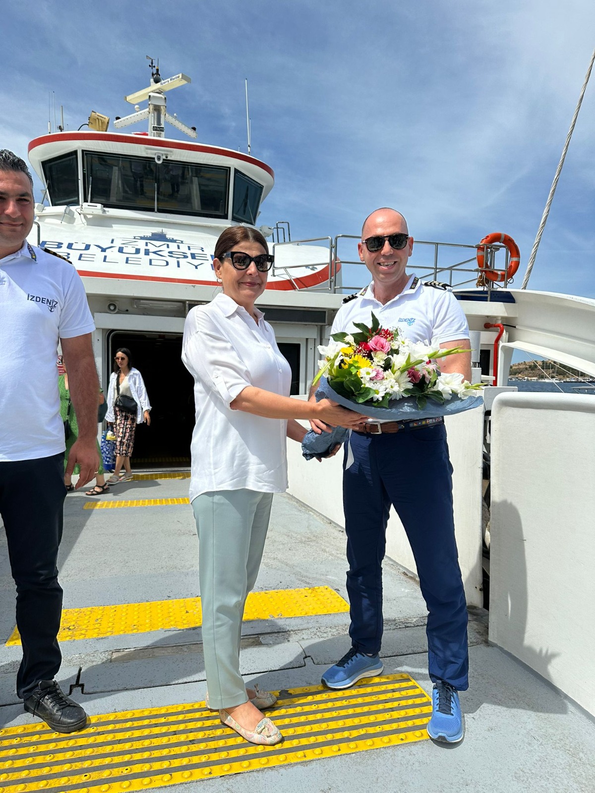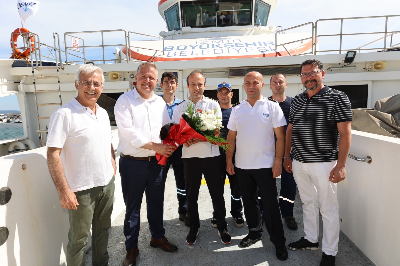 Sabah saatlerinde ilçelerine gelen yolcuları iskelelerde karşılayan Güzelbahçe Belediye Başkanı Mustafa Günay, Foça Belediye Başkanı Saniye Bora Fıçı ve Urla Belediye Başkanı Selçuk Balkan, gemi kaptanlarına ve İzdeniz A.Ş Yönetim Kurulu Başkanı Dr. Işıkhan Güler’e çiçek takdim etti.