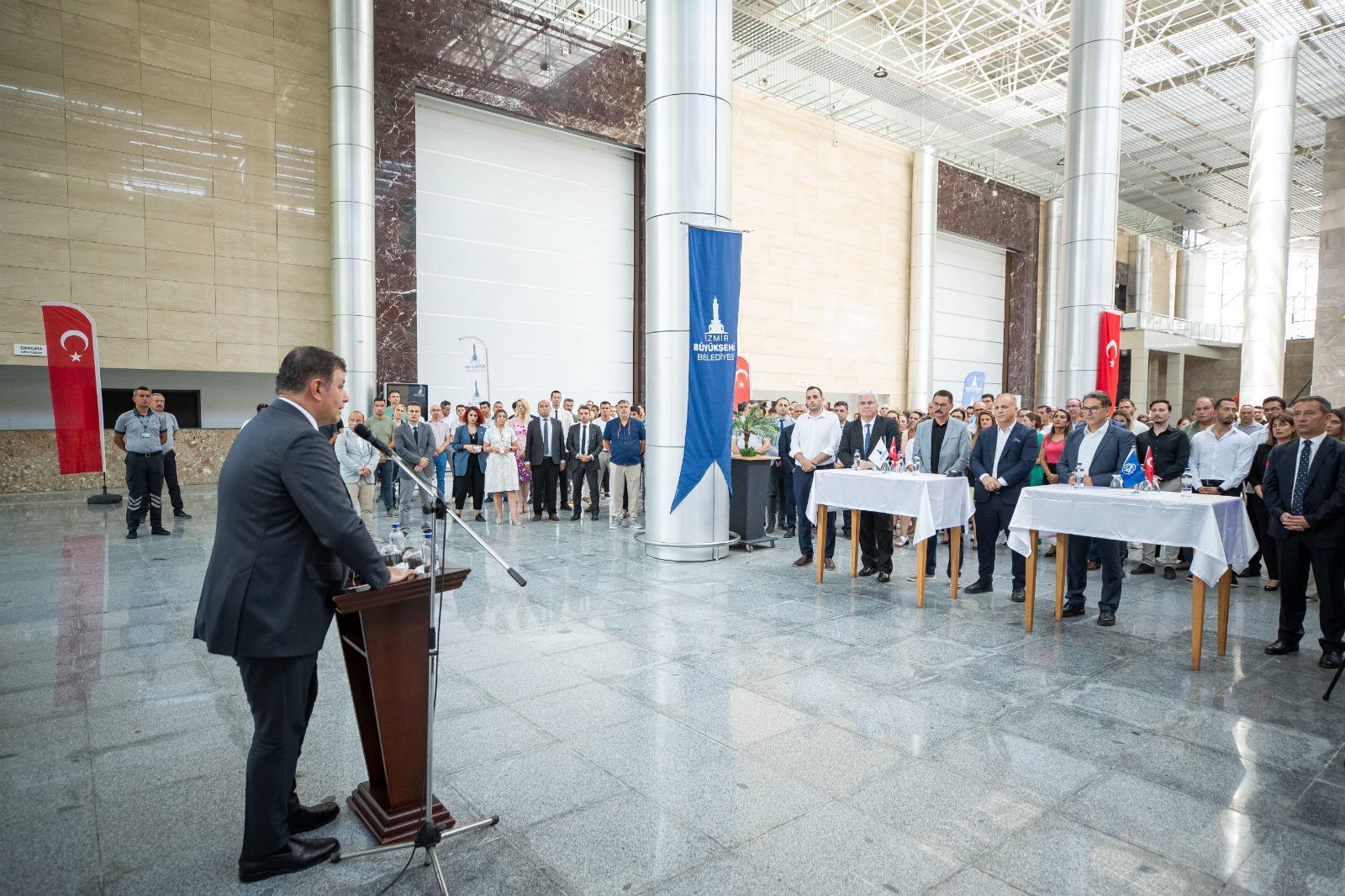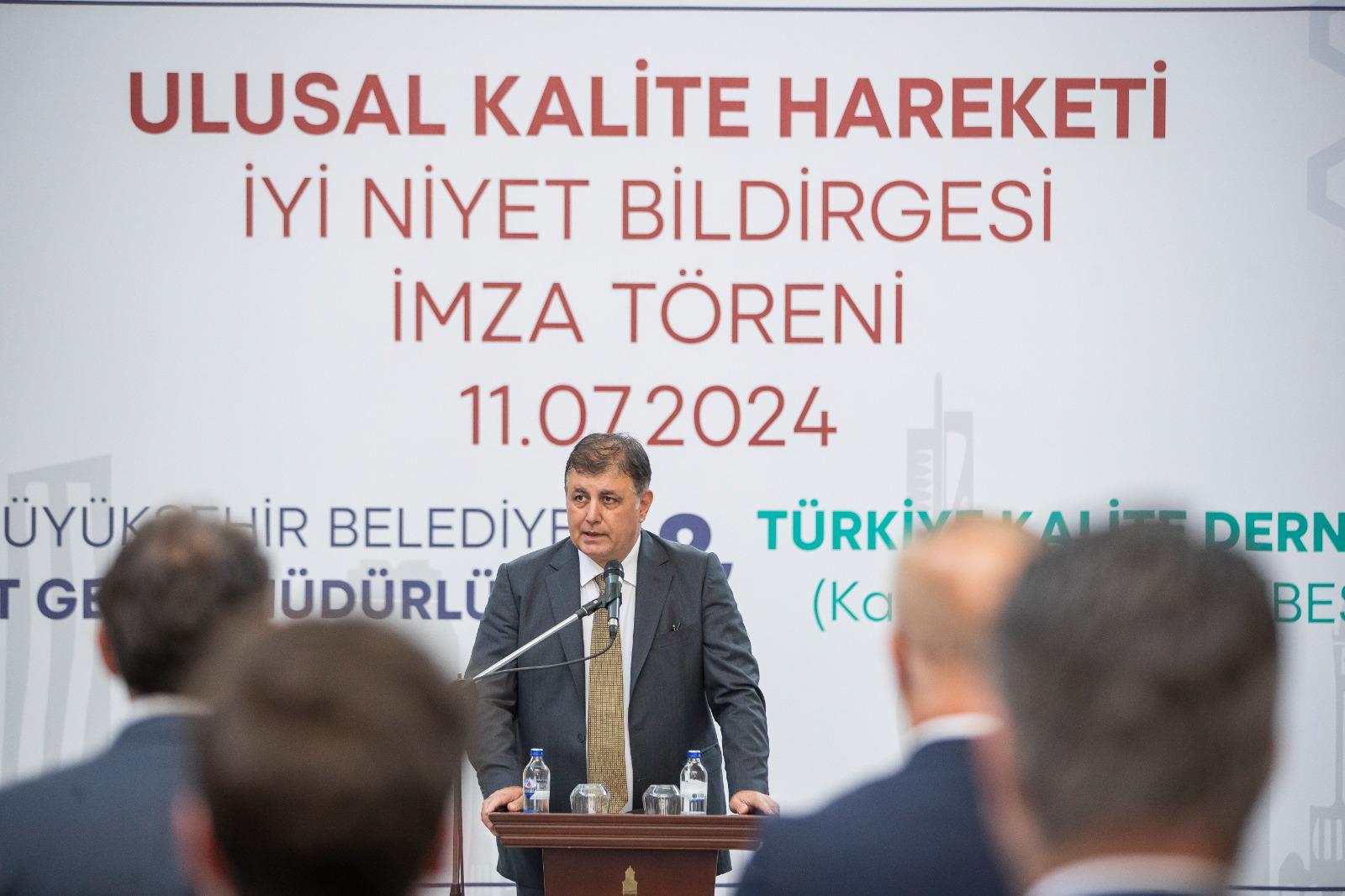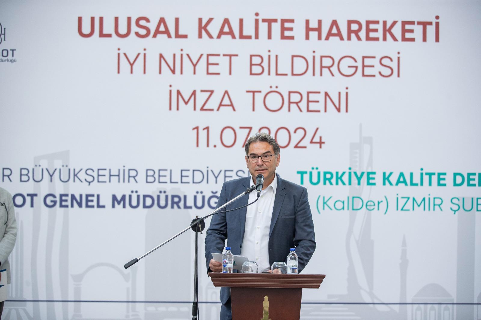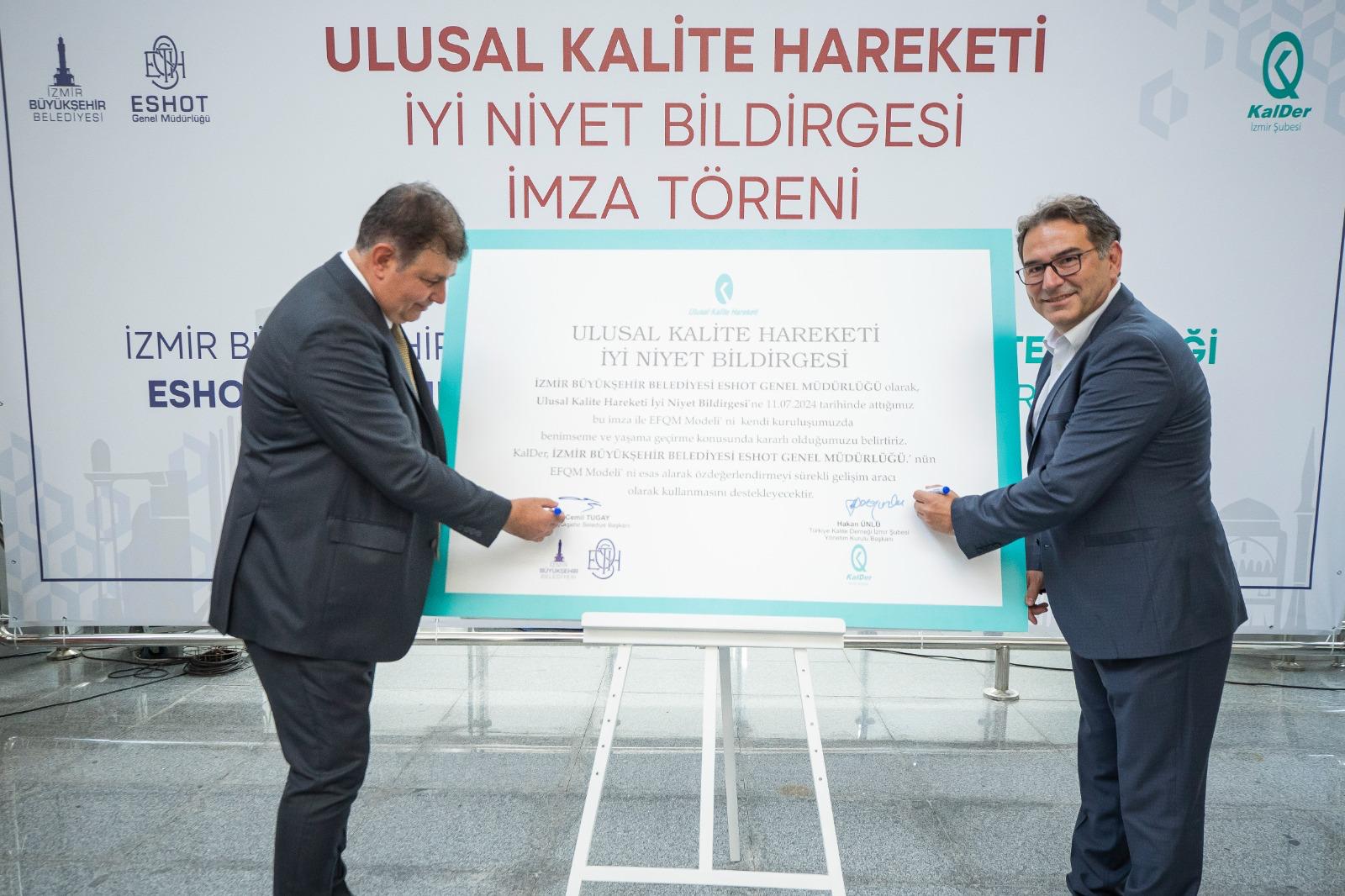 İzmir Büyükşehir Belediyesi, toplu taşımanın can damarlarından ESHOT Genel Müdürlüğü’nün verimliliğini artırma, toplu ulaşım konforunu yükseltme, kurumun ve çalışanların çağın koşullarına göre yenilenip gelişmesini sağlama hedefiyle Türkiye Kalite Derneği (KalDer) İzmir Şubesi ile Ulusal Kalite Hareketi İyi Niyet Bildirgesi’ni imzaladı. Fuar İzmir C Holü Fuaye Alanı’nda düzenlenen törene, İzmir Büyükşehir Belediye Başkanı Dr. Cemil Tugay ile KalDer İzmir Şubesi Yönetim Kurulu Başkanı Hakan Ünlü, İzmir Büyükşehir Belediyesi Genel Sekreteri Barış Karcı, ESHOT Genel Müdürü Turgay Bozoğlu, İZFAŞ Genel Müdürü Canan Karaosmanoğlu Alıcı ile belediye bürokratları ve kurum çalışanları katıldı.