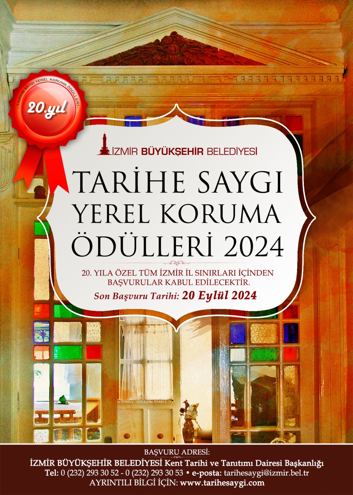 İzmir Büyükşehir Belediyesi'nin kentteki tarihi yapıların korunması, onarılması, kentsel ve yerel bilincin oluşturulması amacıyla düzenlediği Tarihe Saygı Yerel Koruma Ödülleri, bu yıl 20. kez sahiplerini bulacak. Tarihi mirasa sahip çıkan, koruyarak yaşatan ve bu alanda katkısı, emeği bulunan İzmir ile ilgili tüm çalışmalara açık yarışma için “Tarihi Yapıda Yaşam”, “Tarihi Mekânda Geleneksel Zanaatların Yaşatılması", “Basit Onarım”, “Özgün İşlevin Değiştirildiği Esaslı Onarım”, “Özgün İşlevin Korunduğu Esaslı Onarım”, “Emek”, “Tarihi Çevre ve Kültür Varlıklarını Koruma Dalında Katkı” ve “Tarihine Sahip Çıkan Eğitim Projelerinin Onurlandırılması” kategorilerinde başvurular kabul edilecek.