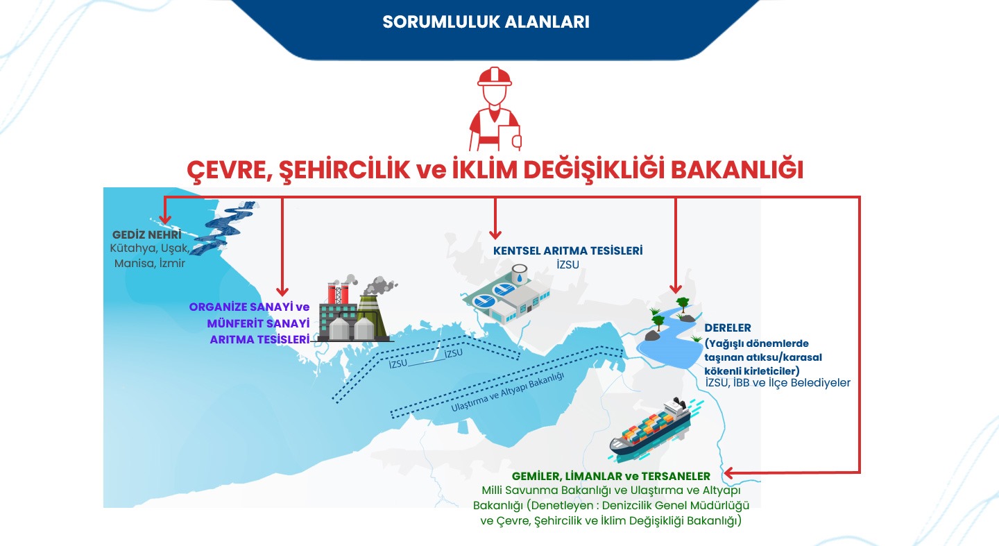 2000 yılında yapılan kanunlar ve yönetmeliklerden sonra denizler ve iç denizlerdeki görev ve sorumlulukların Çevre, Şehircilik ve İklim Değişikliği Bakanlığı, Tarım ve Orman Bakanlığı ve Ulaştırma ve Altyapı Bakanlığı’nın olduğunu belirten Başkan Tugay, şöyle konuştu: “Bunu bahane olarak ya da sorumluluğu yıkmak için söylemiyorum ama mevzuatı herkesin bilmesi lazım. Büyükşehir ve İZSU, Körfez konusunda icracı olamıyor. He ne kadar Büyükşehir ve İZSU acil durum ilanı ile bu soruna görünür şekilde müdahale etmiş olsa da gerçekte yetkileri yok. İç Körfez’de milyonlarca ton çamur birikmiş durumda. Bu çamuru almak istesek bizim 50 bin metreküpe kadar temizlik yetkimiz var. Körfez’de su akımını geliştirecek sirkülasyon kanalı gibi konuların yetkisi bakanlığa ait. Kirletici unsur olan organize sanayi ve münferit sanayi atıklarını arıtan tesislerin yer yer yaşadığı problemlerle ilgili olarak tüm yetki Çevre, Şehircilik ve İklim Değişikliği Bakanlığı’nda. Gözlem dışında hiçbir yetki sahibi değiliz. Buralardan kaynaklı kirlilik olduğuna da neredeyse eminiz.”