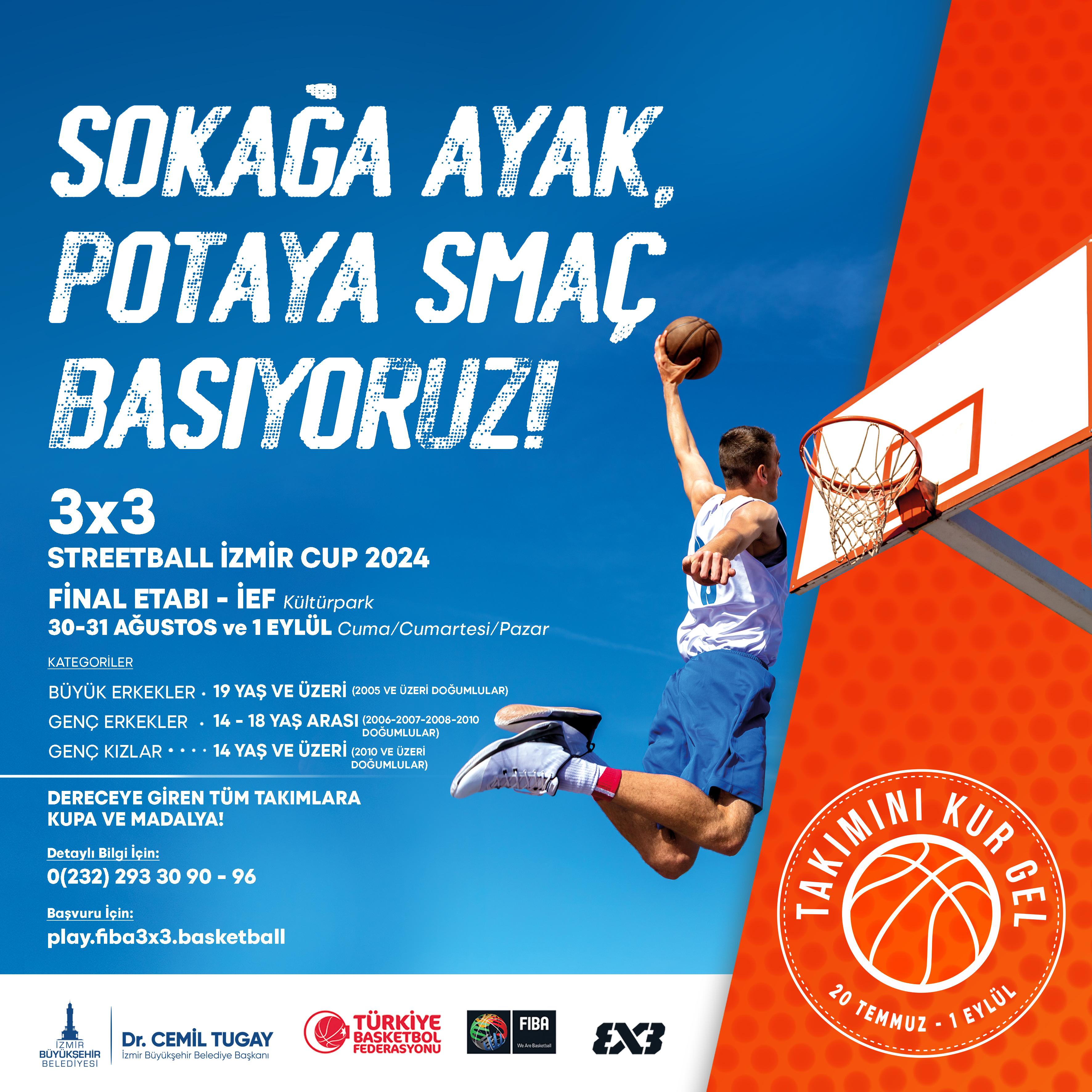 İzmir Büyükşehir Belediyesi, 30 Ağustos Zafer Bayramı kutlamaları kapsamında voleybol, basketbol ve futbol branşlarında turnuvalar düzenliyor. 27-28-29 Ağustos tarihlerinde U-17 Kadın Voleybol ve U-15 Kadın Futbol takımları, kendi branşlarında mücadele ediyor. 3x3 Streetball İzmir Cup 2024 sokak basketbolu turnuvasında Bornova, Buca, Göztepe ve Karşıyaka’da düzenlenen etaplarda Büyük Final’e katılmaya hak kazananlar, finalist olmak için 30 Ağustos Zafer Bayramı’nda ve 31 Ağustos’ta sahaya çıkacak. Şampiyon, 1 Eylül’deki final maçında belli olacak. 93’üncü İzmir Enternasyonal Fuarı’nın bir parçası olarak Kültürpark’ta yapılacak Büyük Final maçları, her gün 16.00-22.00 saatleri arasında oynanacak.