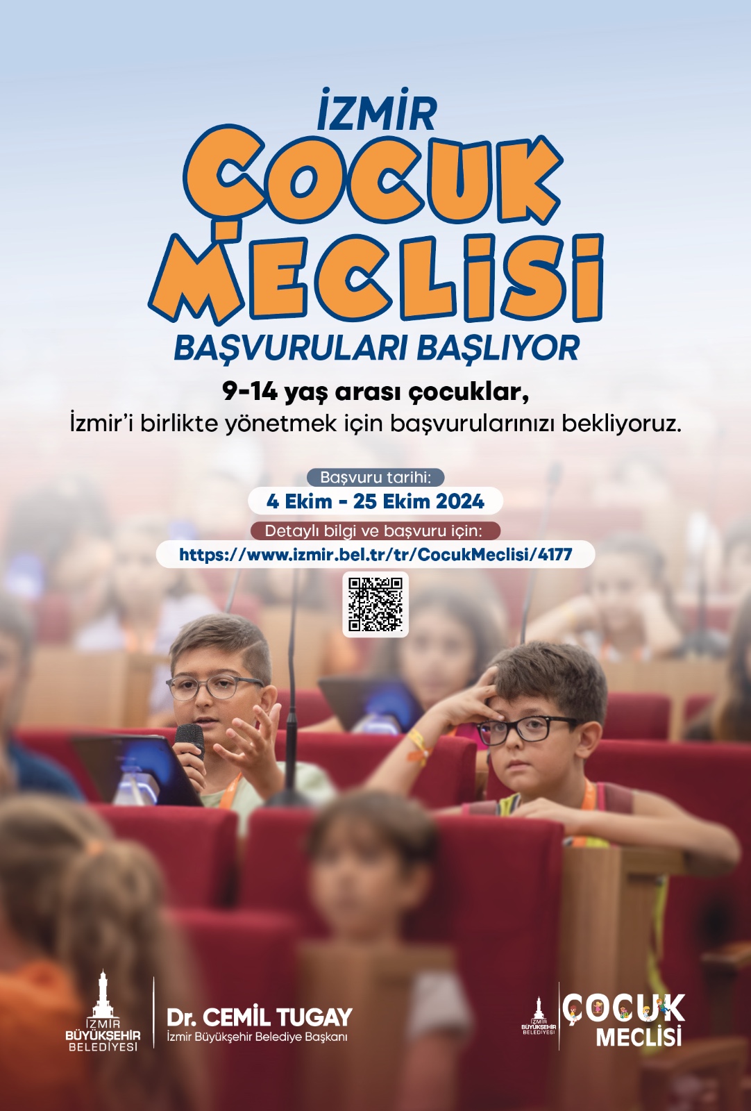 İzmir Büyükşehir Belediyesi Sosyal Hizmetler Dairesi Başkanlığı Çocuk Çalışmaları Şube Müdürlüğü tarafından sürdürülen çalışmalar kapsamında, İzmir Çocuk Meclisi’nin yeni dönem başvuruları 4 Ekim’de başlıyor. İzmir’de yaşayan 9-14 yaş arası tüm çocuklar, 4-25 Ekim tarihleri arasında, https://www.izmir.bel.tr/ ve https://www.bizizmir.com/ internet sitelerinde yer alan başvuru formunu doldurarak veya kentin çeşitli noktalarında yer alan duyuru afişlerindeki QR kodu okutarak başvurularını gerçekleştirebilecek. İnternet erişimi olmayan çocuklar İzmir’in çeşitli noktalarında faaliyet gösteren İzmir Çocuk Merkezlerinden başvuru formuna erişebilecek.